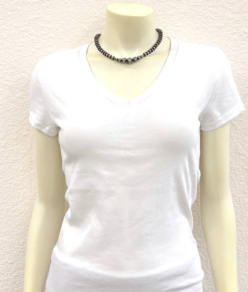 Add a unique touch to your style with our Handmade Navajo Bead Necklace! This 15" long necklace (plus a 5" extender) features a thin 8mm navajo pearl surrounded by 6mm, 8mm, 10mm, and 12mm round navajo beads. Weighing 18 grams, it's nickel, lead, and chrome free for a worry-free wear.