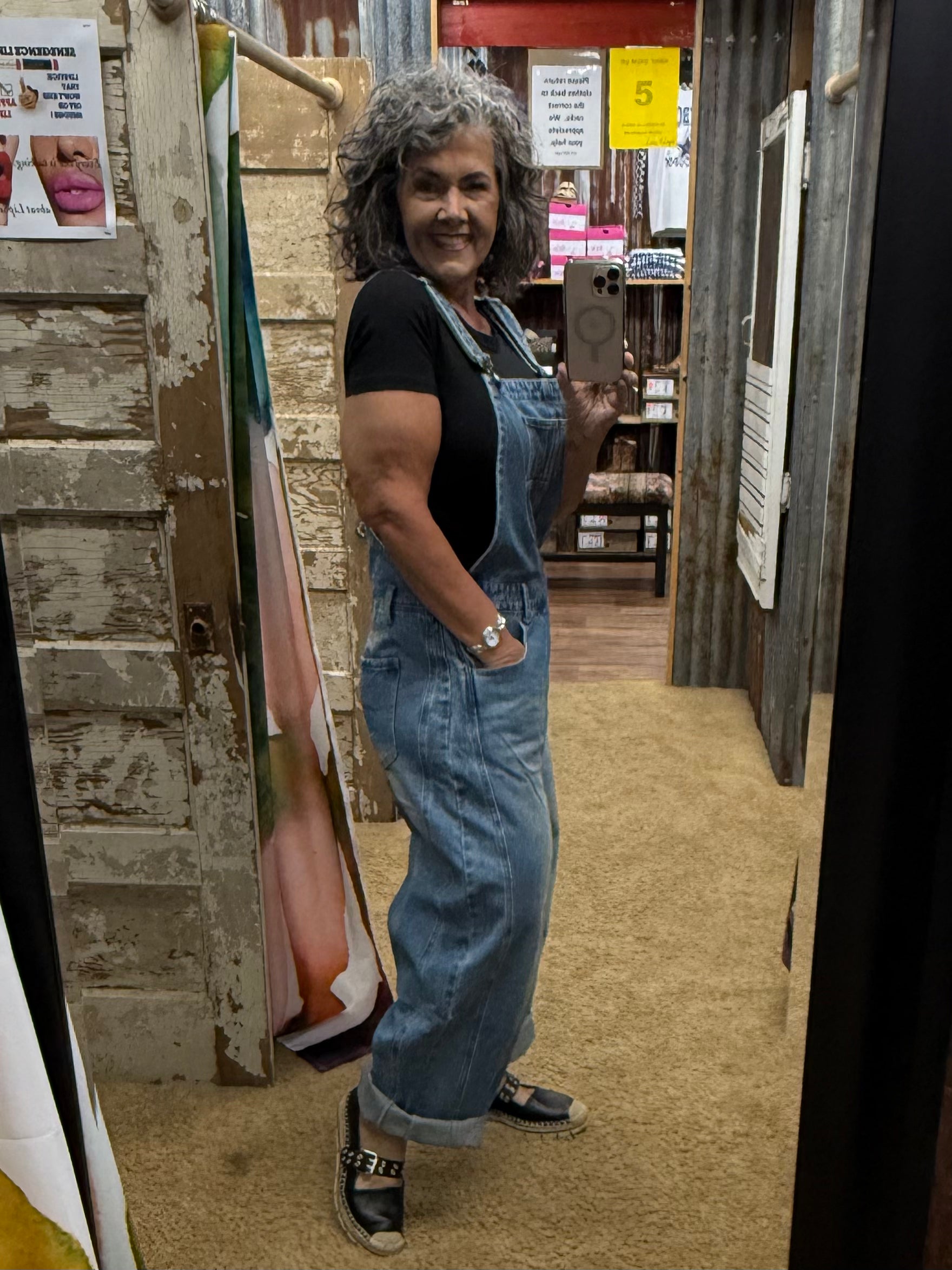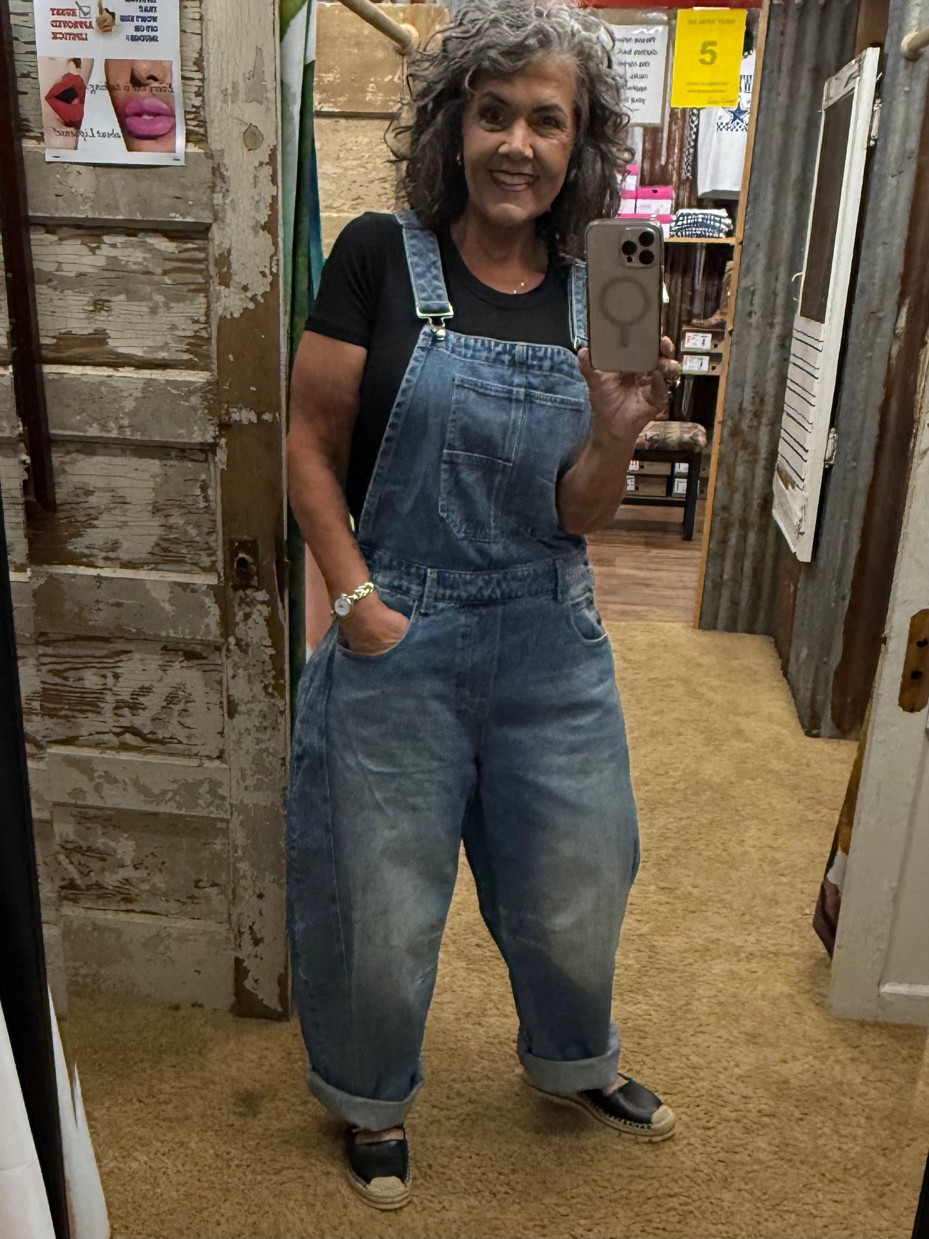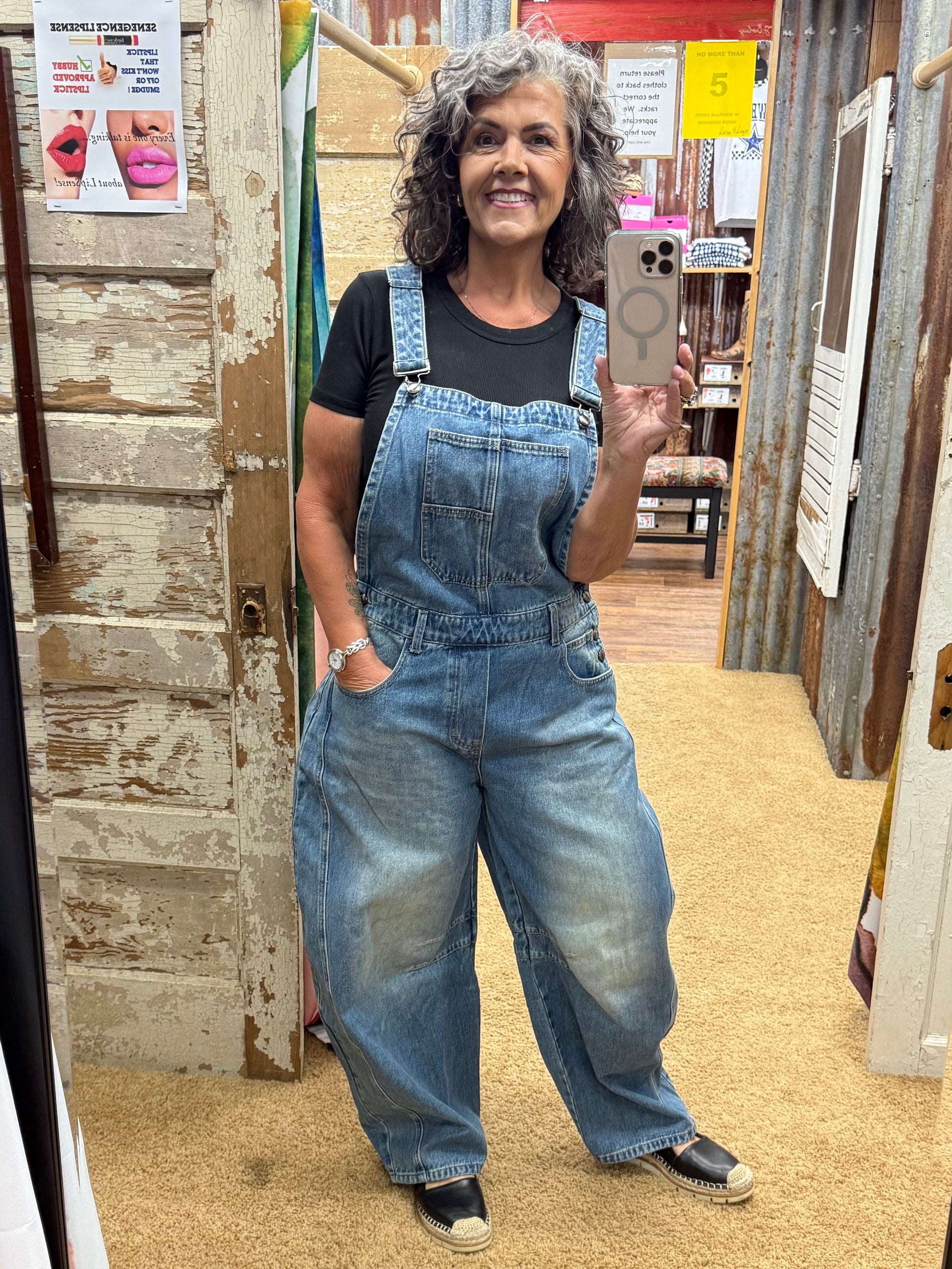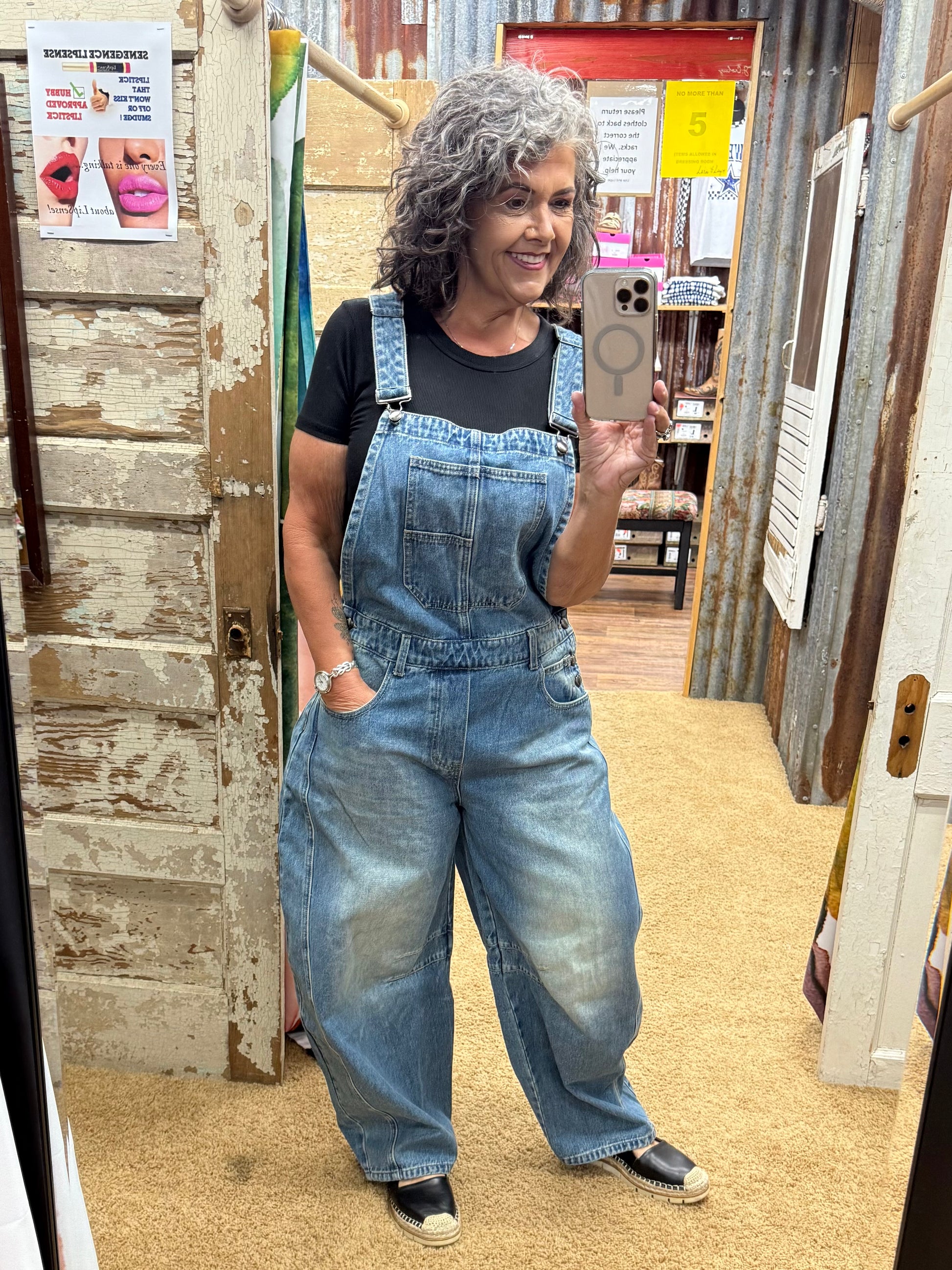 Relaxed fit with a wide-leg silhouette for a casual yet stylish look - Adjustable shoulder straps with metal buckles for a customizable fit - Classic bib front with a large chest pocket for functionality and style - Multiple pockets, including side and back pockets, for added convenience - Vintage-inspired faded wash for a laid-back, worn-in aesthetic - Cross-back strap design for a unique and structured appearance - Button closures on the sides for easy wear and a secure fit - Durable denim fabric that offers both comfort and longevity - Model is 5' 7.5" 33-24-34 and wearing a size Small A perfect blend of vintage charm and modern utility, these barrel jean overalls provide a relaxed yet structured fit, making them a versatile addition to any wardrobe.