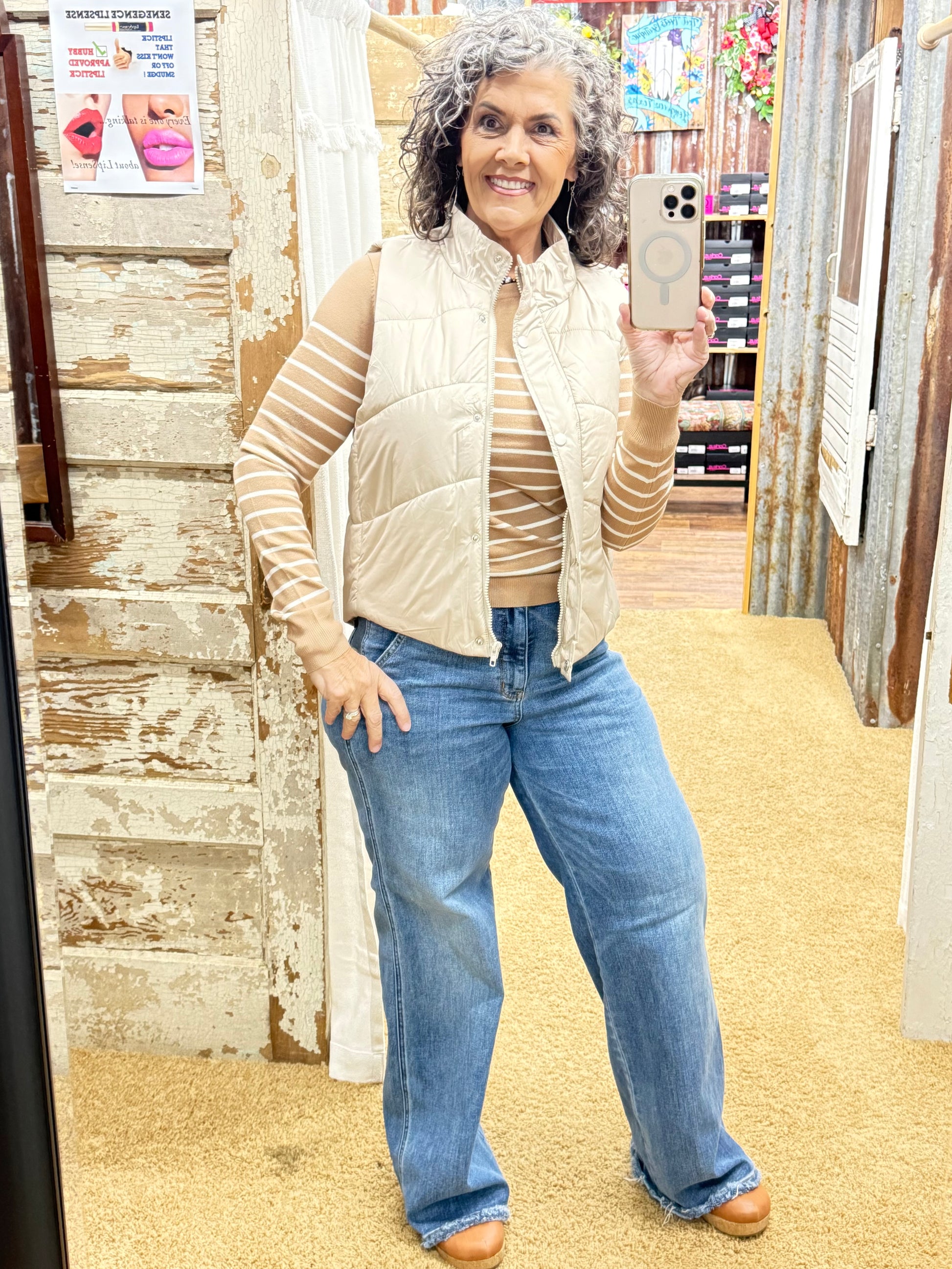 Stay cozy and stylish with this beige puffer vest featuring a polar collar and a hidden snap zip-up front. Designed with convenient side pockets, it’s perfect for keeping your hands warm or stashing essentials. Lightweight yet warm, this vest adds playful flair to any outfit while keeping you snug on chilly days.