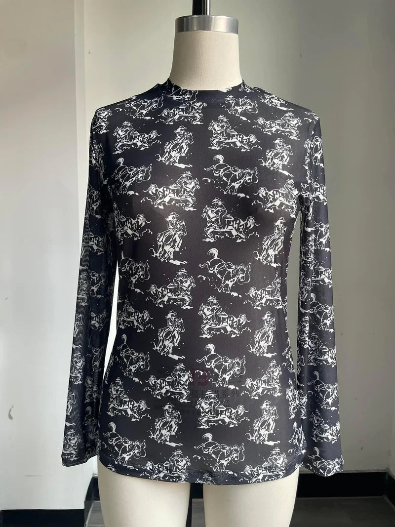 BLACK AND WHITE COWGIRL MESH TOP