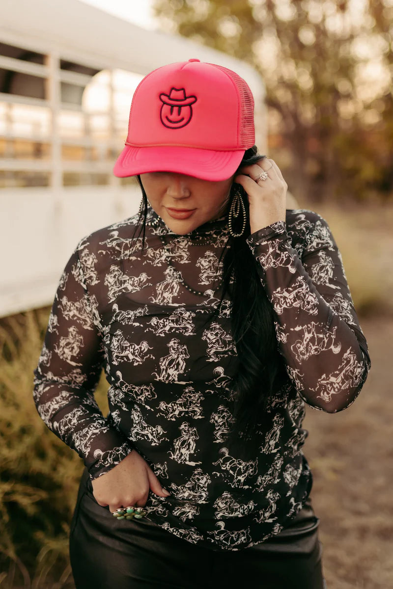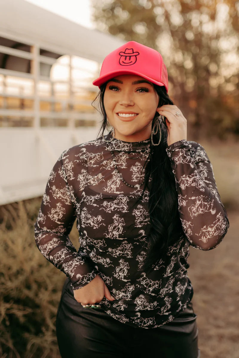 Yeehaw! This top ain't messing around! Featuring a cute cowgirl print in black and white and the softest mesh fabric, this top is perfect for layering or showing off on its own. With true to size fit and stretch, it's a must-have addition to your wardrobe.