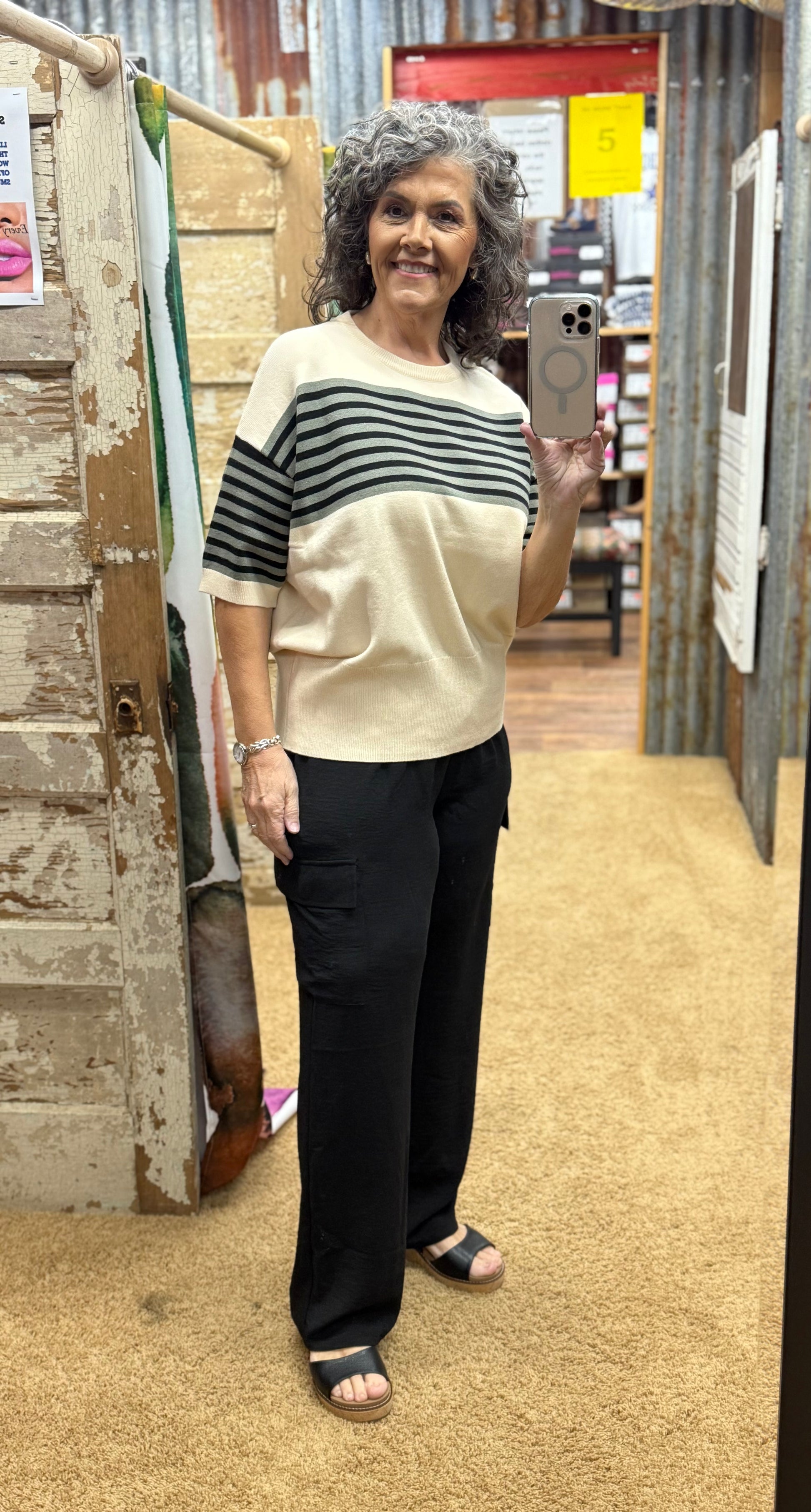 Just like magic, these pants effortlessly pull on with their elastic waist and tie front. Plus, they come equipped with functioning cargo pockets on the sides for all your essentials. Keep it casual and stay stylish in black.
