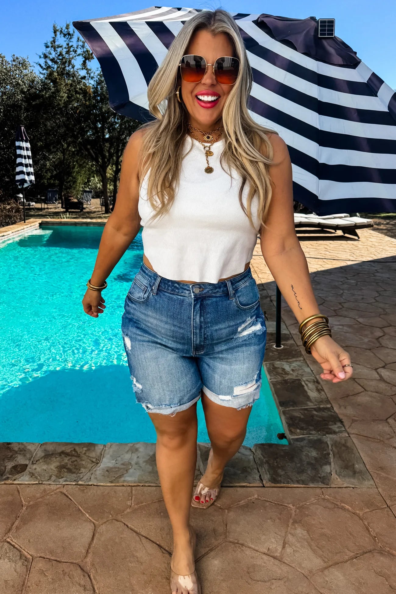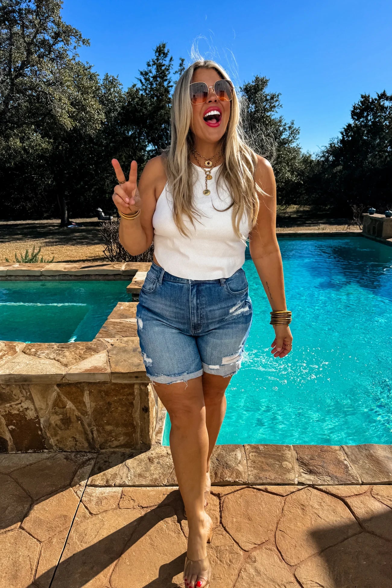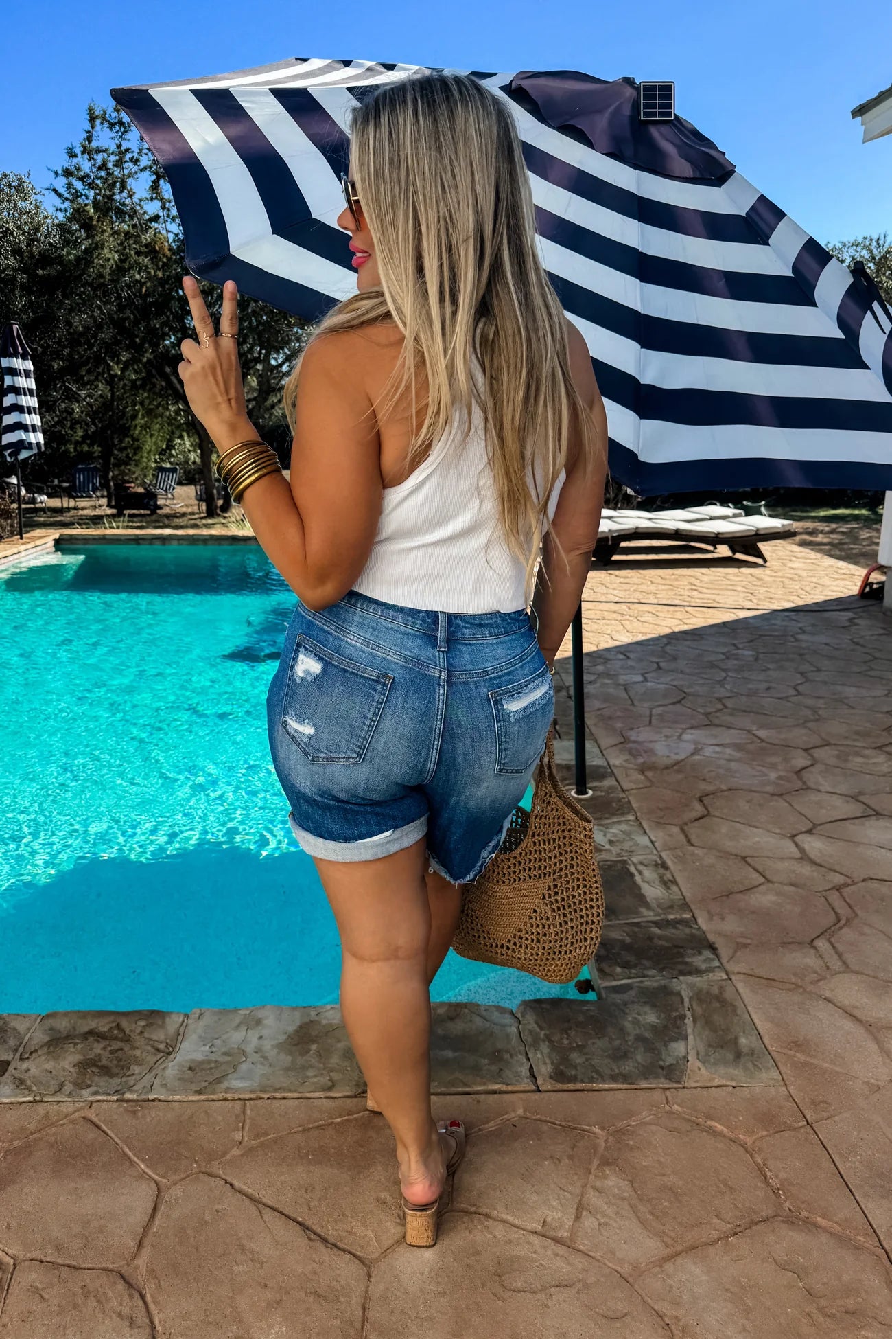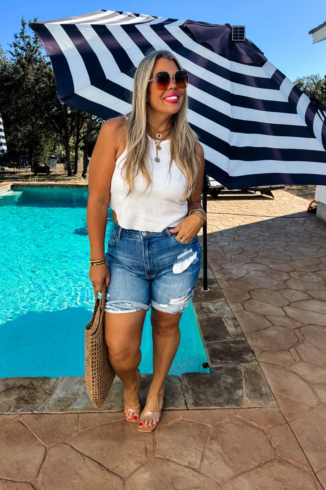 Introducing our BLAKELEY GEORGIA DISTRESSED SHORTS! Made with high-quality denim, these mid/high rise shorts offer a trendy and playful look with a rolled up hem (stitched to stay rolled). Crafted for a very stretchy fit and available in multiple sizes, these shorts are a must-have for your warmer weather wardrobe.