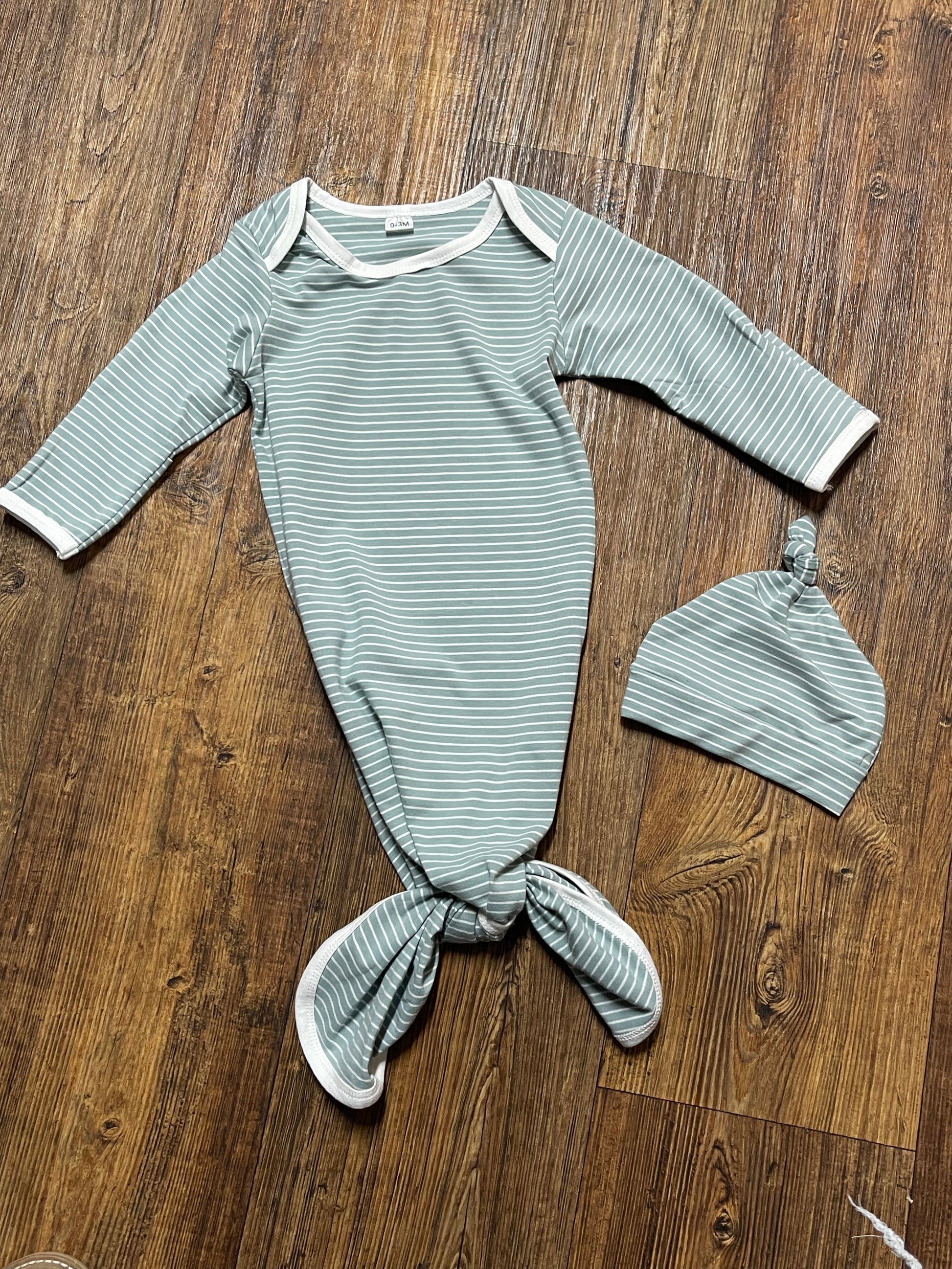 Get your little one feeling comfy and looking stylish with our Blue Striped Gown and matching hat. Perfect for playtime or naptime, this baby gown features a playful blue stripe pattern. Keep your little one snug and fashionable with this adorable set!