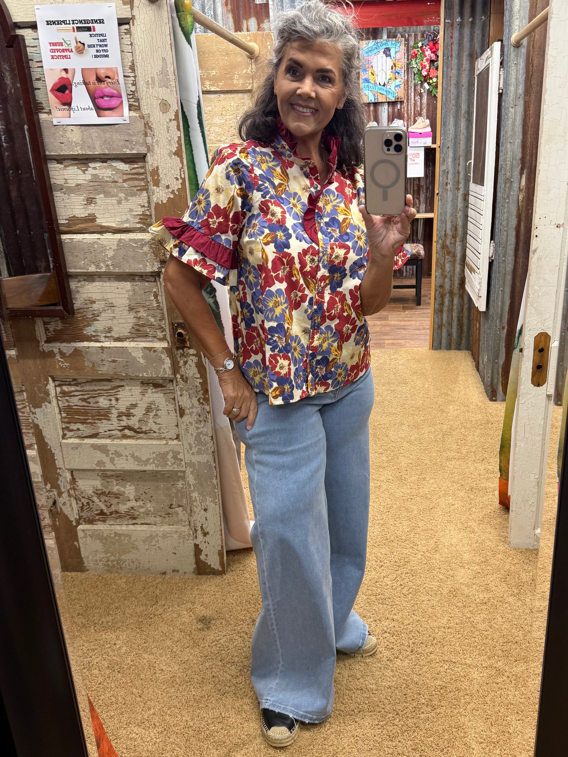 This playful Burgundy Floral Entro Blouse brings a fresh twist to your wardrobe with its charming floral print and flirty ruffle finish. The short sleeves and contrast accent ruffle detail add a fun, feminine touch, while the button-front closure keeps it easy and breezy. Crafted from lightweight woven fabric, this unlined, non-sheer top is perfect for staying cool and stylish all day long.