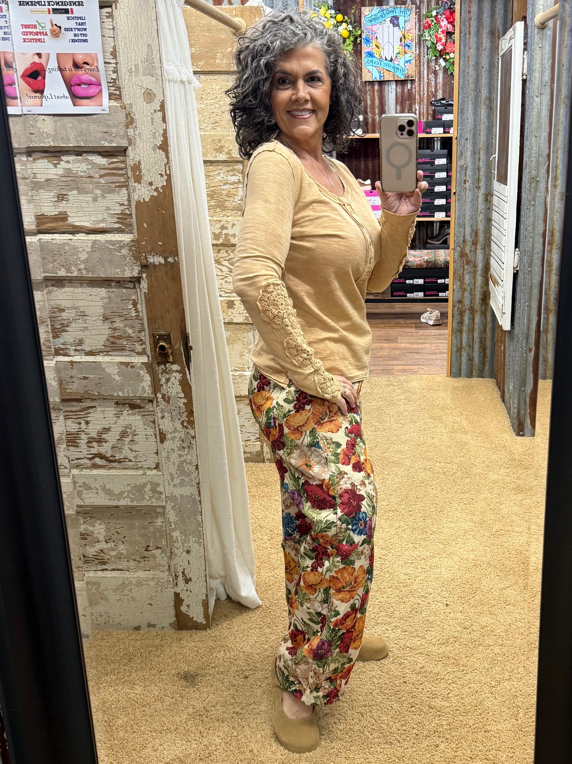 CAMEL CROCHET LACE DETAILING WASHED COTTON SLUB TOP