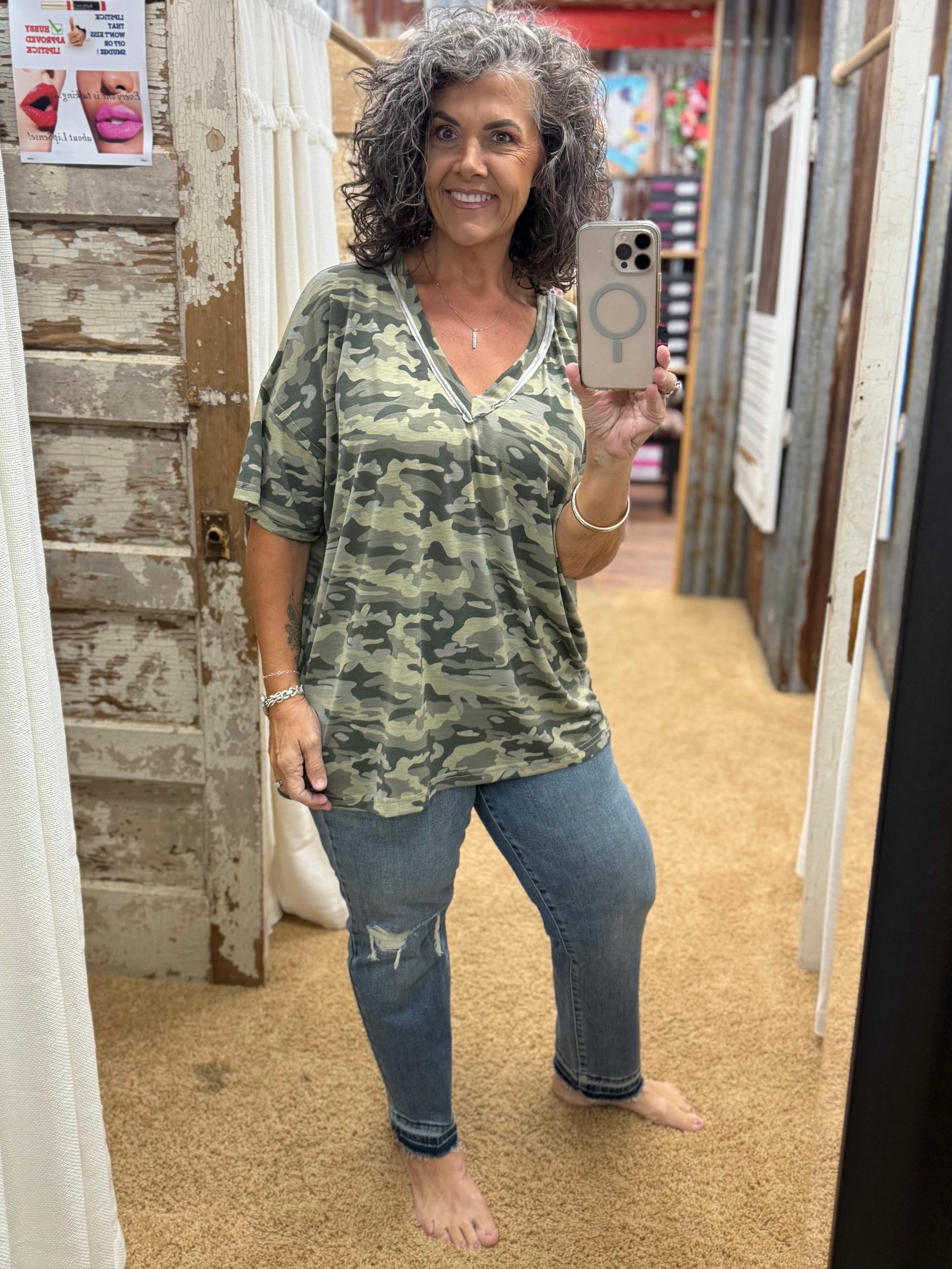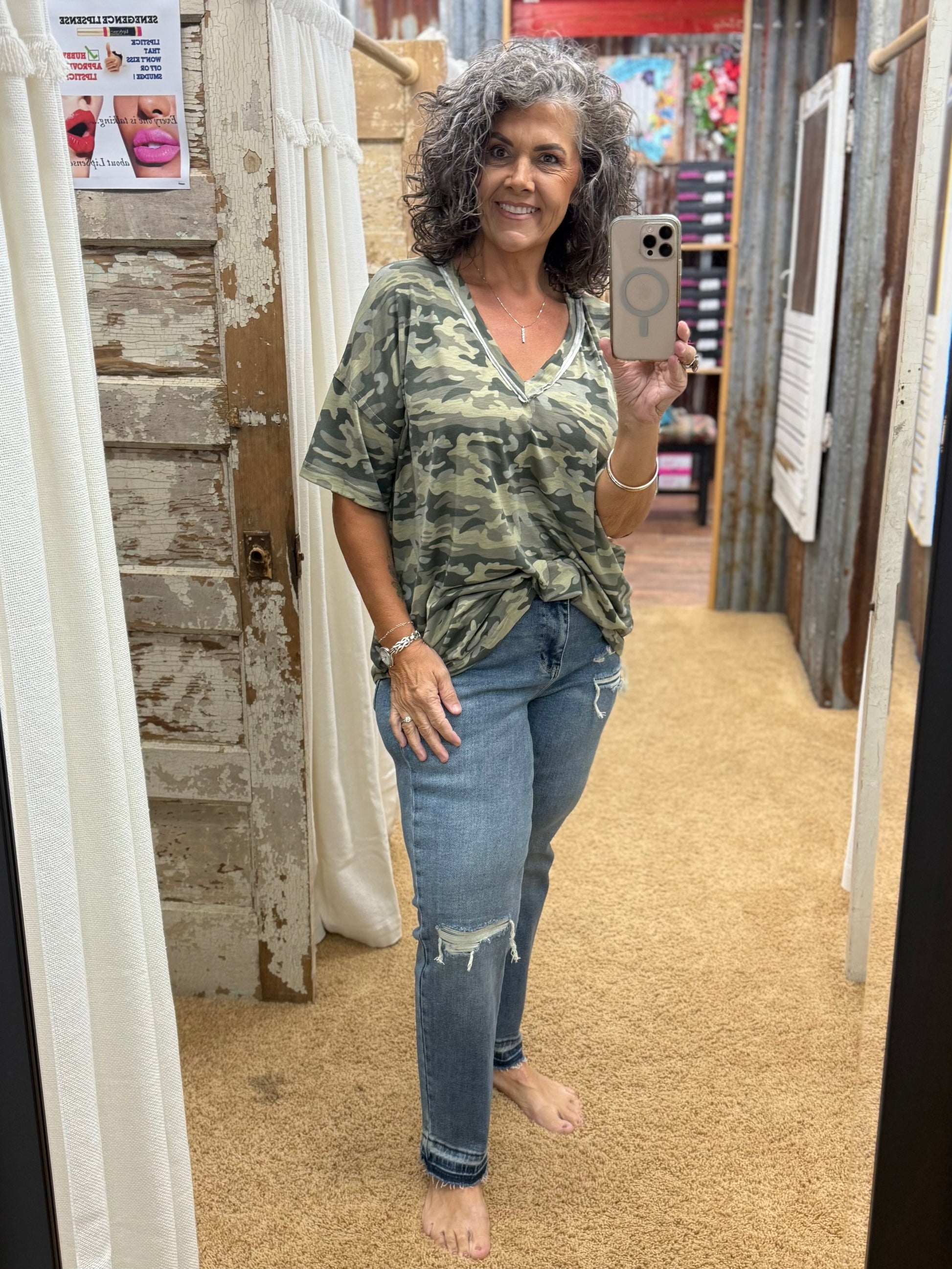 This playful camo V-neck top from POL combines comfort with cool style. Made from a soft, stretchy blend of 92% rayon and 8% spandex, its roomy fit and vintage wash detailing give it an effortlessly worn-in look. Perfect for layering or wearing on its own, this short sleeve tee adds a fun, casual edge to any outfit.