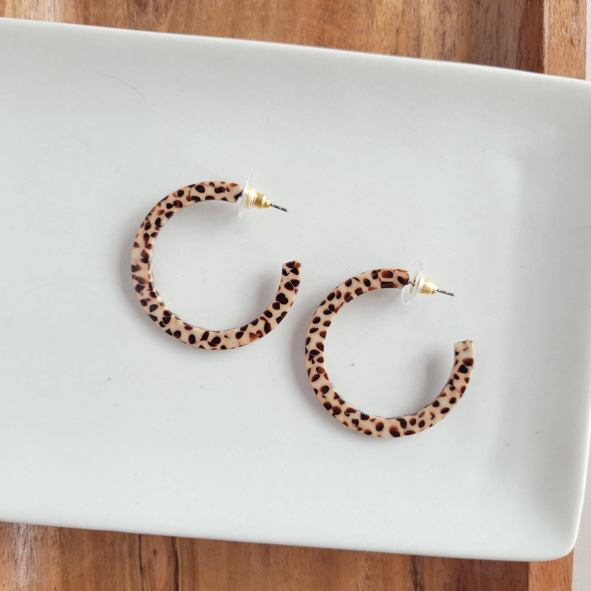 Camy is our medium sized hoop. Our signature ultra lightweight acrylics in gorgeous colors make them the perfect go-to wardrobe staple. * Hypoallergenic stainless steel * Lightweight and durable plant-based acetate acrylic in brown dot * 1.5" diameter.