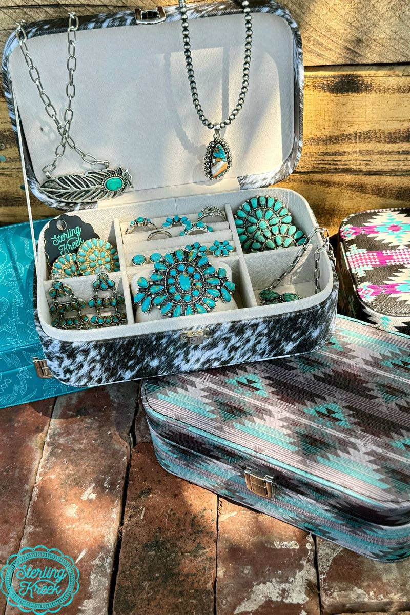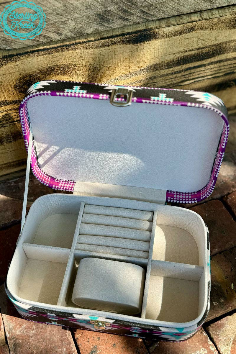 Add some flair to your jewelry storage with the CHEYENNE JEWELRY BOX. This vibrant Aztec box not only keeps your treasures organized and protected, but also brings a touch of bohemian charm to any room. Perfect for the free-spirited and stylish jewelry lover. L: 8.5 In W: 5.5 In H: 3 In