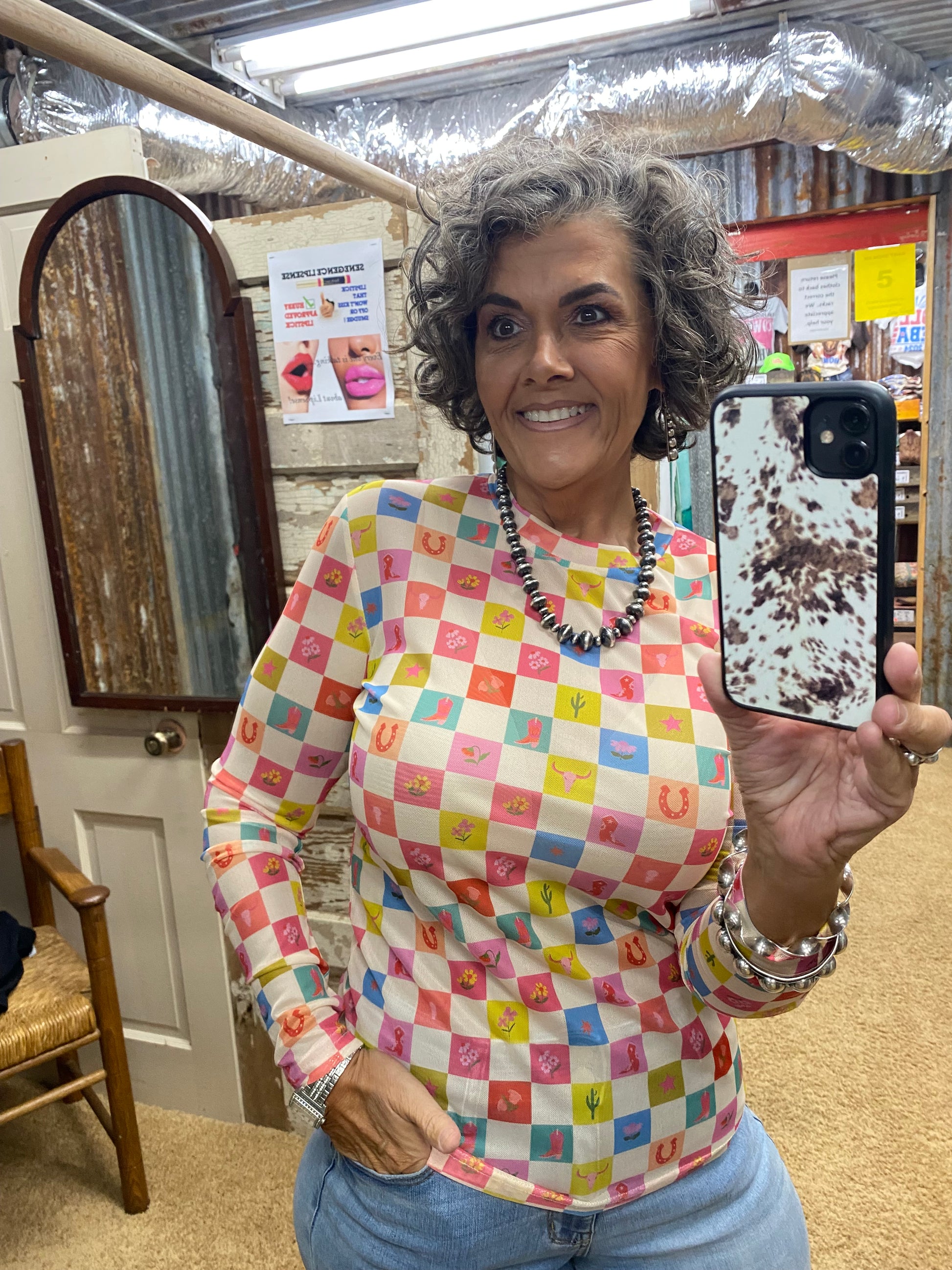 Cowgirl Check Long Sleeve Mesh Top
