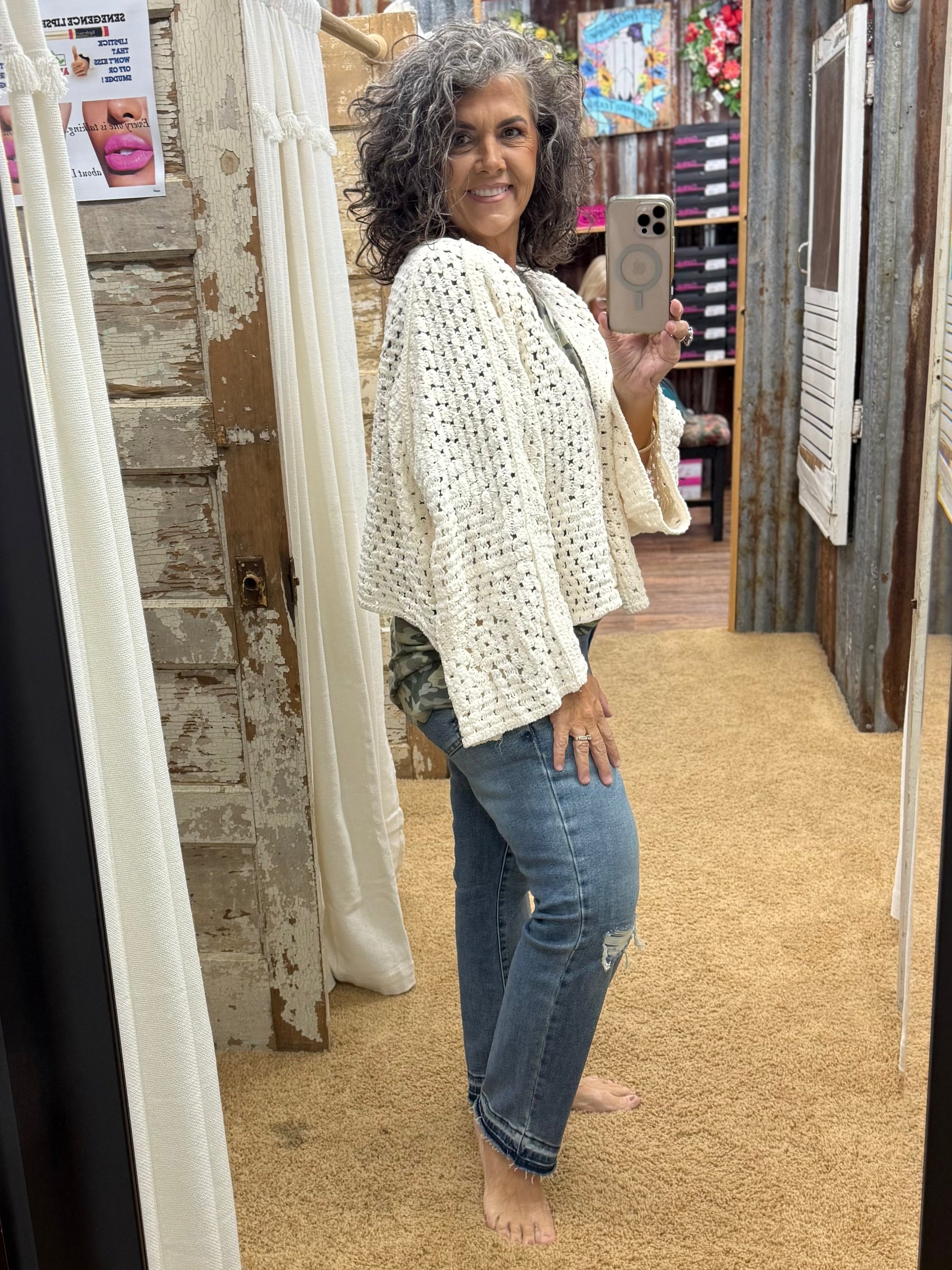Wrap yourself in cozy charm with this Cream Chenille Cardigan. Featuring a roomy fit and playful crochet patterns, its soft chenille fabric invites you to lounge or layer in style. Whether you’re chasing comfort or adding a whimsical touch to your outfit, this cardigan makes every day feel snug and special.