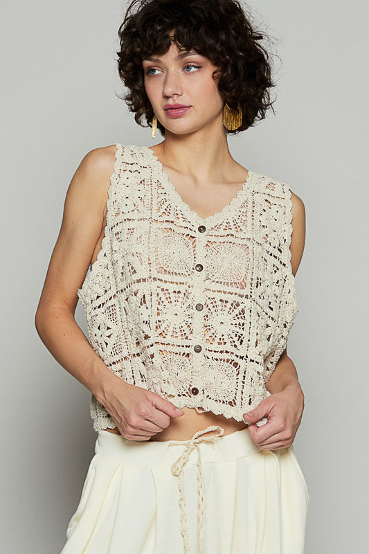 Designed in V-neck sleeveless regular fit top in crochet with various weave patterns.