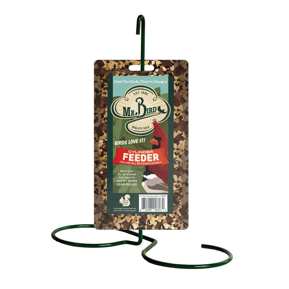 Extremely easy to use with all seed cylinders. Once sold, you gain repeat customers. Just slide the Mr. Birds' small or large cylinders onto the sturdy steel cylinder feeder and hang. Your birds will love it, they are not limited to a few seed ports so it is common to see a dozen birds at once on this feeder. Large bottom rings allow non-clinging birds to feed with ease.