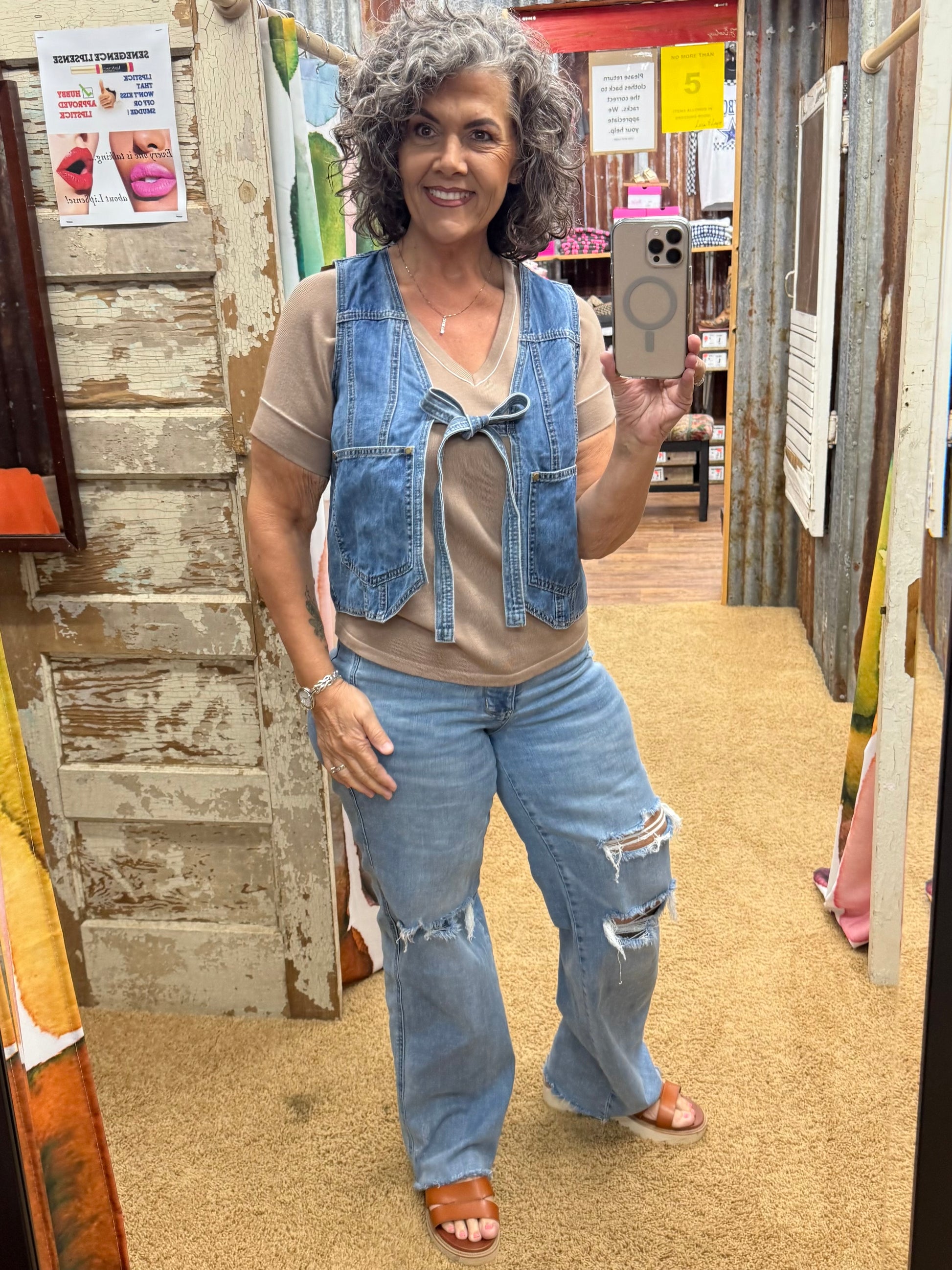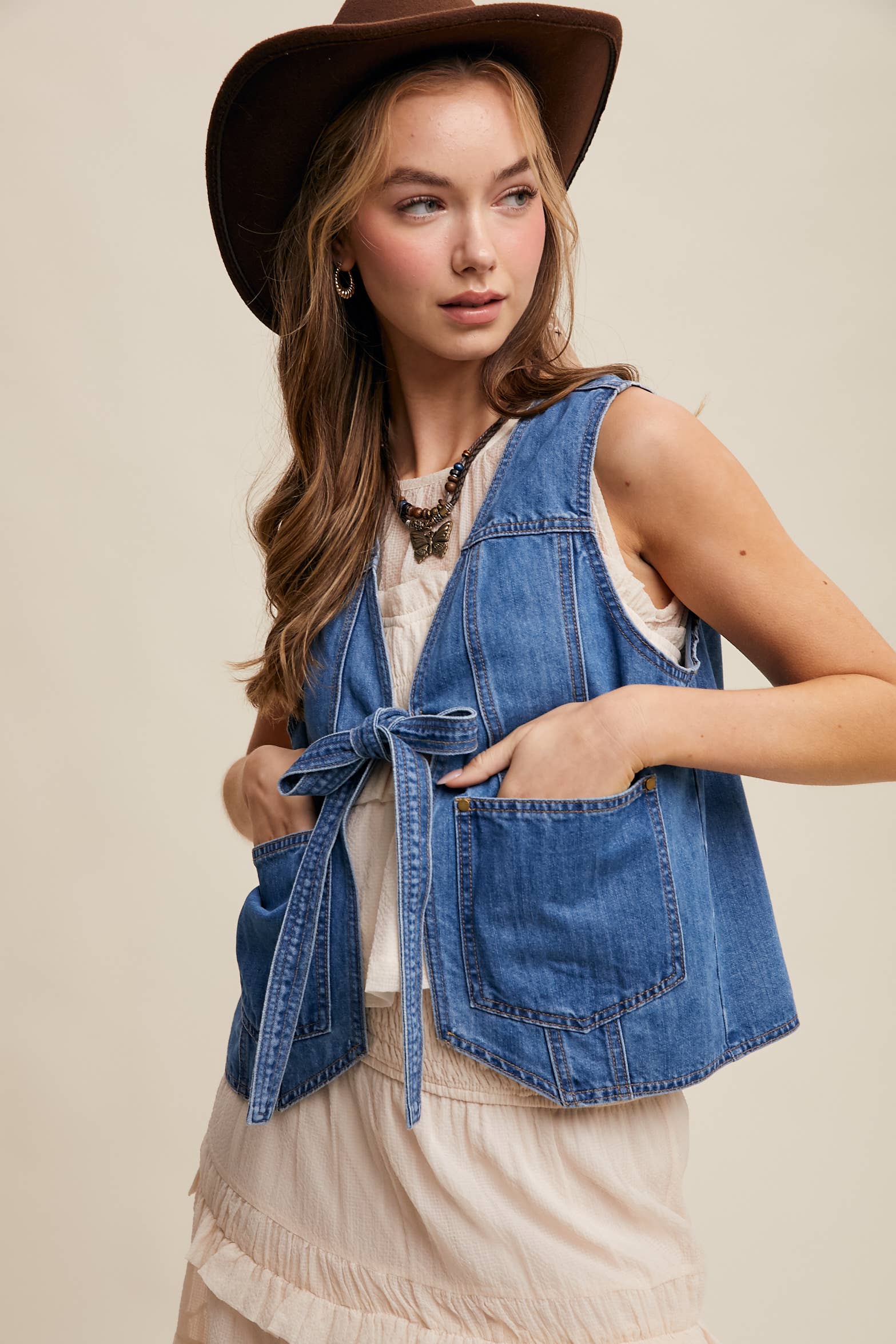 Timeless Denim meets ultimate versatility in our Tie-Front Vest. Crafted from durable yet soft denim, this vest is perfect for layering across seasons. With a stylish front-tie design and functional front pockets, it's both chic and practical. The relaxed fit and back pleat detail add a touch of comfort and sophistication. Get ready to turn heads with this must-have vest!