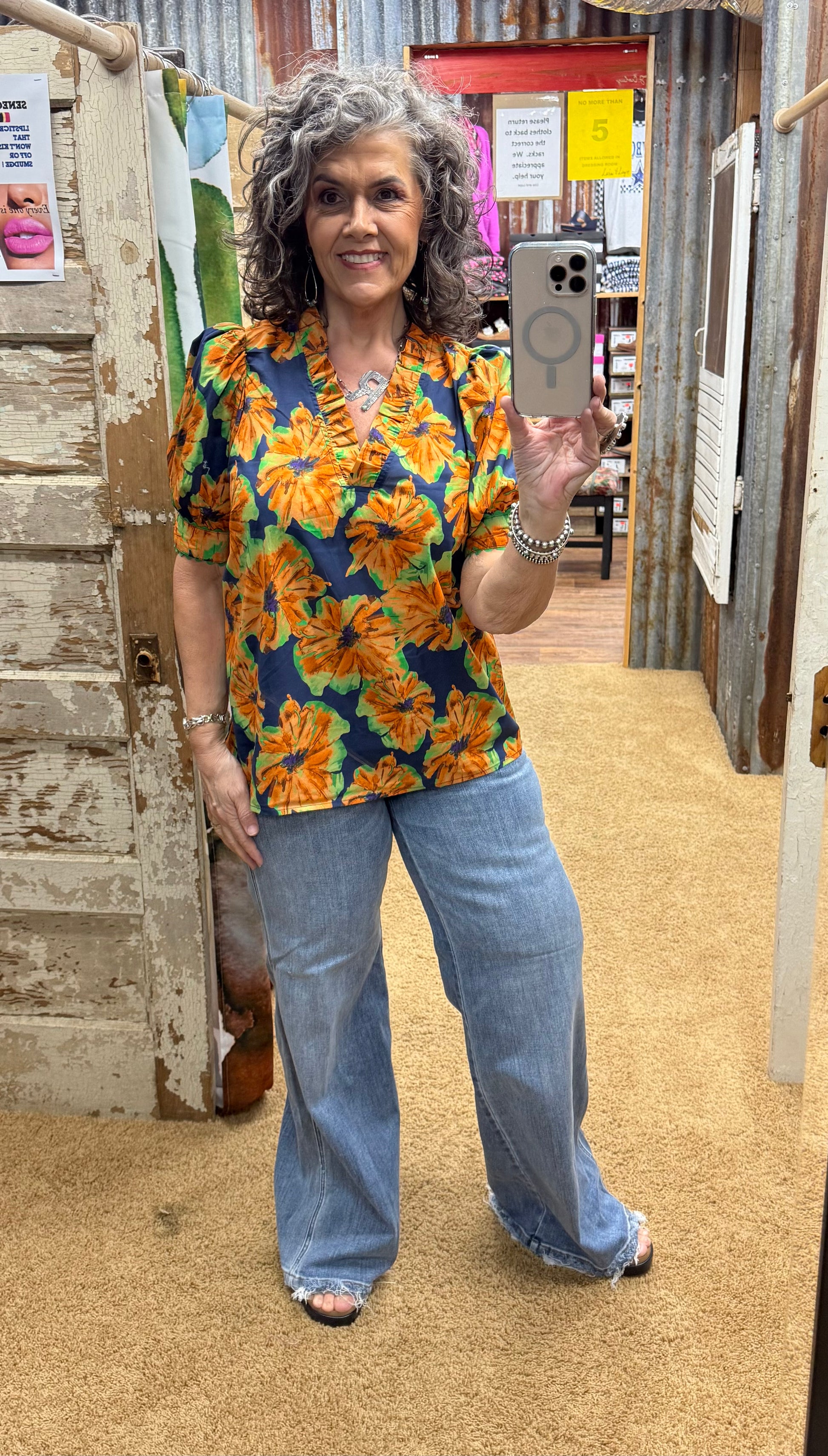 Flaunt your playful side with our Dreamers Awake Blouse. This pullover top features a unique floral print, short band puff sleeves, and charming ric rac trim that adds a touch of whimsy. The ruffle accented v-neck completes the look, making this top a must-have for any fashion-forward dreamer.