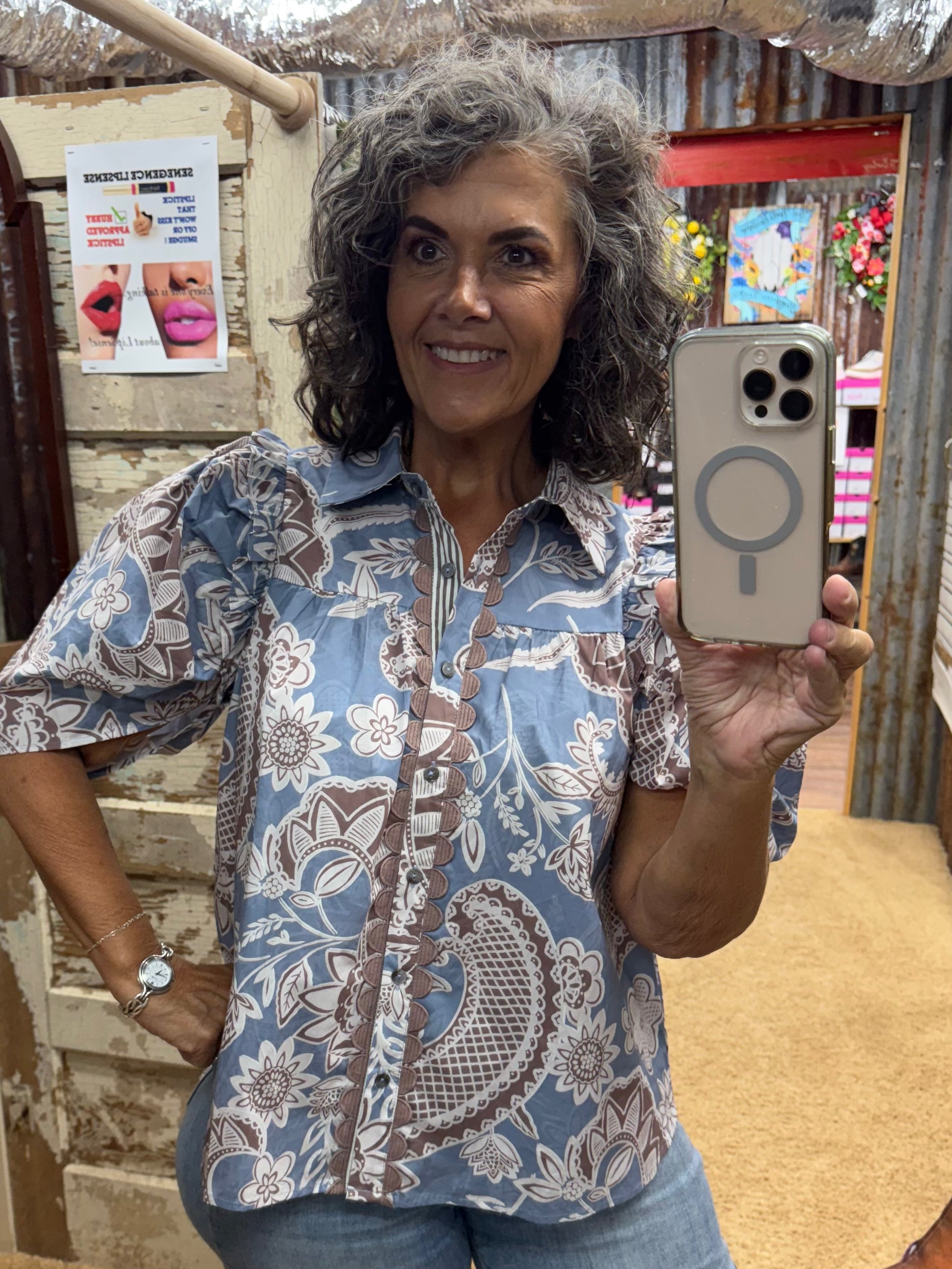 Elevate your wardrobe with the Dusty Blue Blouse by Entro. This lightweight woven top showcases a refined paisley pattern and elegant elbow-length statement sleeves. Featuring a classic collar with button closure and a delicate contrast scallop trim inset, it offers subtle sophistication. Unlined and non-sheer, it provides comfortable wear while maintaining a polished, graceful look.
