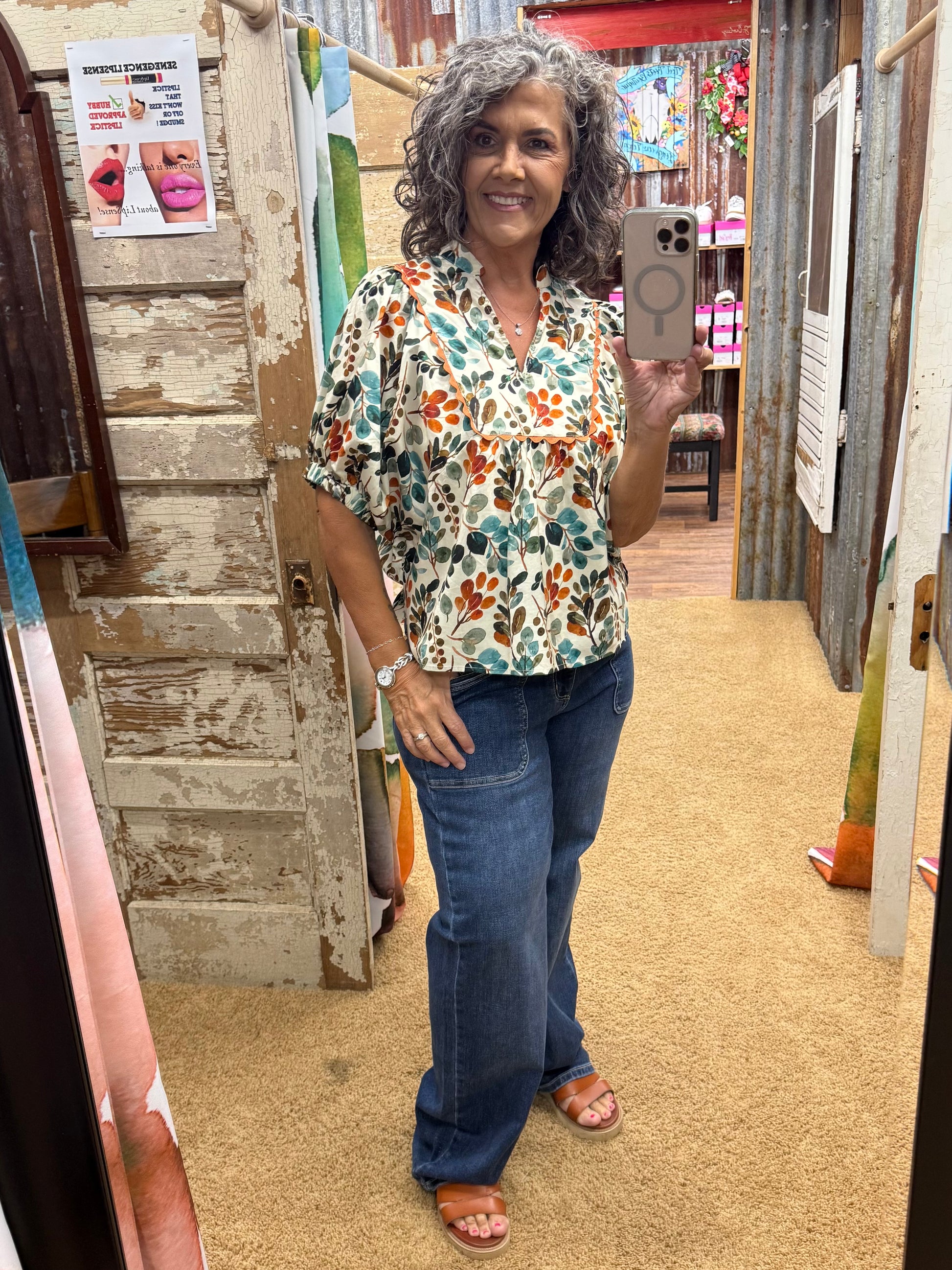 Elevate your wardrobe with our Ecru Botanical Blouse! This playful V-neck features a band collar and breezy dolman sleeves adorned with eye-catching scallop trim. The lightweight, non-sheer woven fabric showcases a whimsical botanical print that's sure to turn heads. Perfect for adding a touch of garden-inspired fun to any outfit!