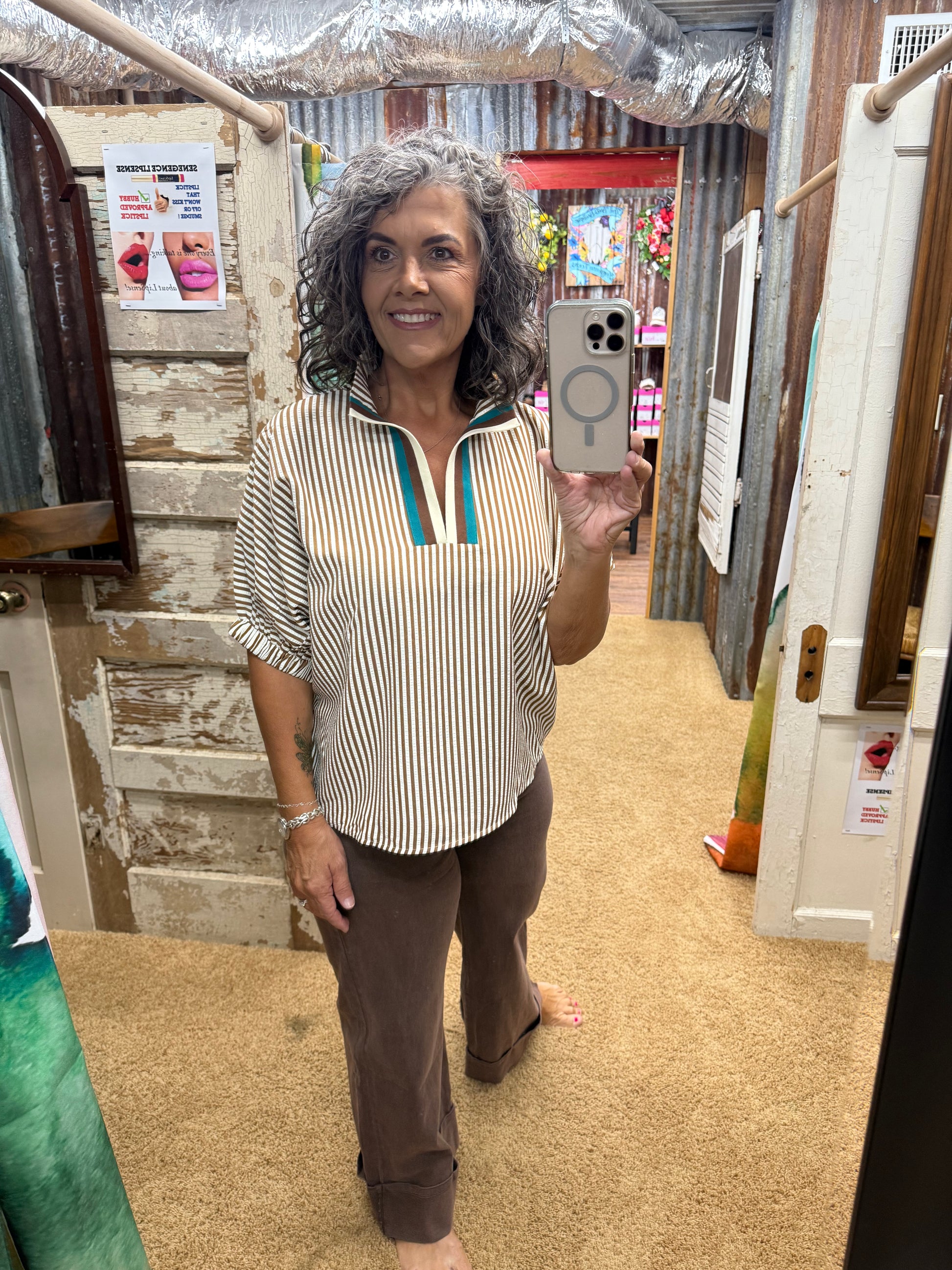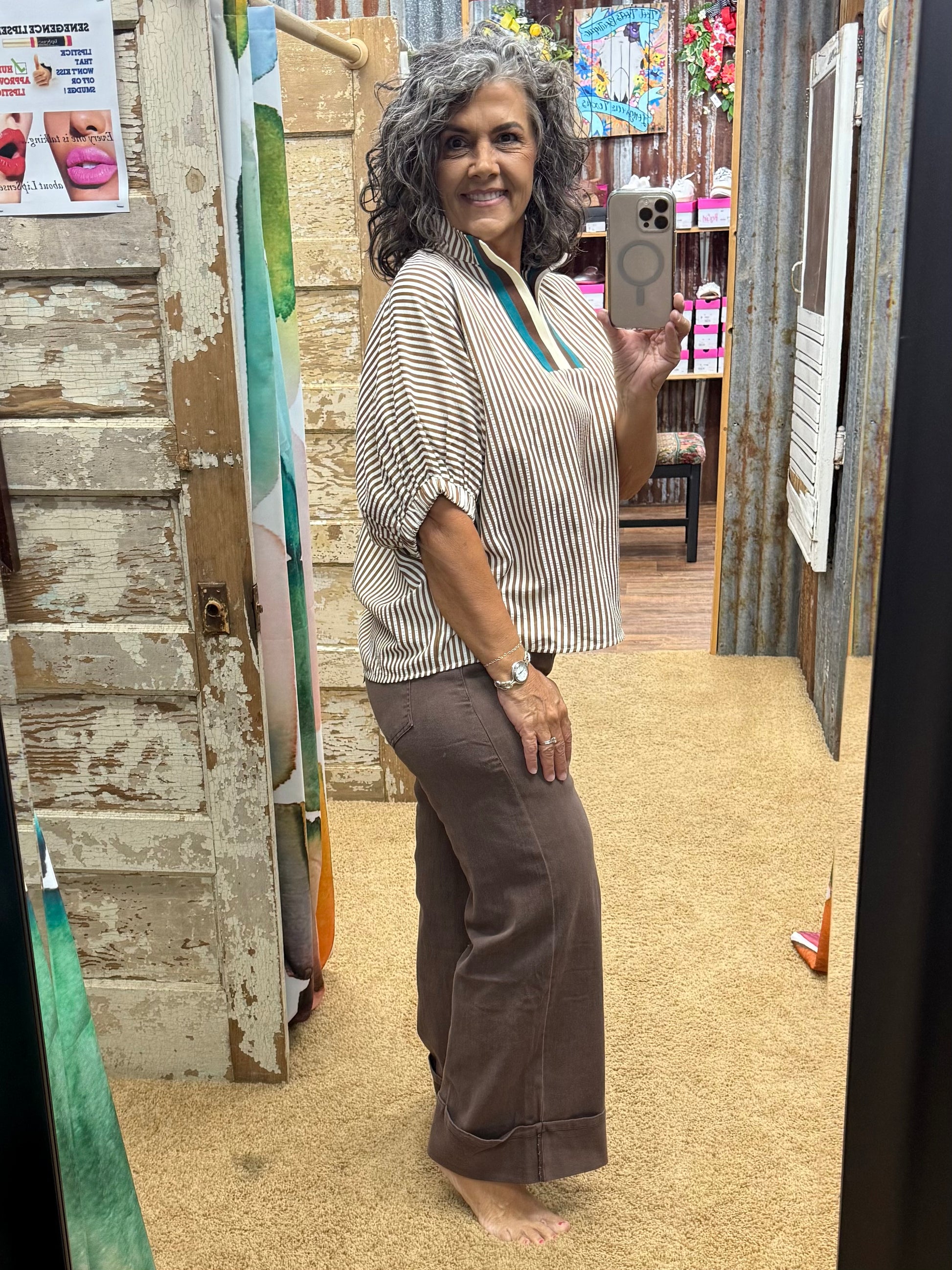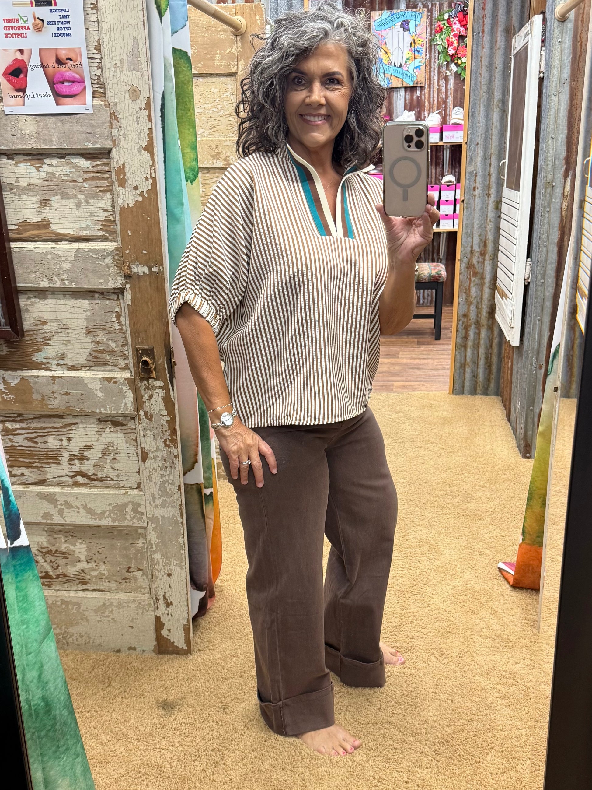 The Entro Caramel Top combines sophisticated design with comfort, featuring a high neck and elasticated sleeve bands for a tailored fit. Its distinctive stripe pattern is enhanced by a multicolor ribbed band at the split neck, adding subtle visual interest. Crafted from lightweight woven fabric, this unlined top offers a non-sheer finish, making it ideal for layering or wearing alone in warmer weather. Perfect for those seeking a refined yet effortless addition to their wardrobe.