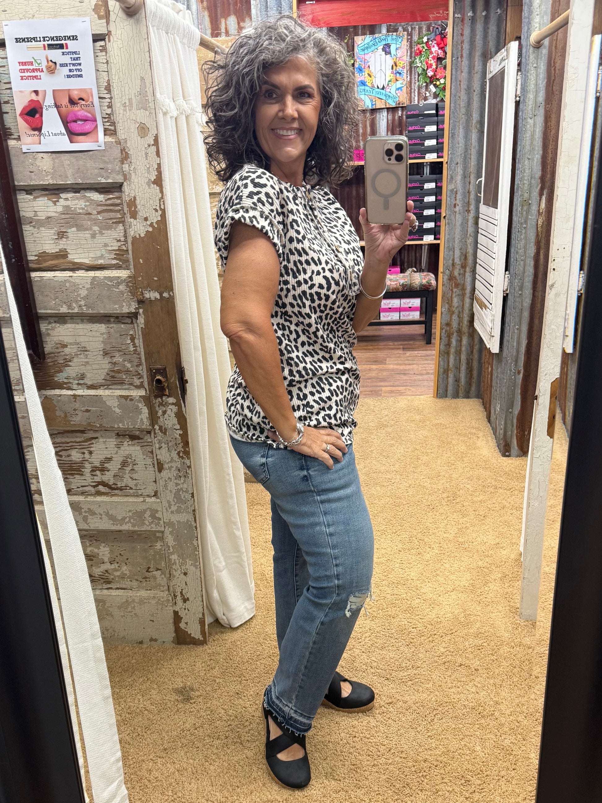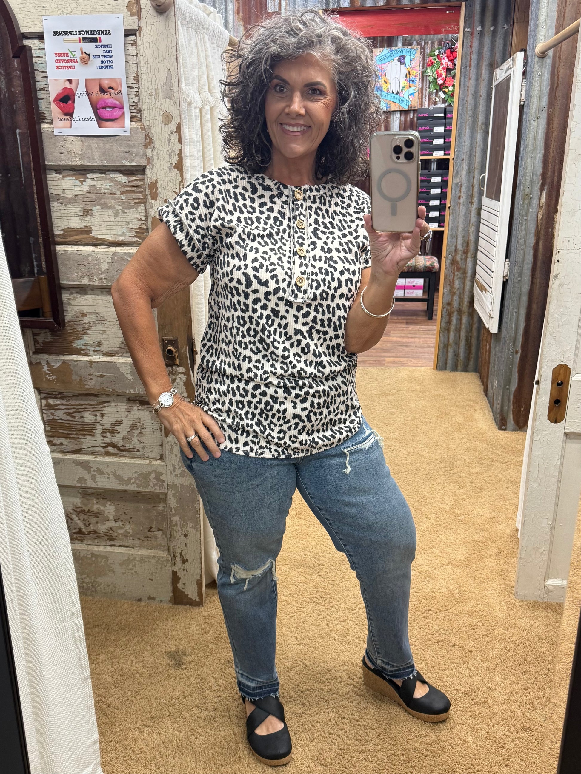 BEIGE SHORT SLEEVE URBAN RIBBED ANIMAL BUTTON UP TOP