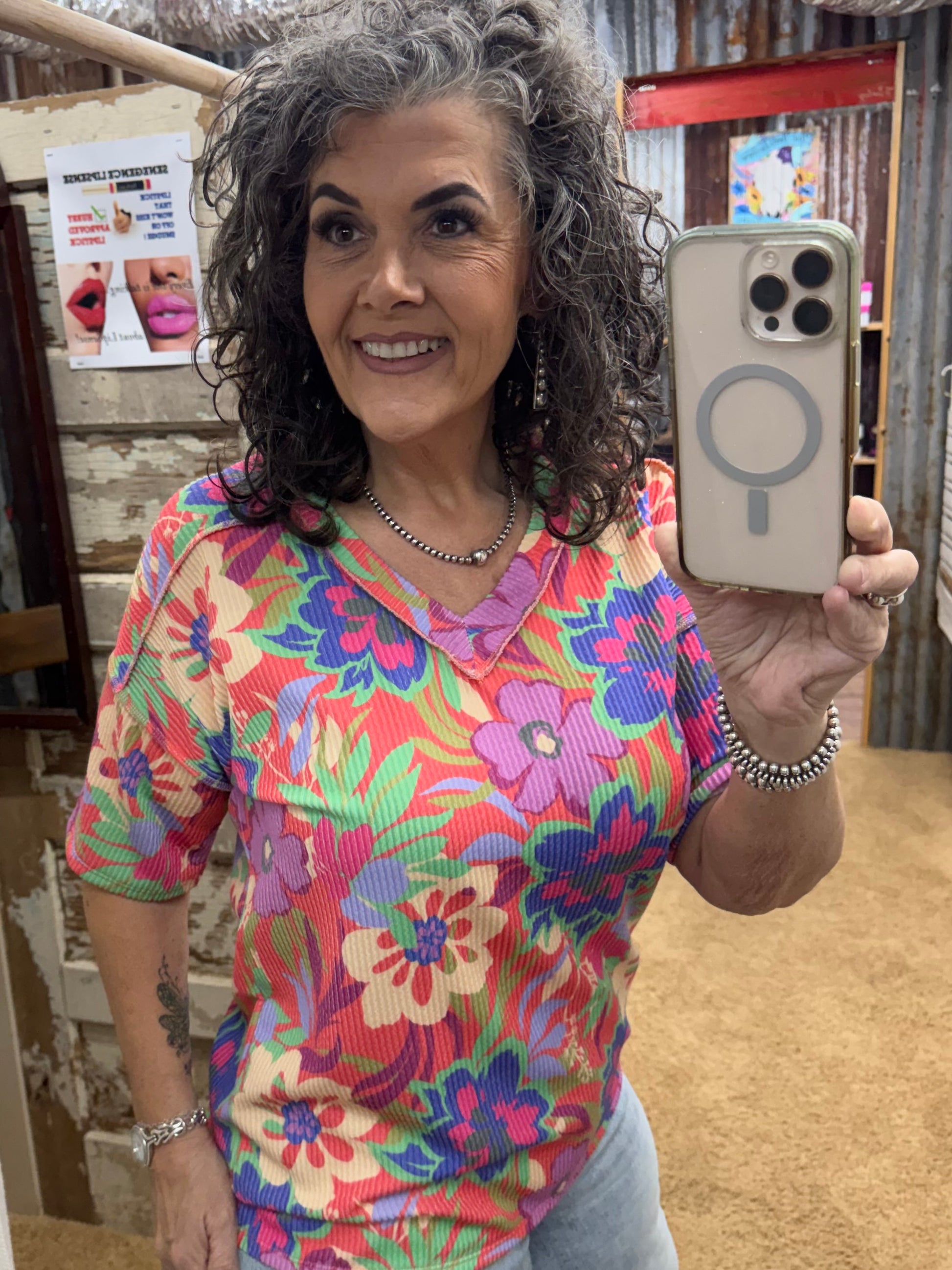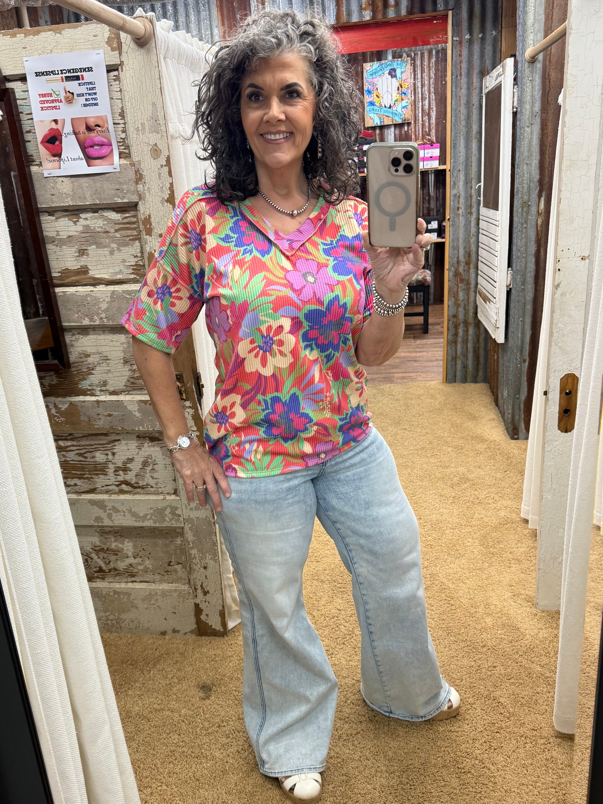 Brighten your wardrobe with this stunning floral V-neck top, featuring a bold coral multi-color print that commands attention. The flattering V-neckline is elevated by unique decorative button accents on the shoulders, adding sophisticated flair to a timeless design. Crafted from a lightweight, stretchy 95% polyester and 5% spandex blend, this top delivers all-day comfort whether layered or worn solo. Relaxed short sleeves make it versatile for any season—effortless style meets vibrant florals.