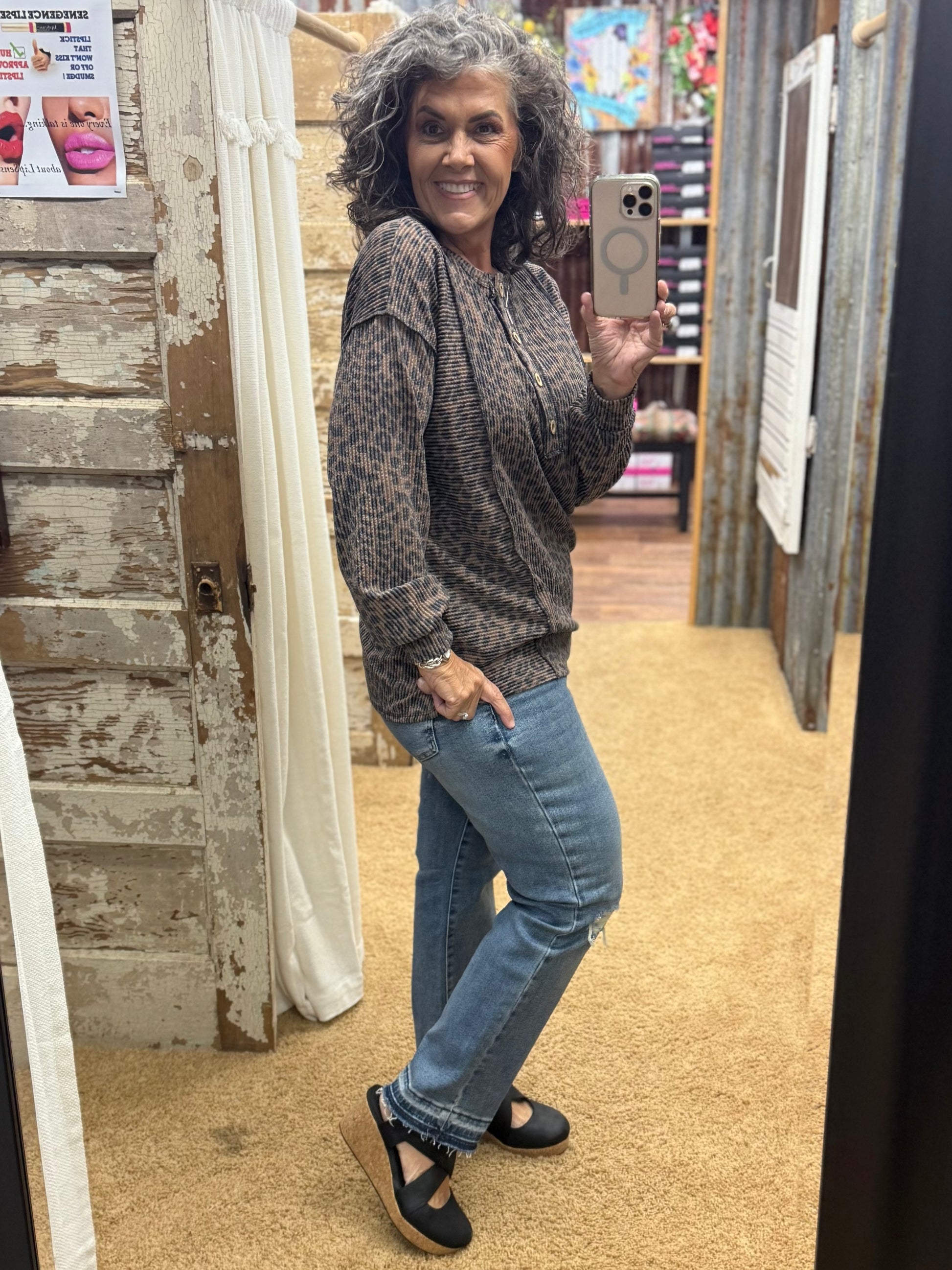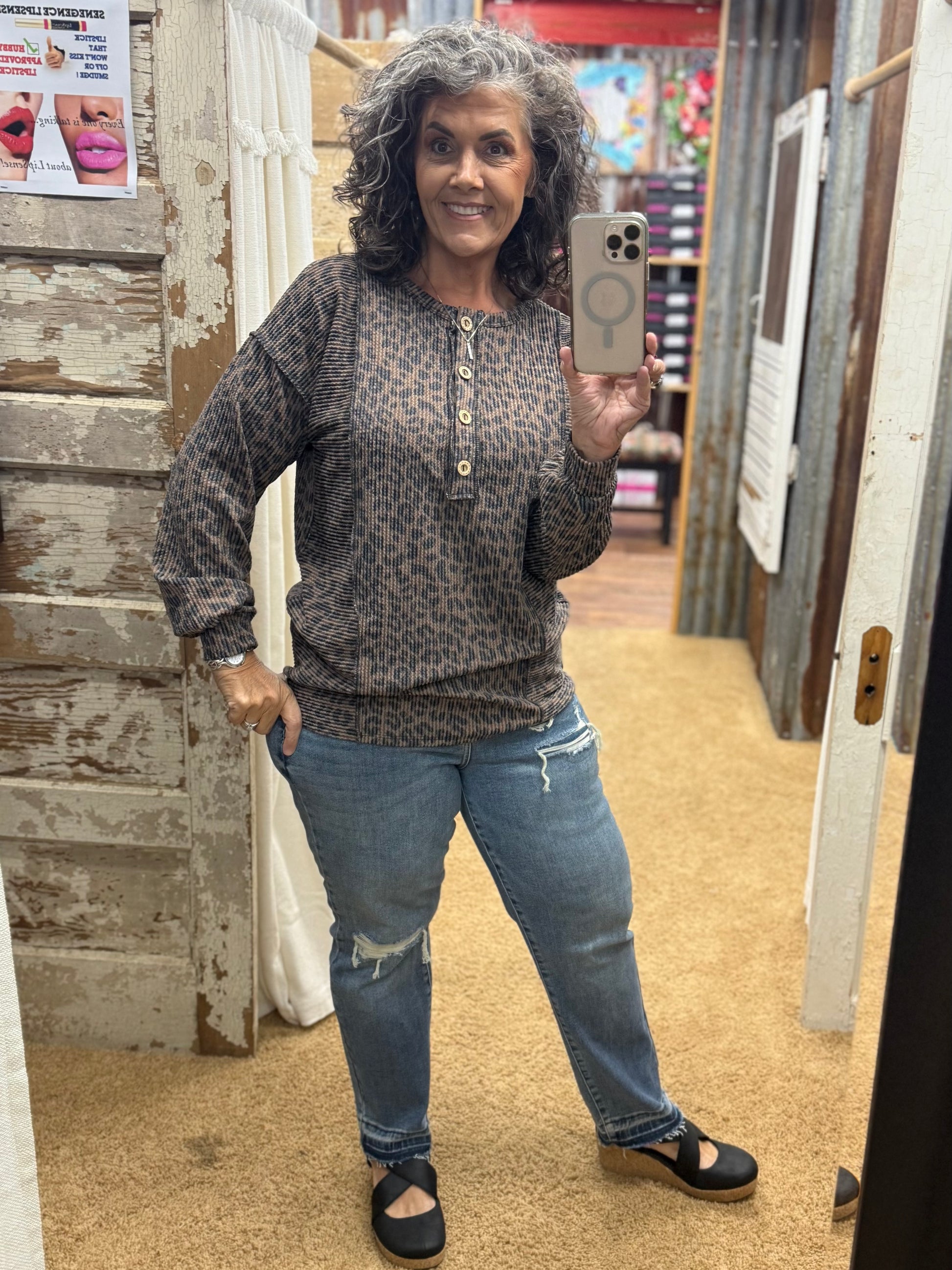 LONG SLEEVE URBAN RIBBED BUTTON FRONT ANIMAL TOP
