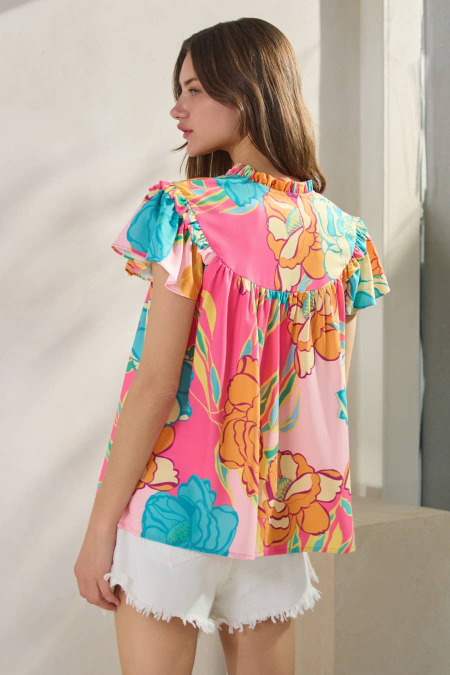 Get ready to turn heads in our Floral Printed Ruffle Sleeve Blouse! With its striking floral print and playful ruffle sleeves, this blouse will add a touch of fun to any outfit. Available in sizes Small to Large and made from 100% polyester, it's the perfect blend of style and comfort. Our Curvy sizes blouse has a 3/4" sleeve and faux button front.