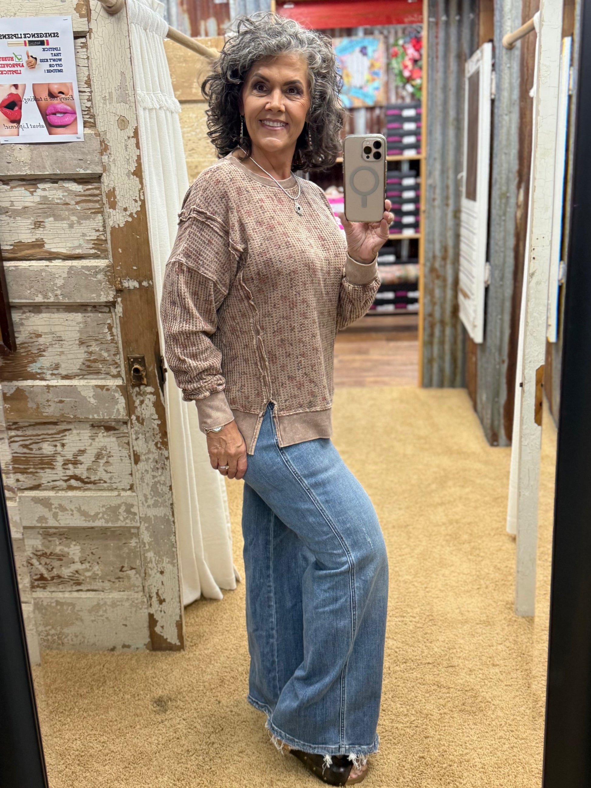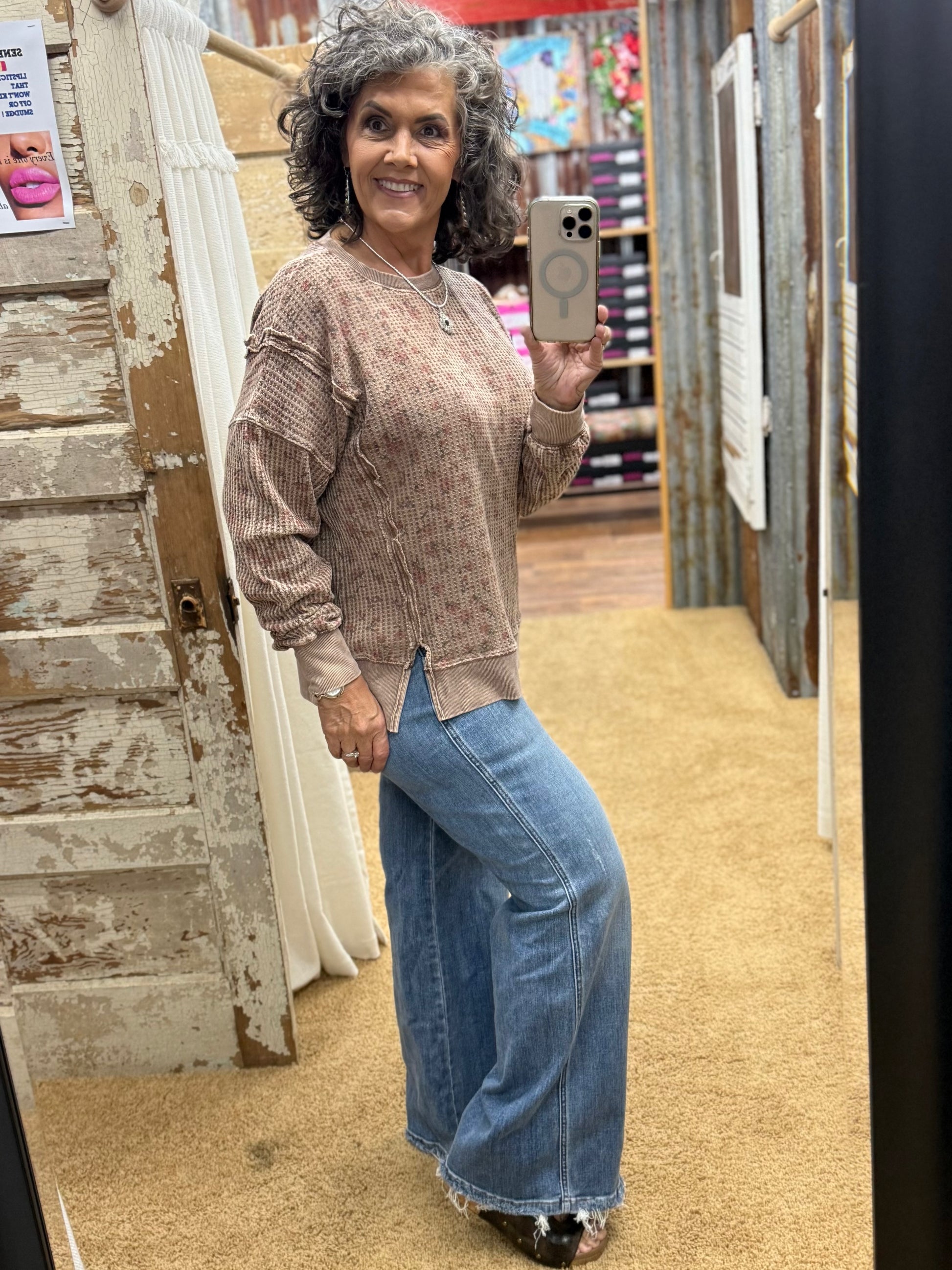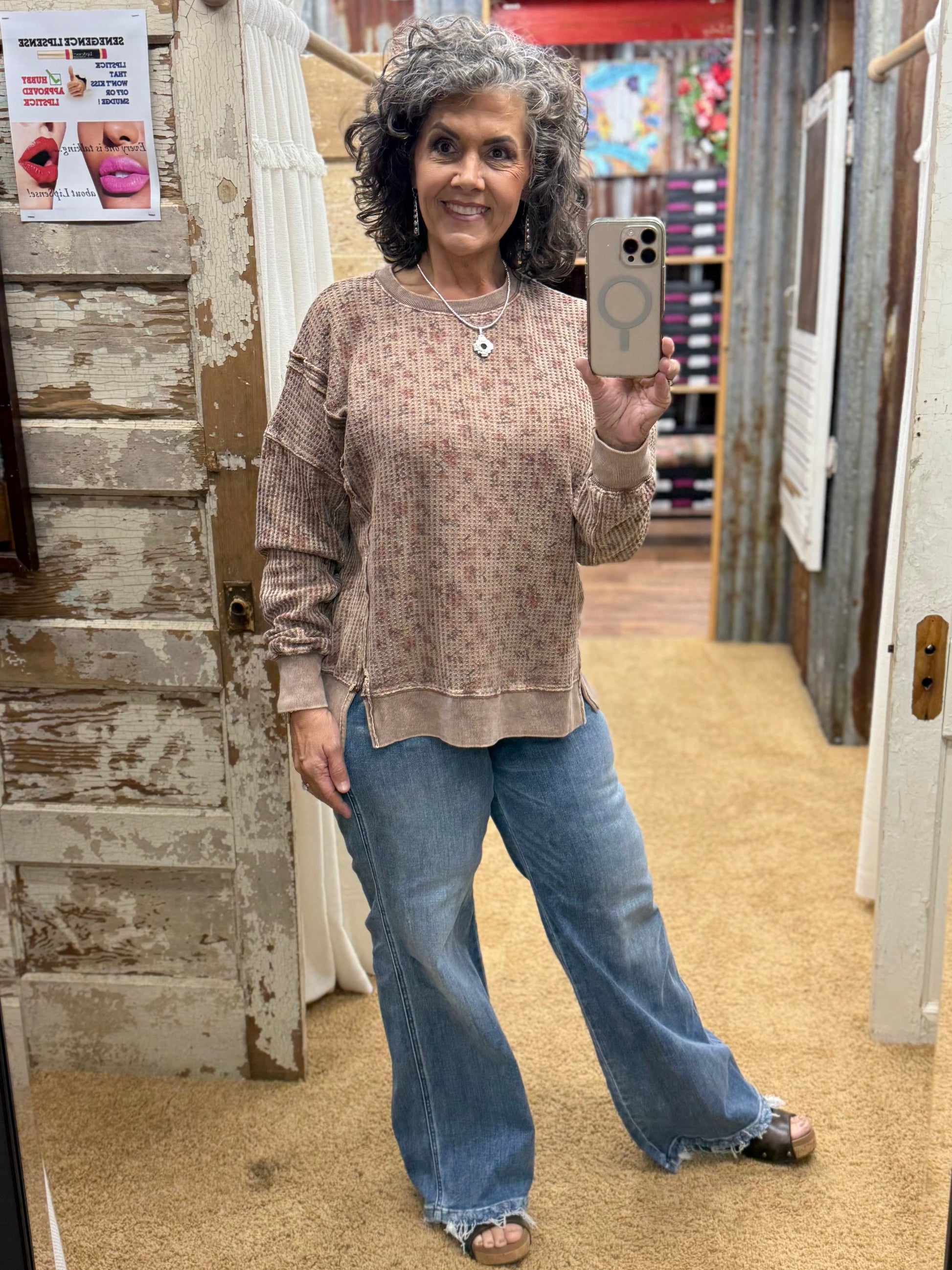 Embrace cozy vibes with this oversized thermal pullover featuring a playful ditsy floral print. The textured waffle knit and exposed seams add charming detail, while side slits and dropped shoulders keep the fit relaxed and easygoing. Perfect for layering or lounging, its crew neckline and mineral-washed finish give it a soft, lived-in feel you'll love. Small measurements include a 25.5" length and 24.5" bust for a comfy, roomy fit.