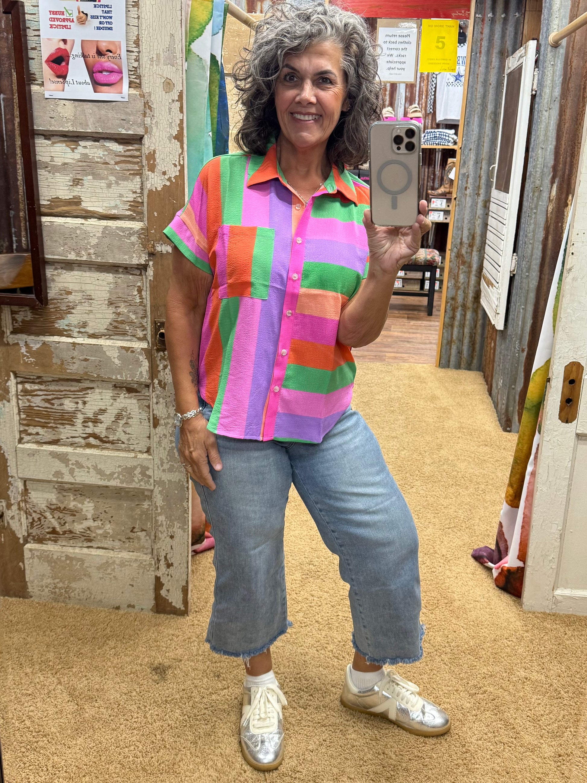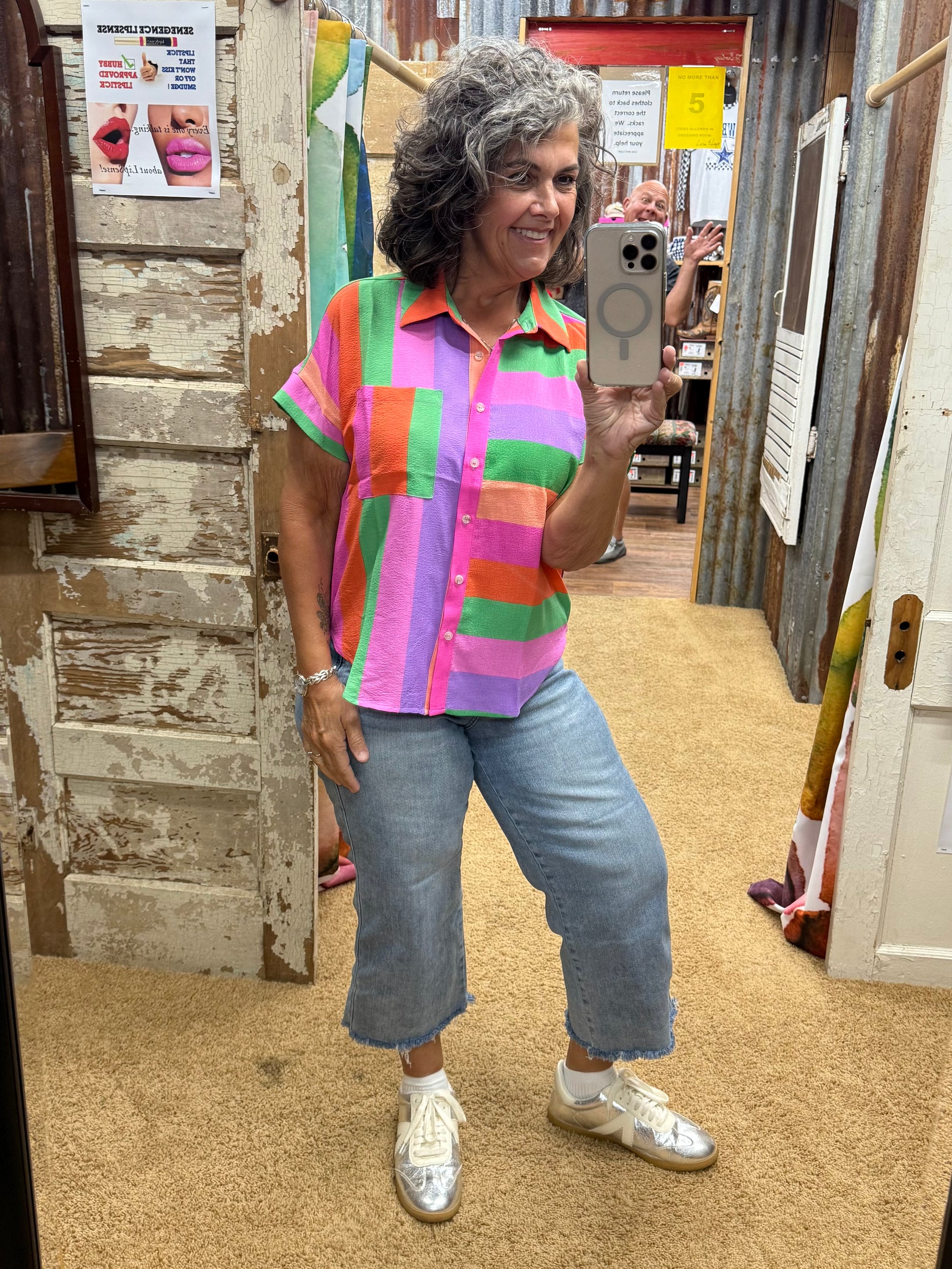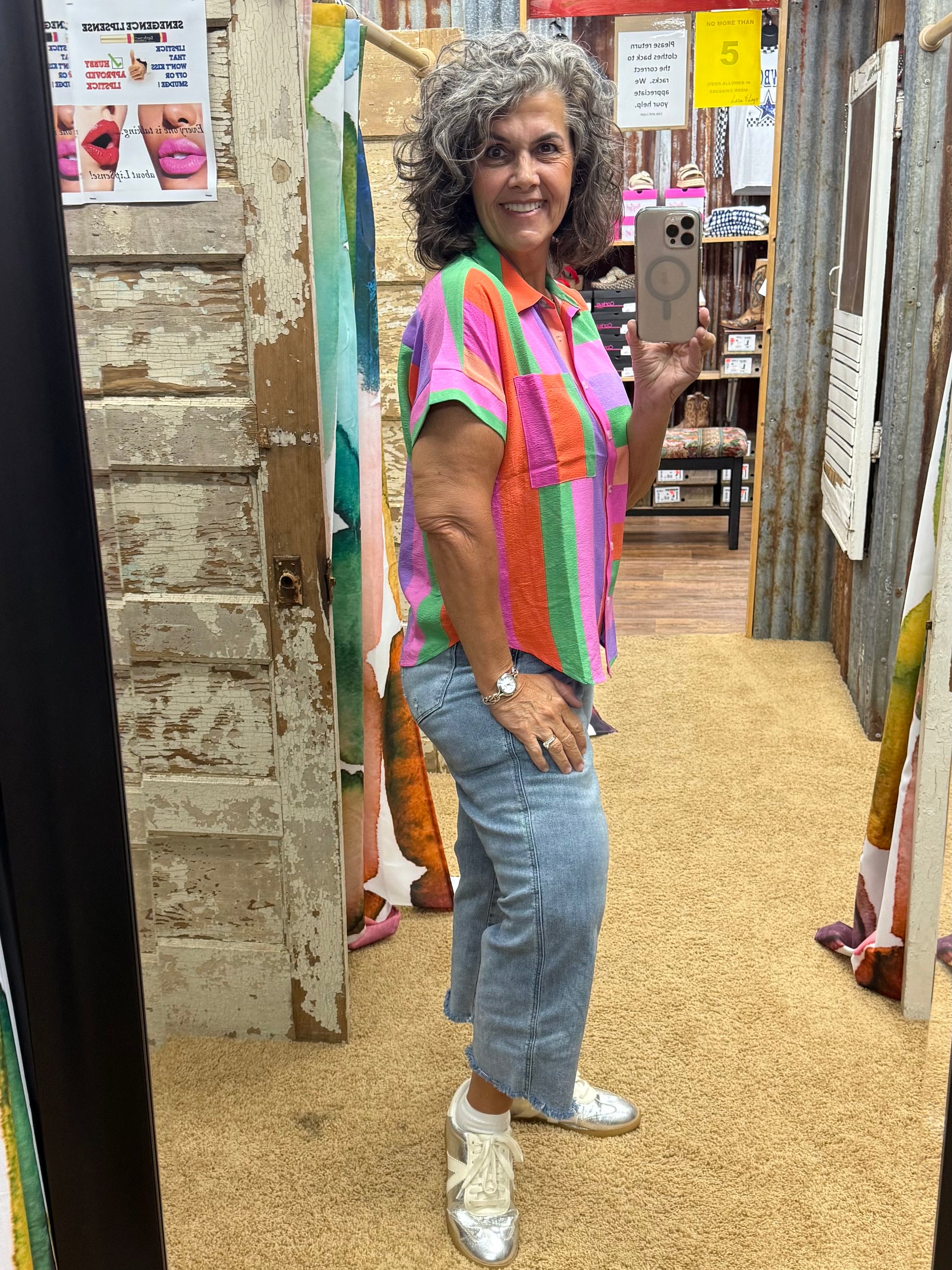 Add some color to your wardrobe with our Fruity Striped Blouse! This playful top features a variety of vibrant stripes and a collared neck. With a convenient front buttoned closure and chest pocket, you'll stay stylish and organized. The back inverted pleat and curved hemline add a touch of uniqueness to this short sleeve blouse.