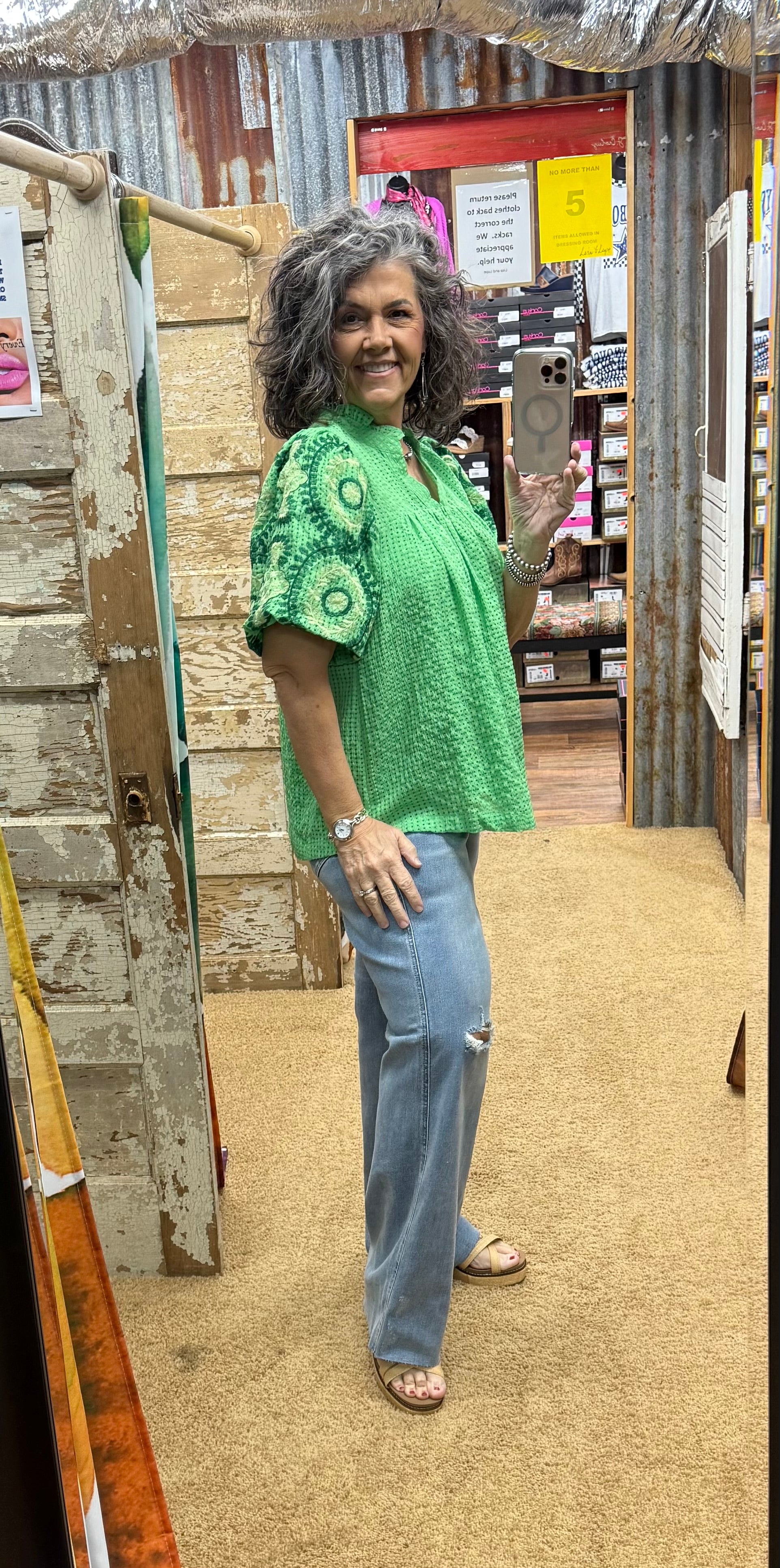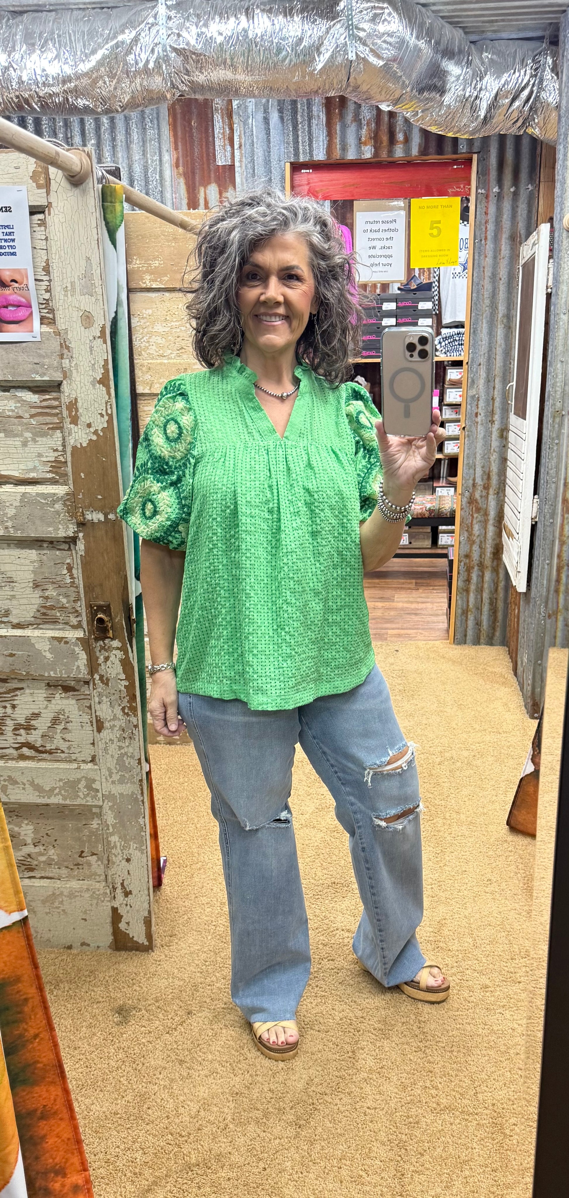 Get ready to turn heads in this Green Checkered Seersucker Top. Made with lightweight seersucker material, this top is perfect for any warm weather occasion. The embroidered sleeves and split neckline add a touch of elegance, making this top a must-have for your wardrobe. Perfectly stylish and comfortable - what more could you want?