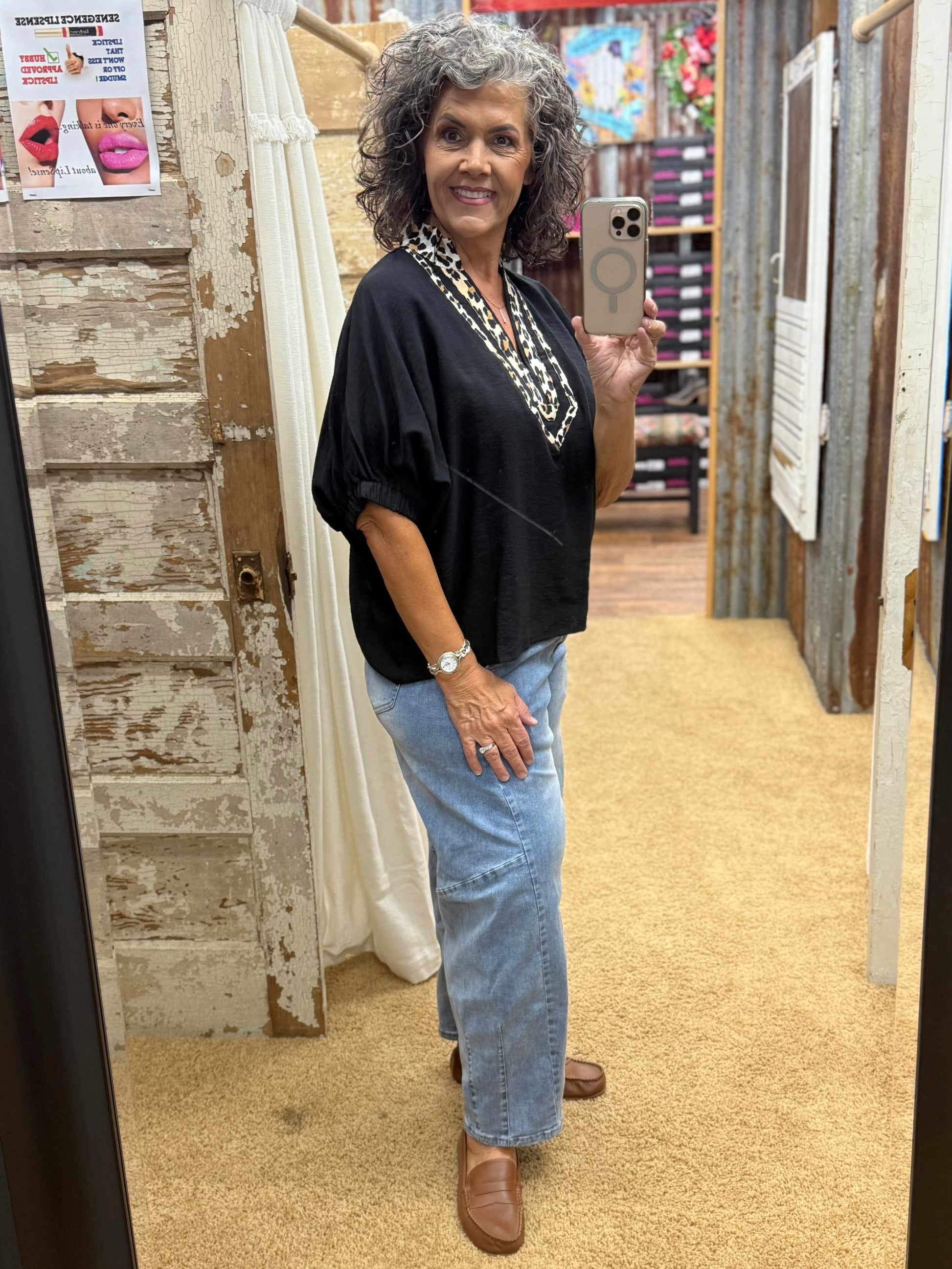 Unleash your wild side with our Black Exotic Blouse! This solid top features an elasticated sleeve band and a leopard print accented caftan-inspired split neck placket. Lightweight and non-sheer, this blouse is perfect for any occasion. Dare to stand out in this unique piece.