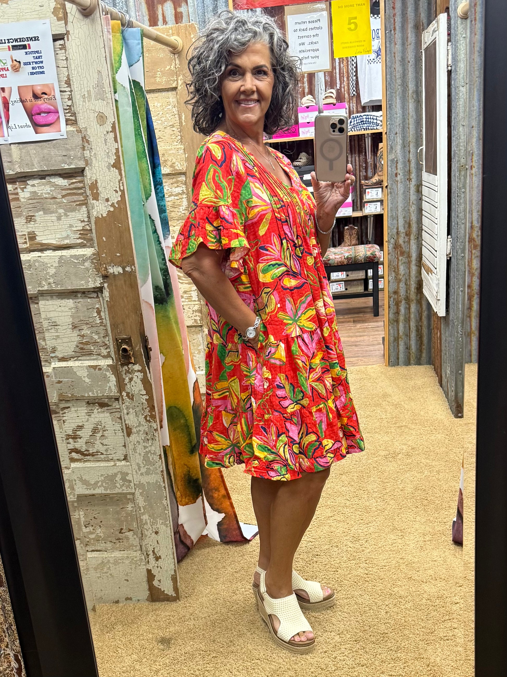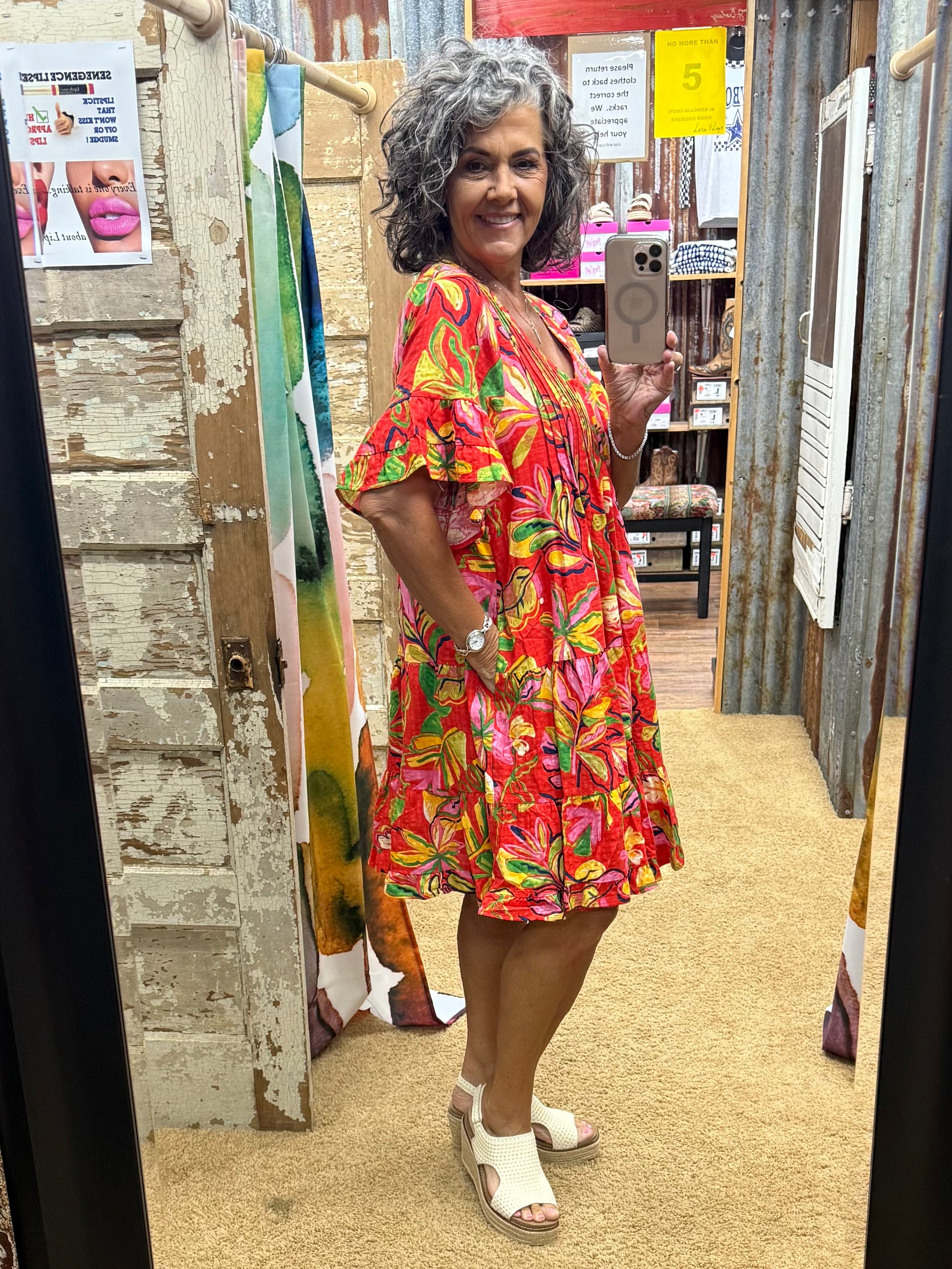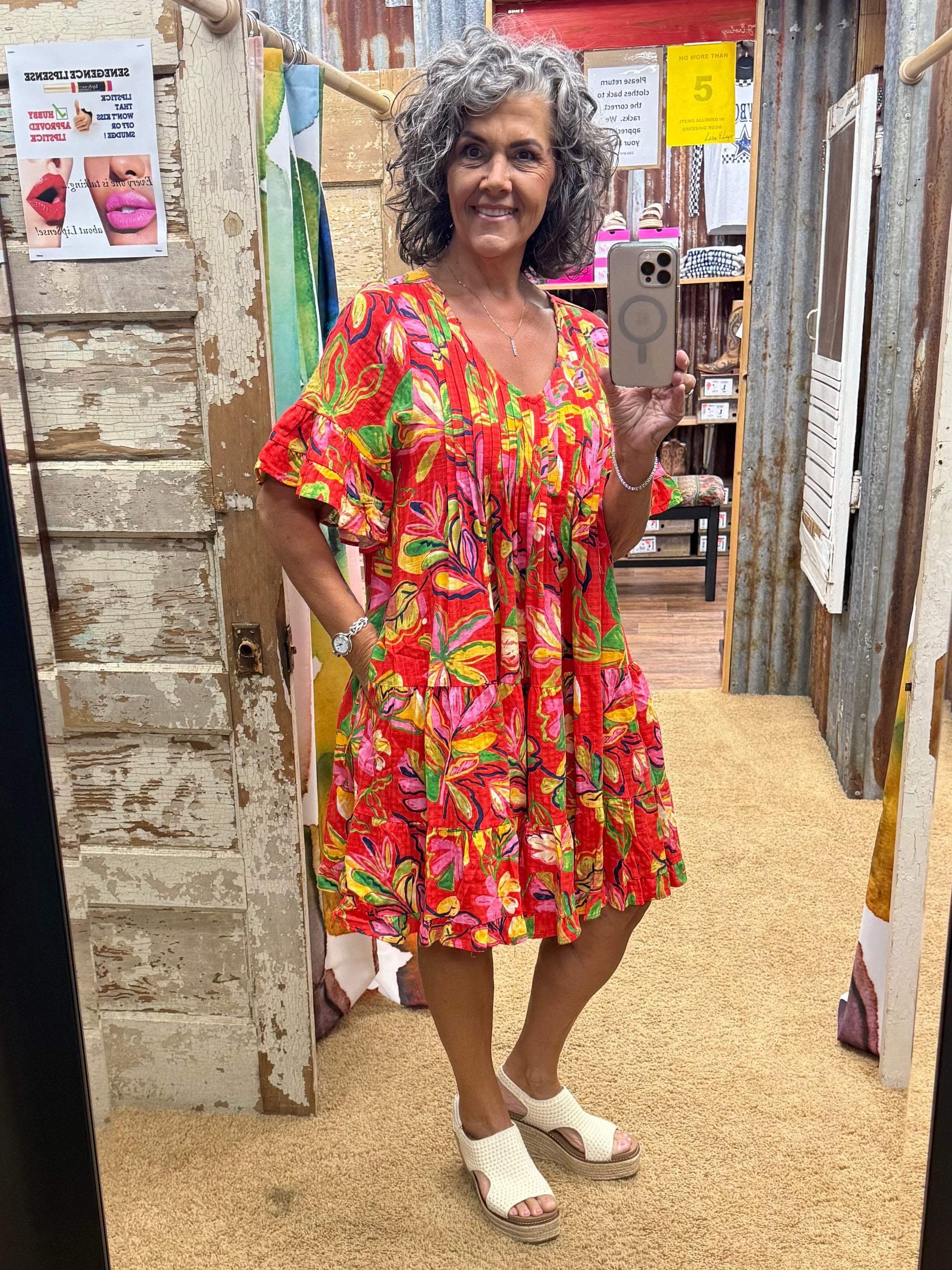 Make a splash in our HOT CORAL SLUB DRESS! This eye-catching number features playful tiered and ruched details that add bounce to your step. The pretty pleated chest detailing gives just the right amount of flair, while those handy side pockets (surprise!) keep your essentials close. With adorable ruffled sleeves this dress brings the fun wherever you go! The relaxed, loose fit creates a flowy silhouette that's perfect for twirling through summer adventures or simply looking fabulous while staying comfy!