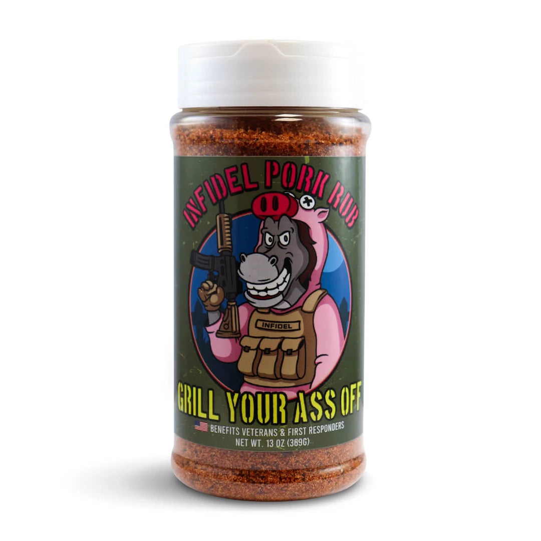 Infidel; A term meaning American Greatness. With a name like this you know you're getting one hell of a seasoning. Infidel Pork Rub has been formulated with just the right amount of heat and sweet. Again this is one of those seasonings that can add a little sweet and little heat to any dish in your cookbook. This product will clump due to the brown sugar. We do not add any anti-caking agents to keep ingredients 100% natural. We like to call them Freedom Clumps.