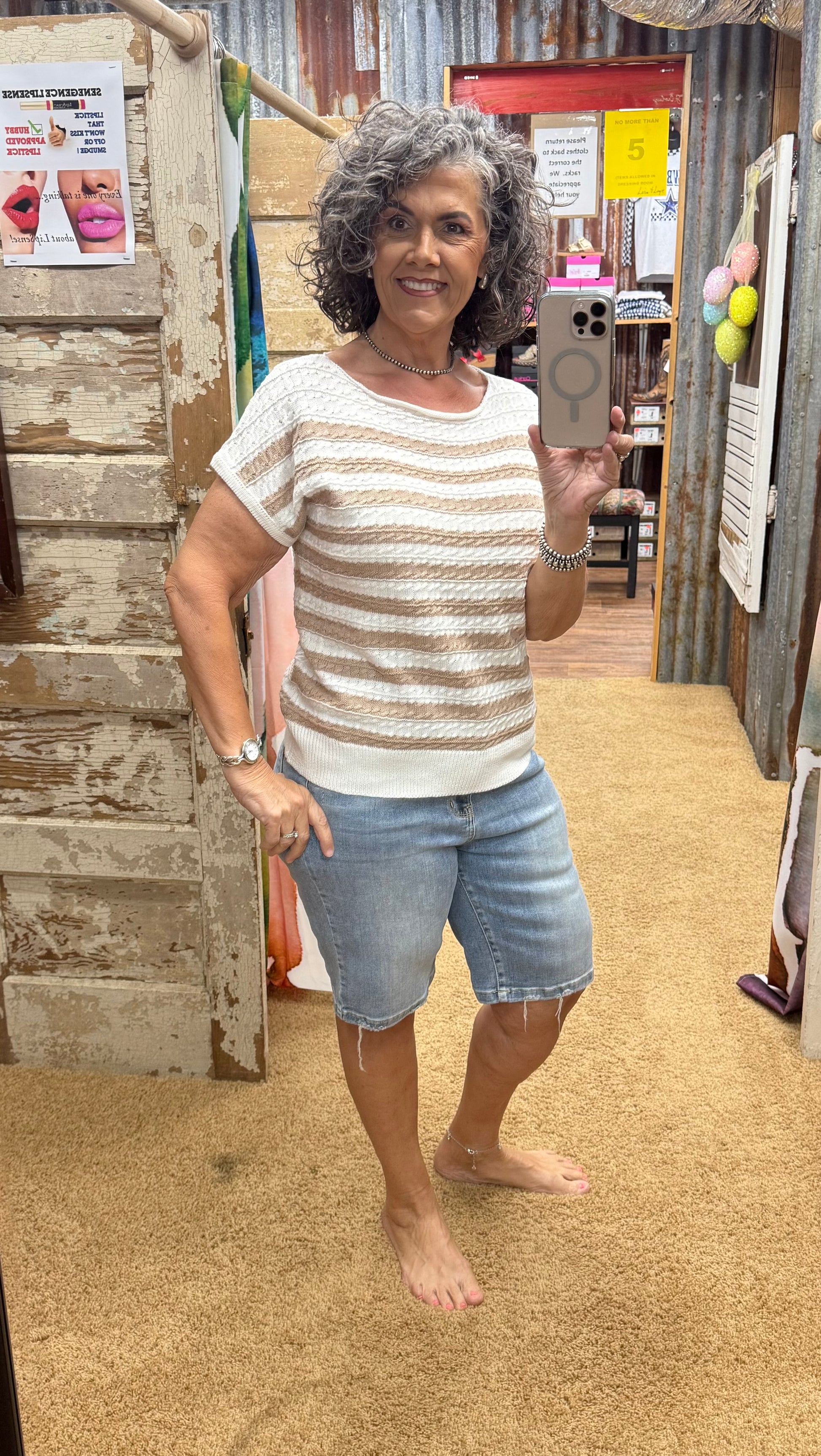 Get ready to embrace summer with our Ivory/Taupe Cable Knit Sweater! The cable knit design adds a unique texture and the stripes offer a playful touch. Featuring extended short sleeves and a wide crew neck, this sweater will keep you cool and fashionable all season long.