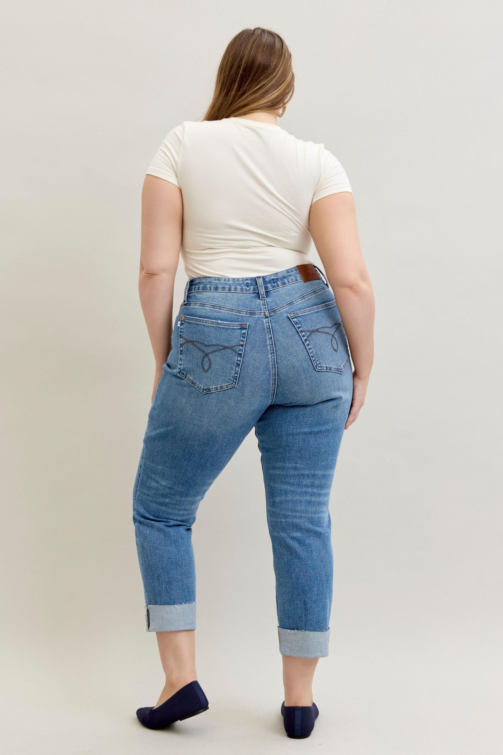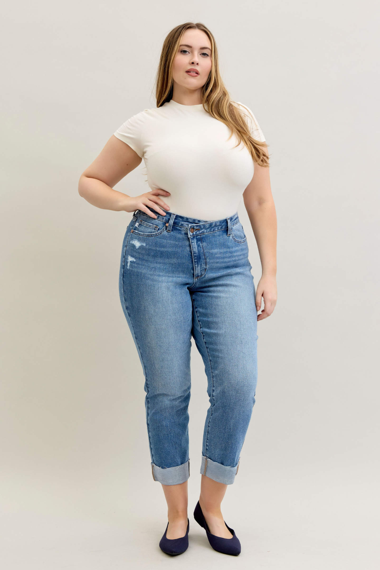Judy Blue HW BF Criss-Cross Mild Destroy Single Cuff Jeans 881003