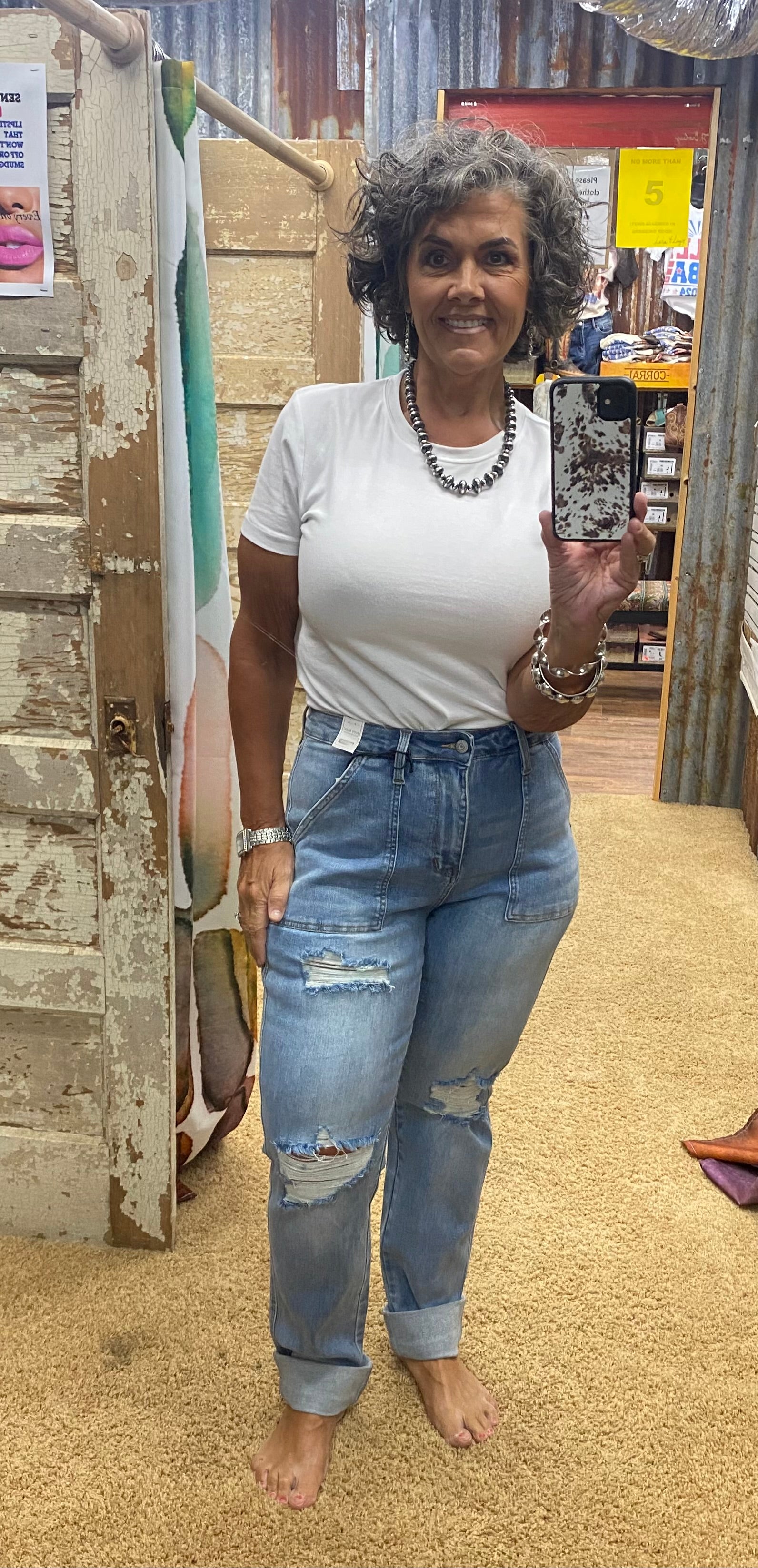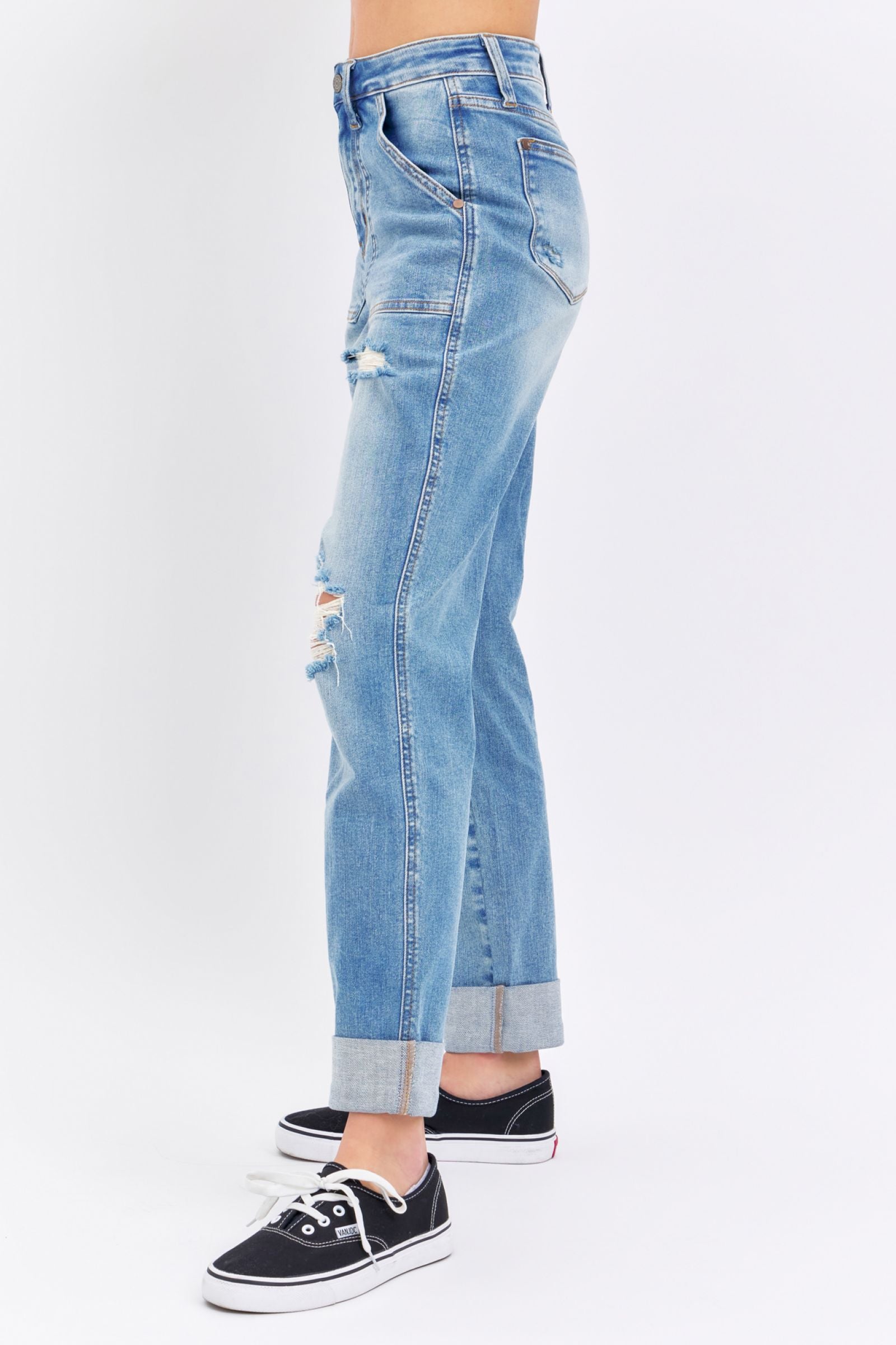 Introducing the ultimate denim must-have: Judy Blue High Waist Patch Pocket Destroyed Boyfriend Jean! Made from a soft and comfortable blend of cotton, polyester, and spandex, these jeans feature a high waist, patch pockets, and a distressed "boyfriend" style. With a versatile cuffed or uncuffed inseam, these jeans are perfect for any casual occasion. These are versatile in how you can wear them - either cuffed (29" inseam) or uncuffed (34" inseam with clean, finished hem).