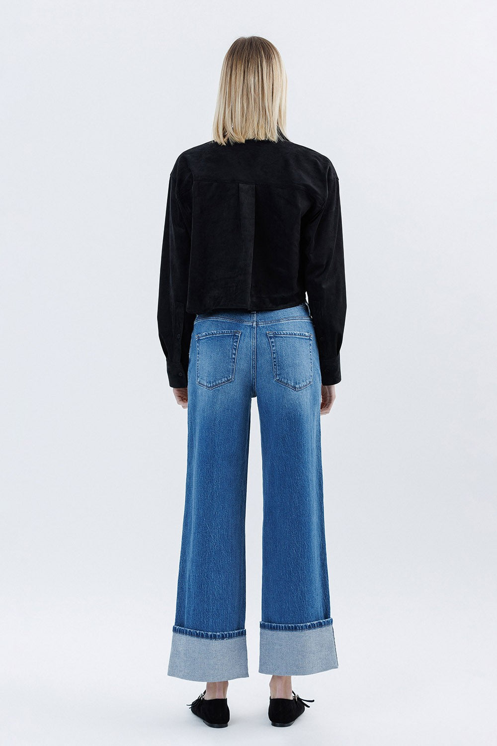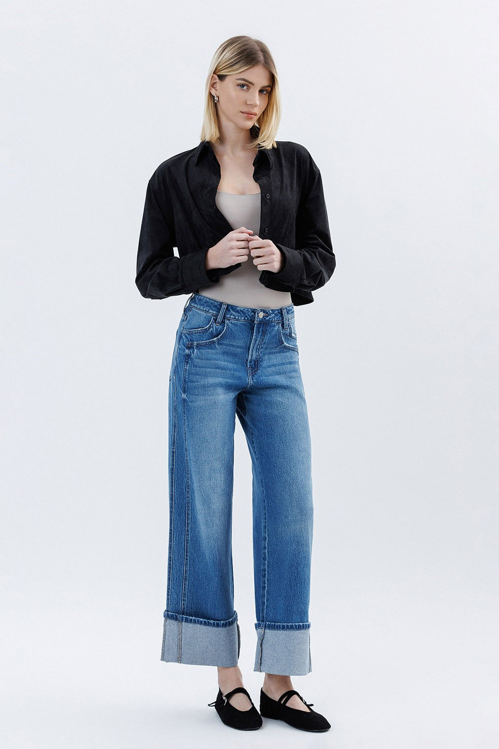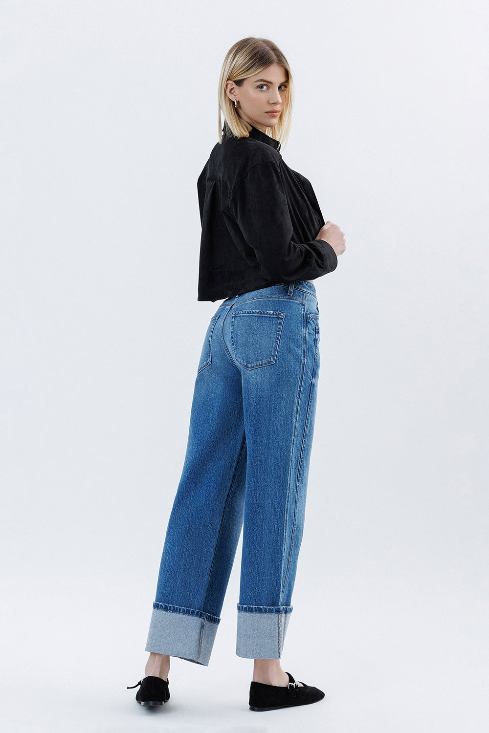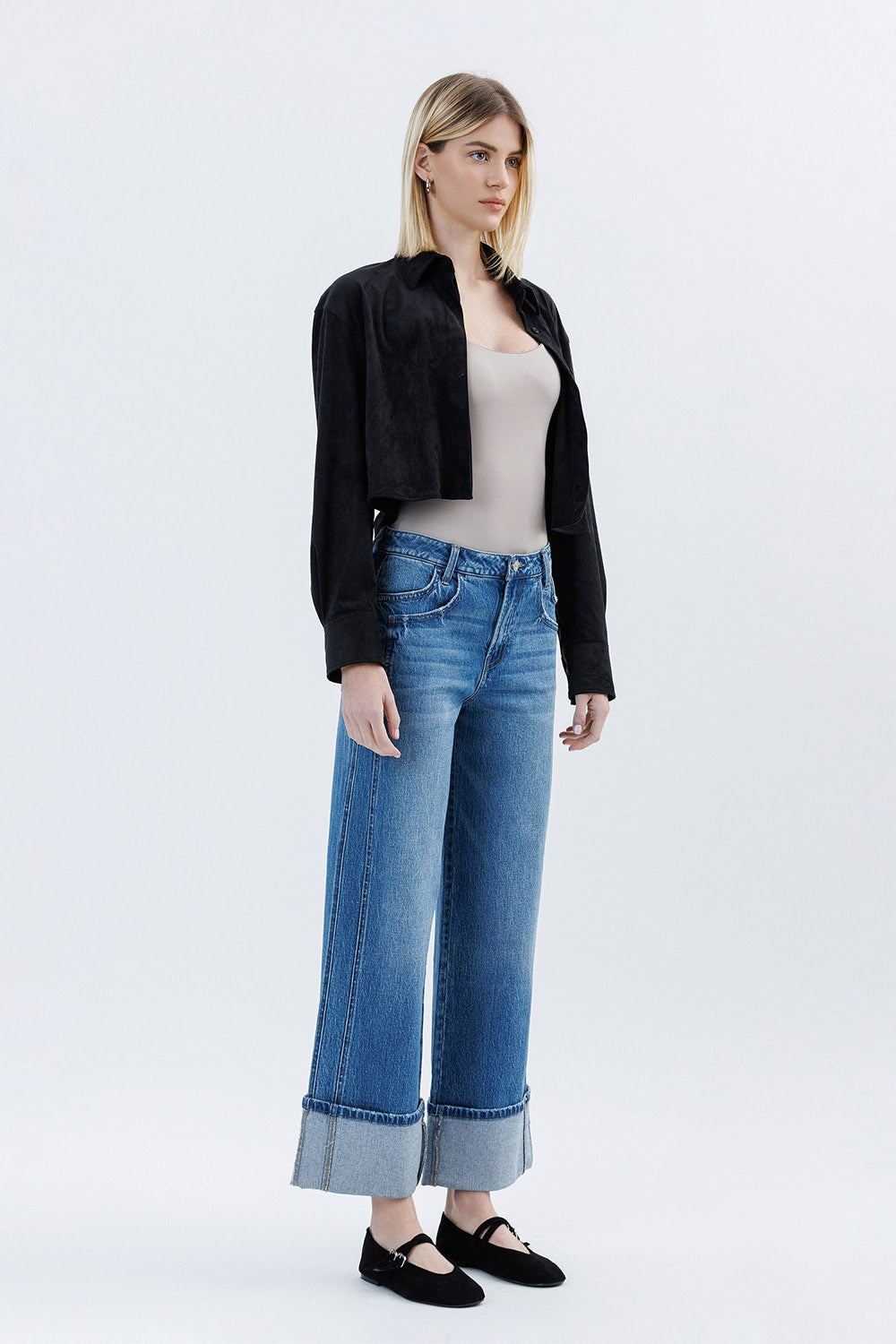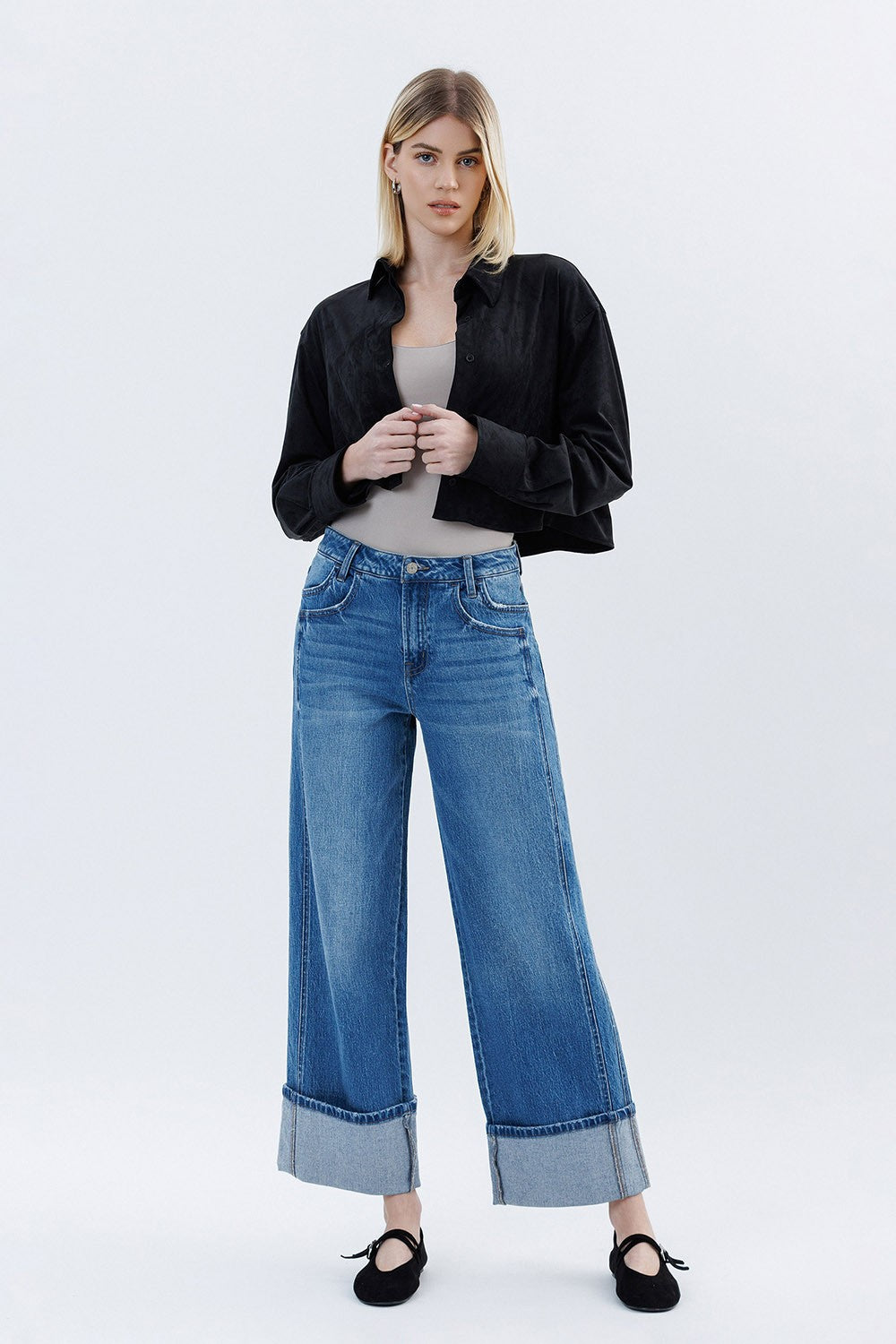 KRIS Jeans by Vervet Flying Monkey redefine bold with their super high-rise waist and baggy wide-leg design. Crafted from comfort stretch denim, these ankle-length jeans feature a single cuff hem for an edgy finish. With an 11" front rise, 28" inseam, and a 21" leg opening, they offer a striking silhouette that commands attention while ensuring all-day comfort. Make a fearless statement in these standout jeans.