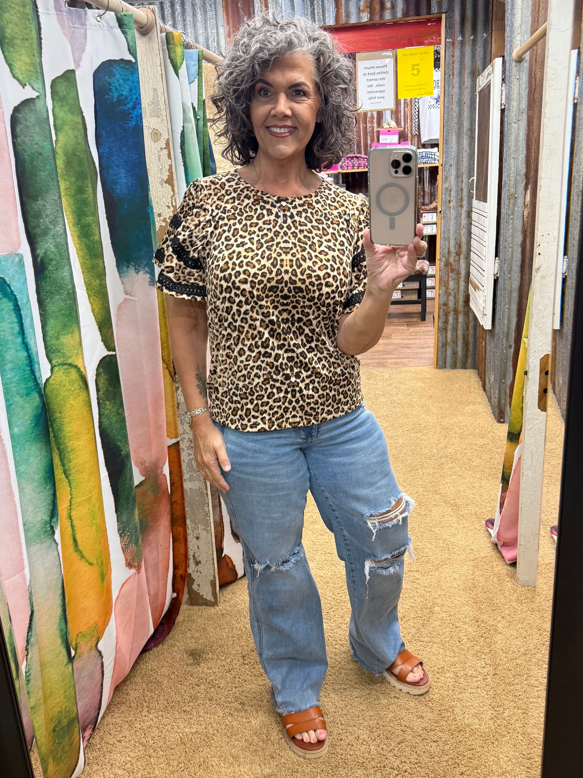 Unleash your wild side with our Leopard Crochet Top! Made with a soft jersey fabric, this top features a playful crochet trim and shirred sleeves for a flirty touch. Perfect for adding a bold pop of print to your wardrobe. (Sorry, leopard print puns not included.)