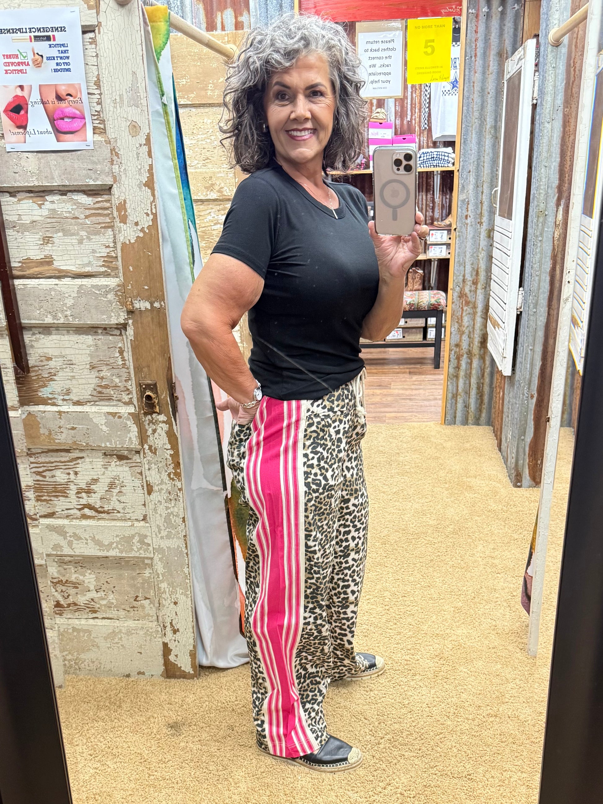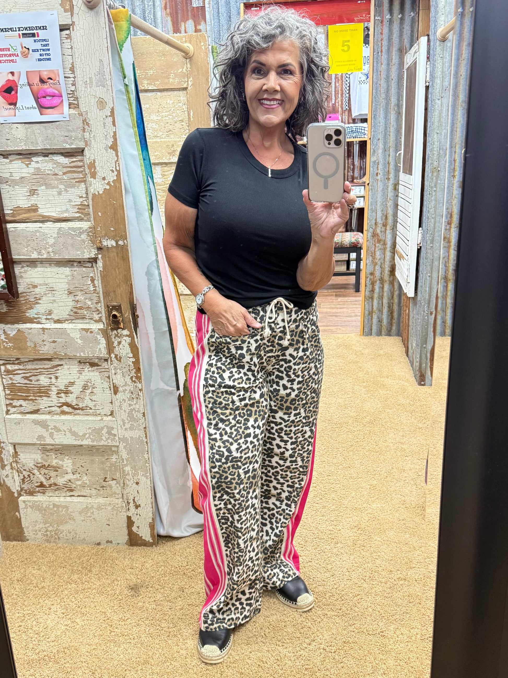 Turn heads in these bold Leopard Print Side Contrast Wide Pants! With their striking design and elongating side panels, they make a statement while offering comfort with a flowy, wide-leg silhouette. Perfect for a playful yet sophisticated look, pair them with a fitted top or cropped sweater. Rawr!