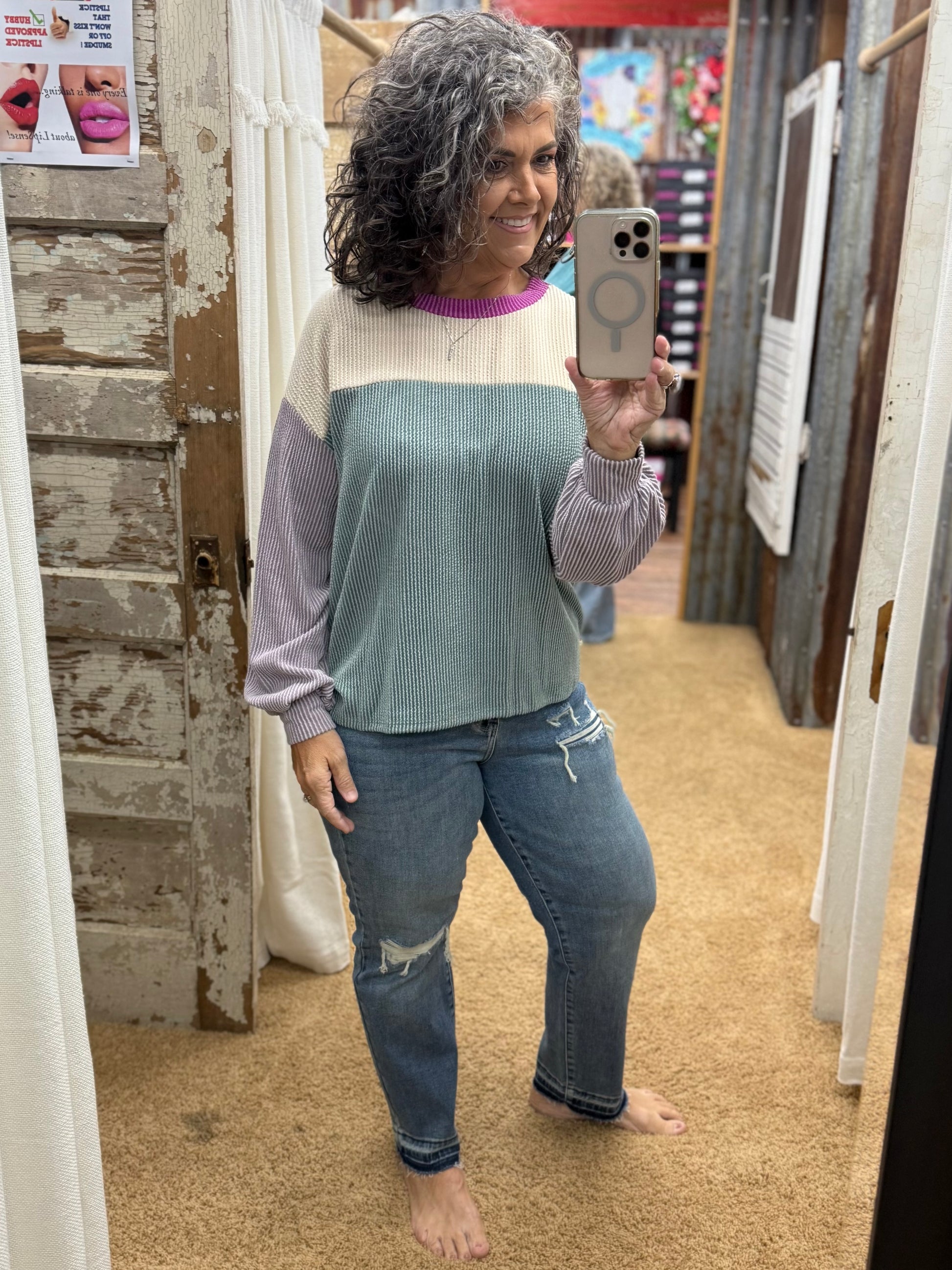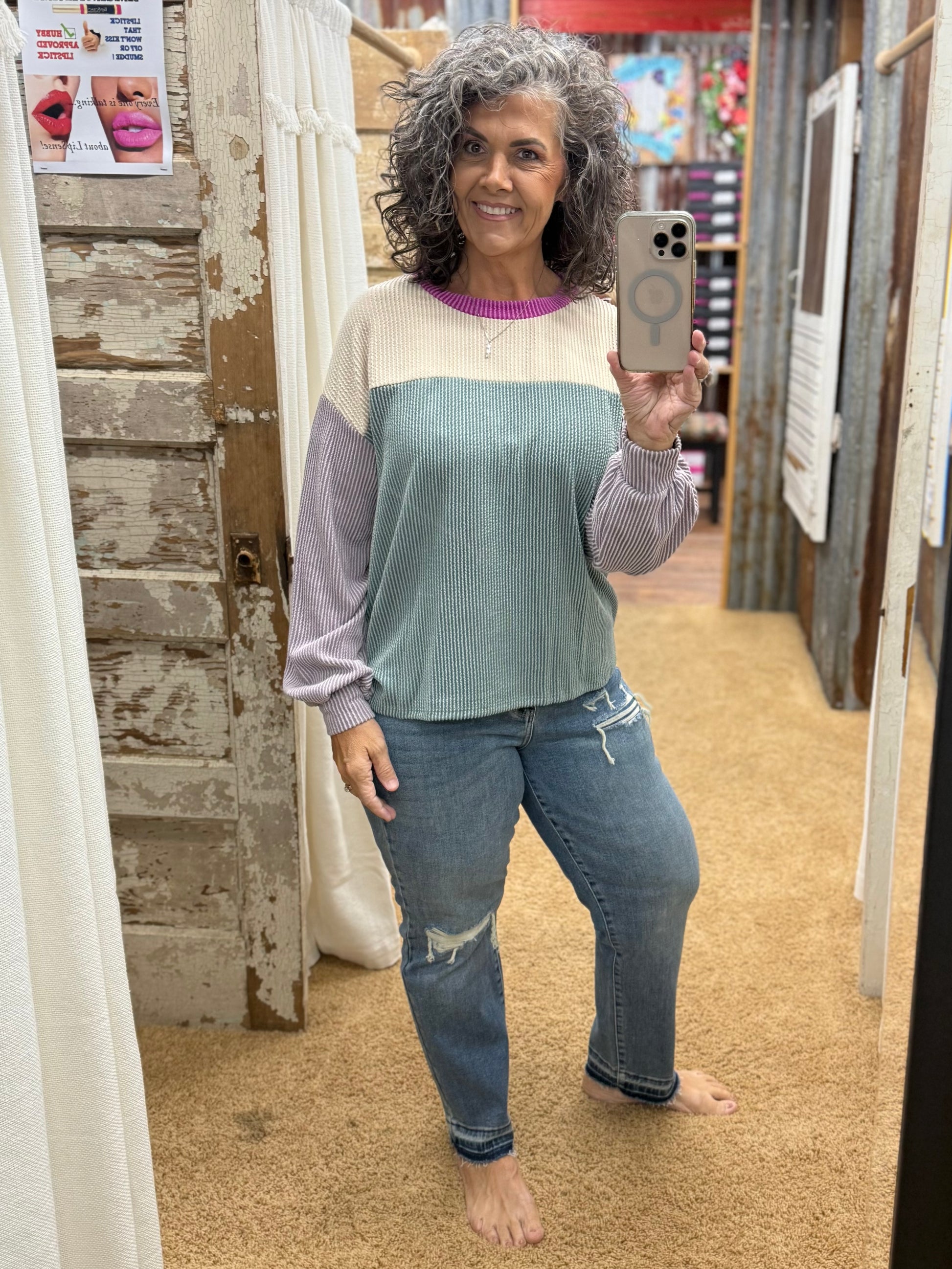 Add a pop of playful style with the Long Sleeve Urban Ribbed Moss & Lavender Shirt. This mix-and-match color block sweatshirt features cozy cuffed sleeves and a comfortable round neckline. Made from soft ribbed poly-rayon fabric, it’s perfect for layering or wearing solo when you want to stand out with a splash of color.