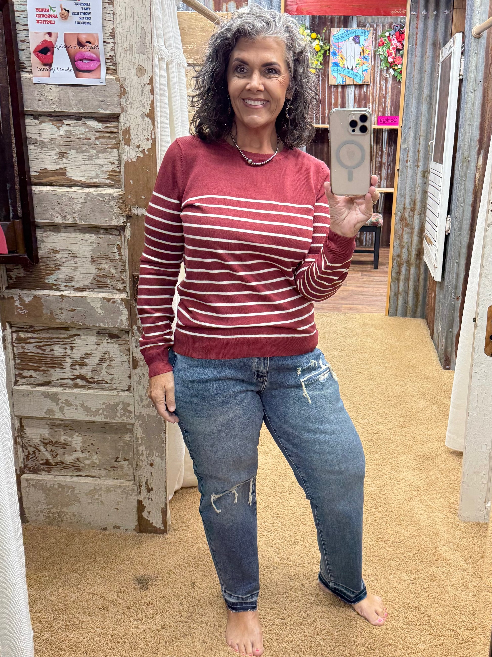 Make a bold statement with this Marsala Sweater, featuring striking block stripes and a classic crew neck. Its long sleeves and pullover design offer both comfort and style, perfect for those who dare to stand out in any crowd.