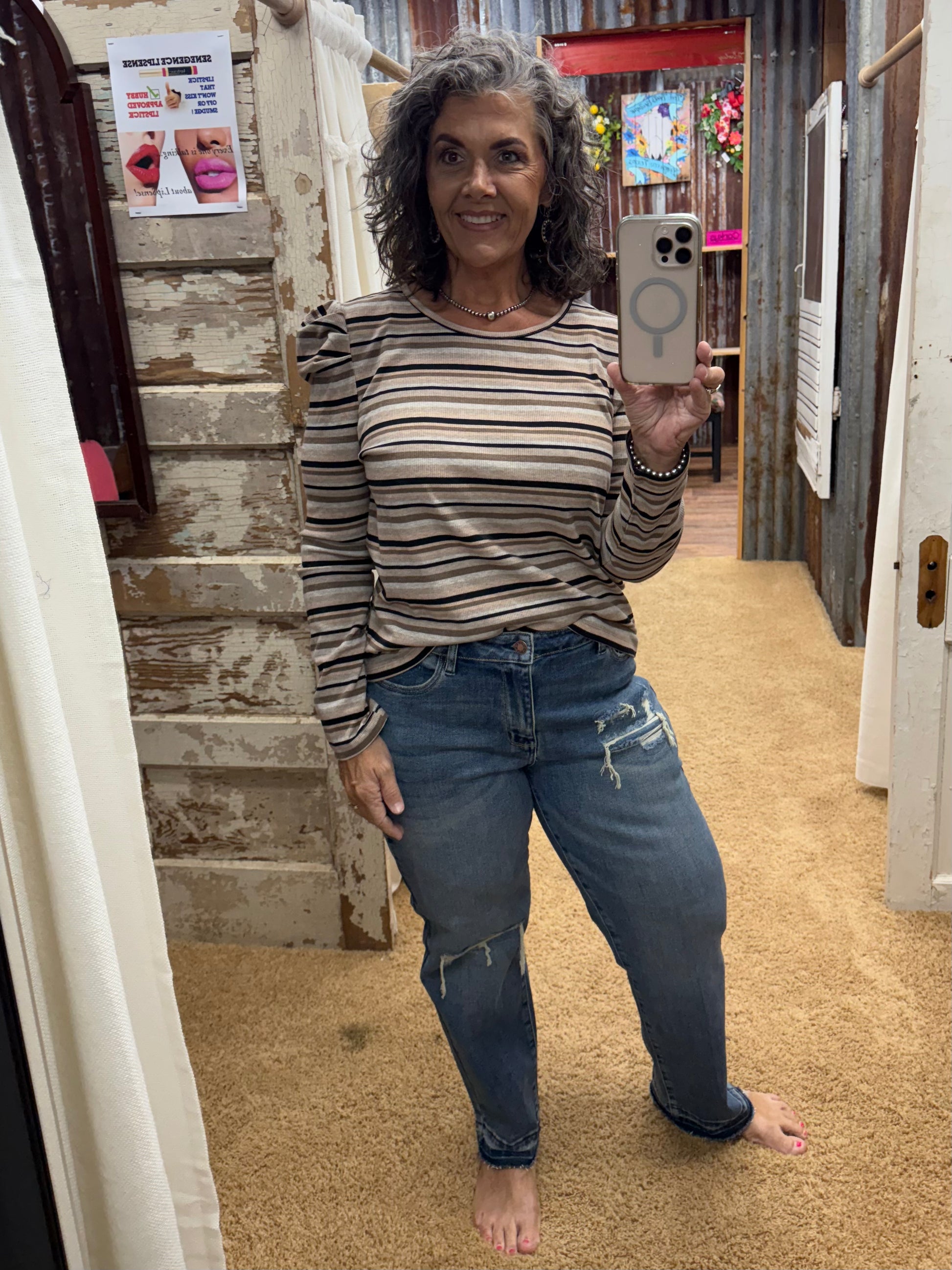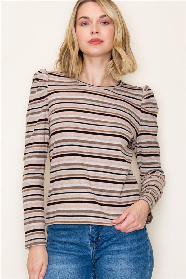 Make a bold statement with this Mocha/Black Knit Top featuring daring striped patterns and dramatic puffed long sleeves. Its pullover design combines comfort with eye-catching style, perfect for standing out in any crowd.