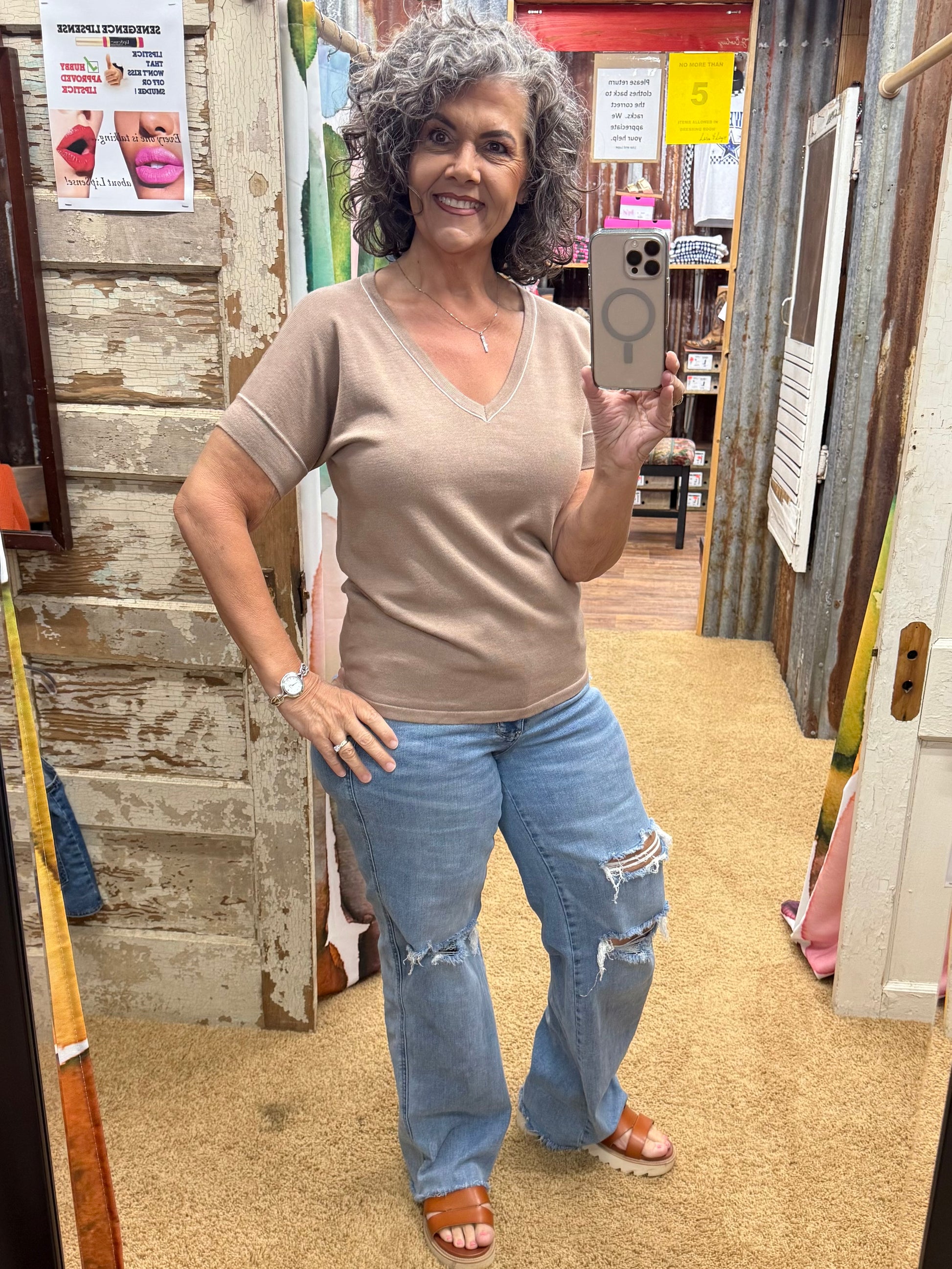 Get ready to look extra stylish this summer with our Mocha Summer Sweater! Featuring a trendy V neck, contrast stitching details, and short sleeves, this solid sweater is the perfect addition to your wardrobe. Stay cool and chic all season long.
