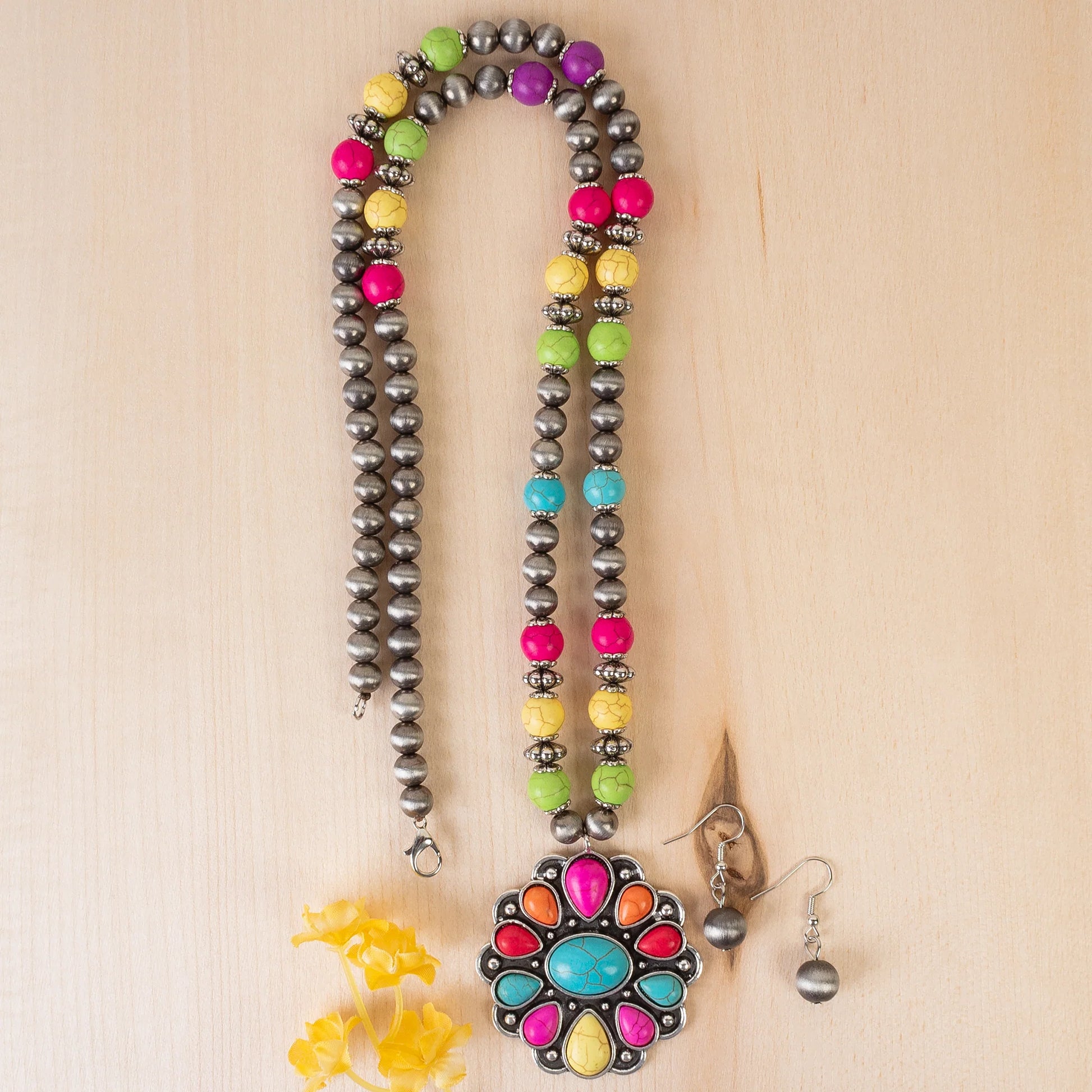 Add a touch of whimsy to your outfit with our Multi Squash Blossom Necklace & Bracelet Set! Featuring turquoise stone details and a beaded chain, this set includes a 26" necklace, matching fish hook earrings, and stackable bracelets. Each piece showcases natural cut turquoise stones for a unique look. With a rectangular pendant and stretch fit, it's one size fits all. Go ahead, make a statement!
