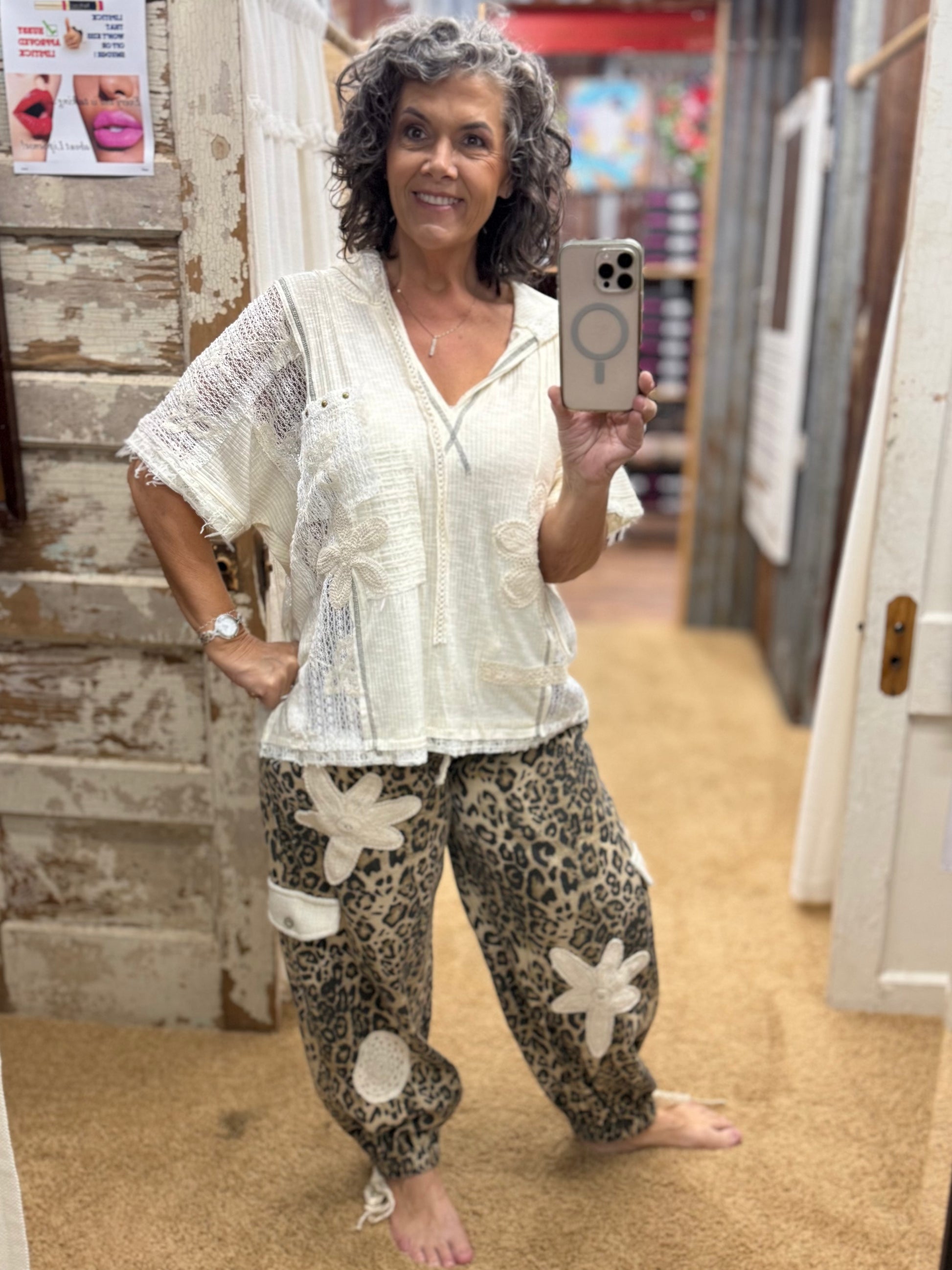 Embrace cozy style with our Natural V-Neck Hoodie, featuring a relaxed ribbed fit and delicate lace detailing in a pointed solid pattern. Perfectly playful and comfy, it pairs effortlessly with our leopard and POL pants to keep your look fun and fresh all day long.