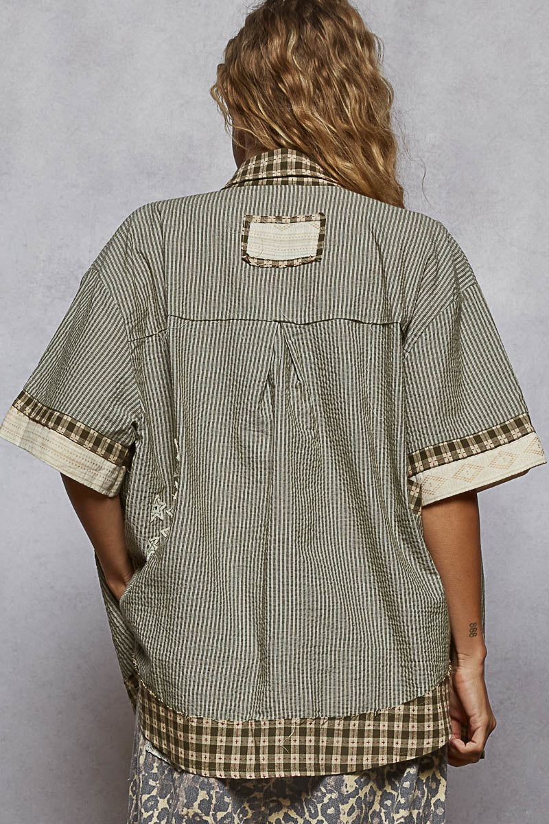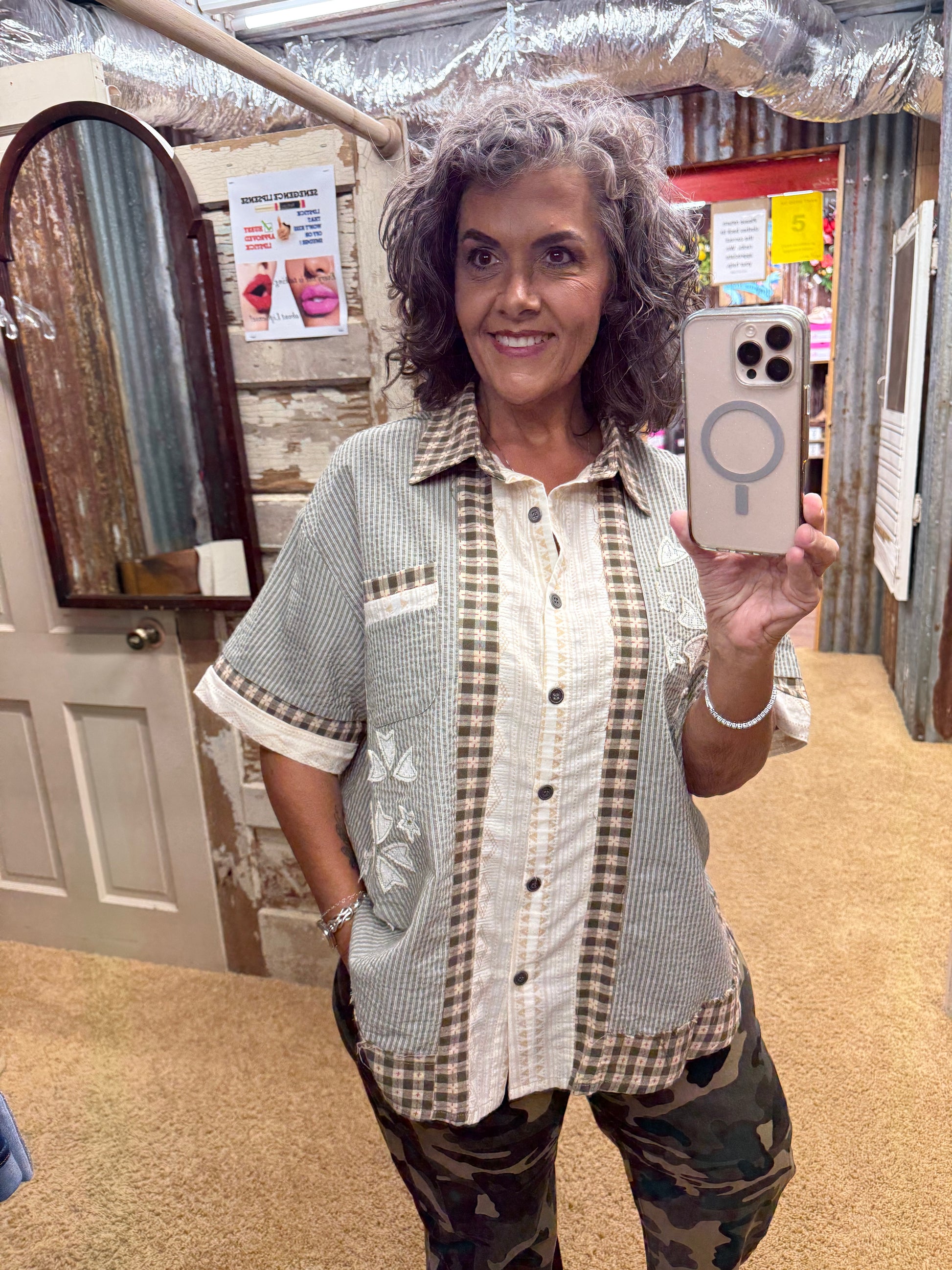 Designed in short sleeve roomy fit shirt in printed woven with varied textured and printed woven patchwork, a chest and side patch pocket, floral patch accents, and a back pleat detail.