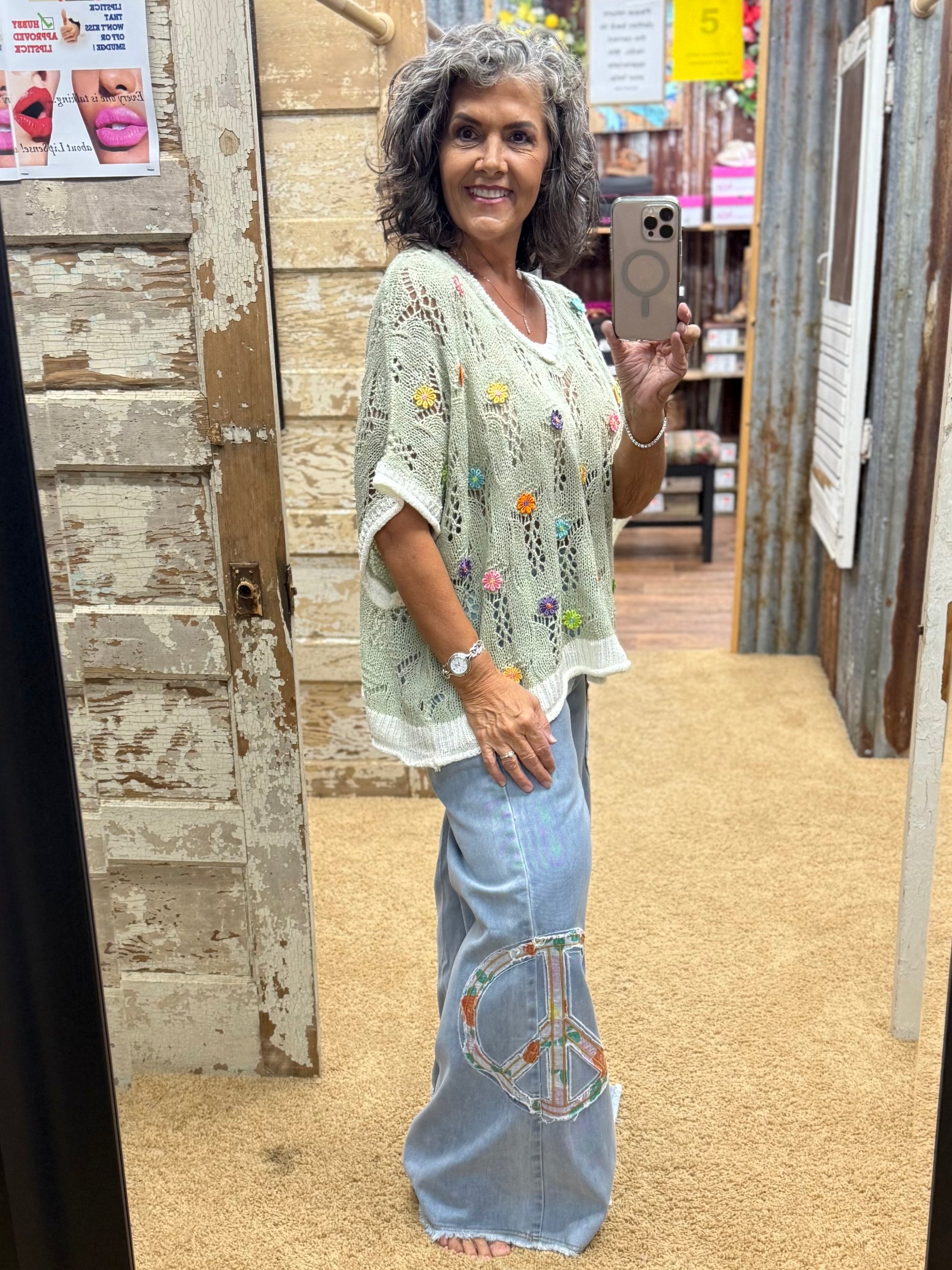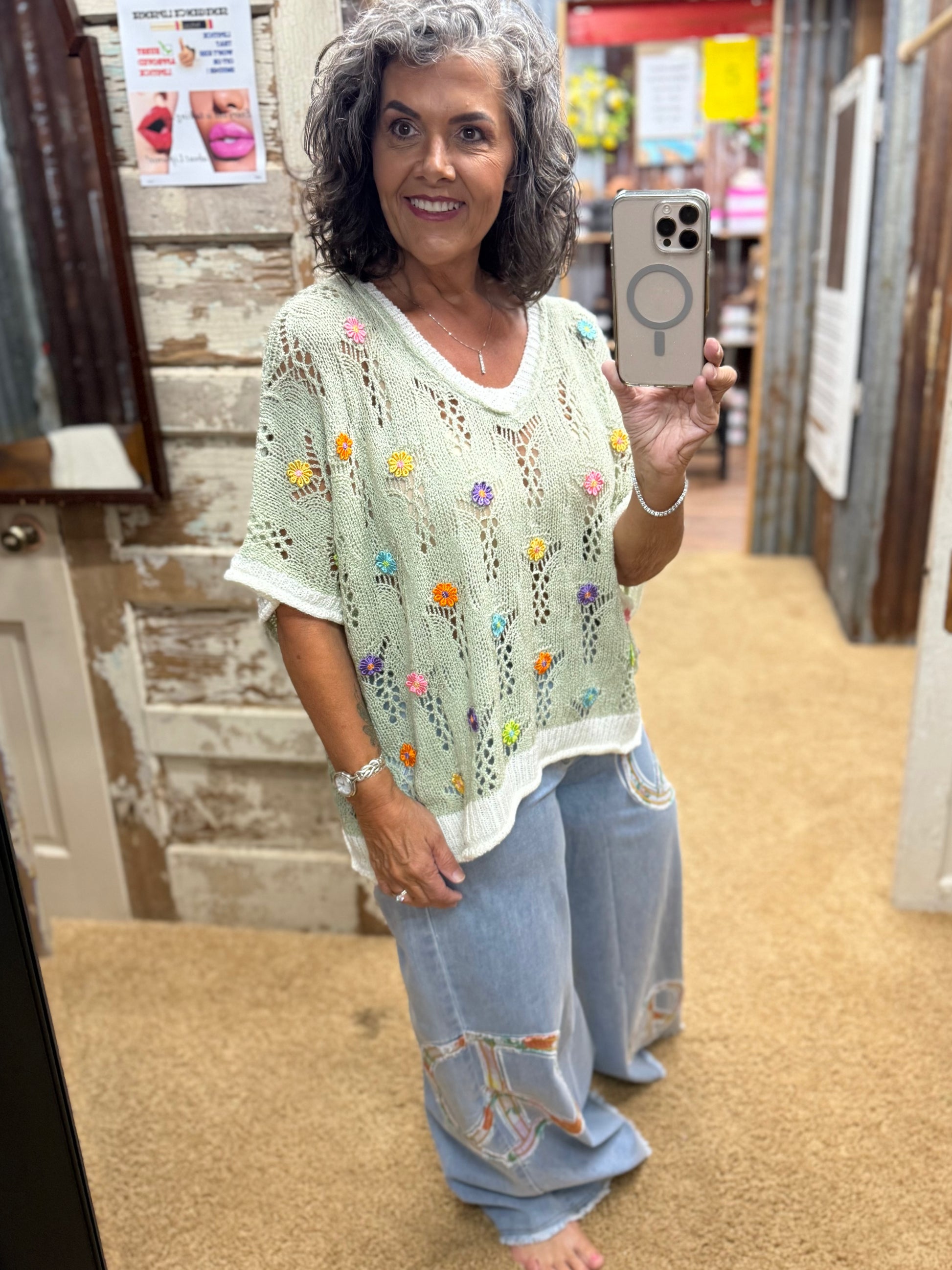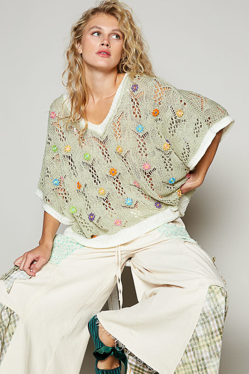 Designed in V-neck sleeveless sweater top in acrylic with flower point, outseam and rolling edge, color blocked band point, solid color (The flower color is random).