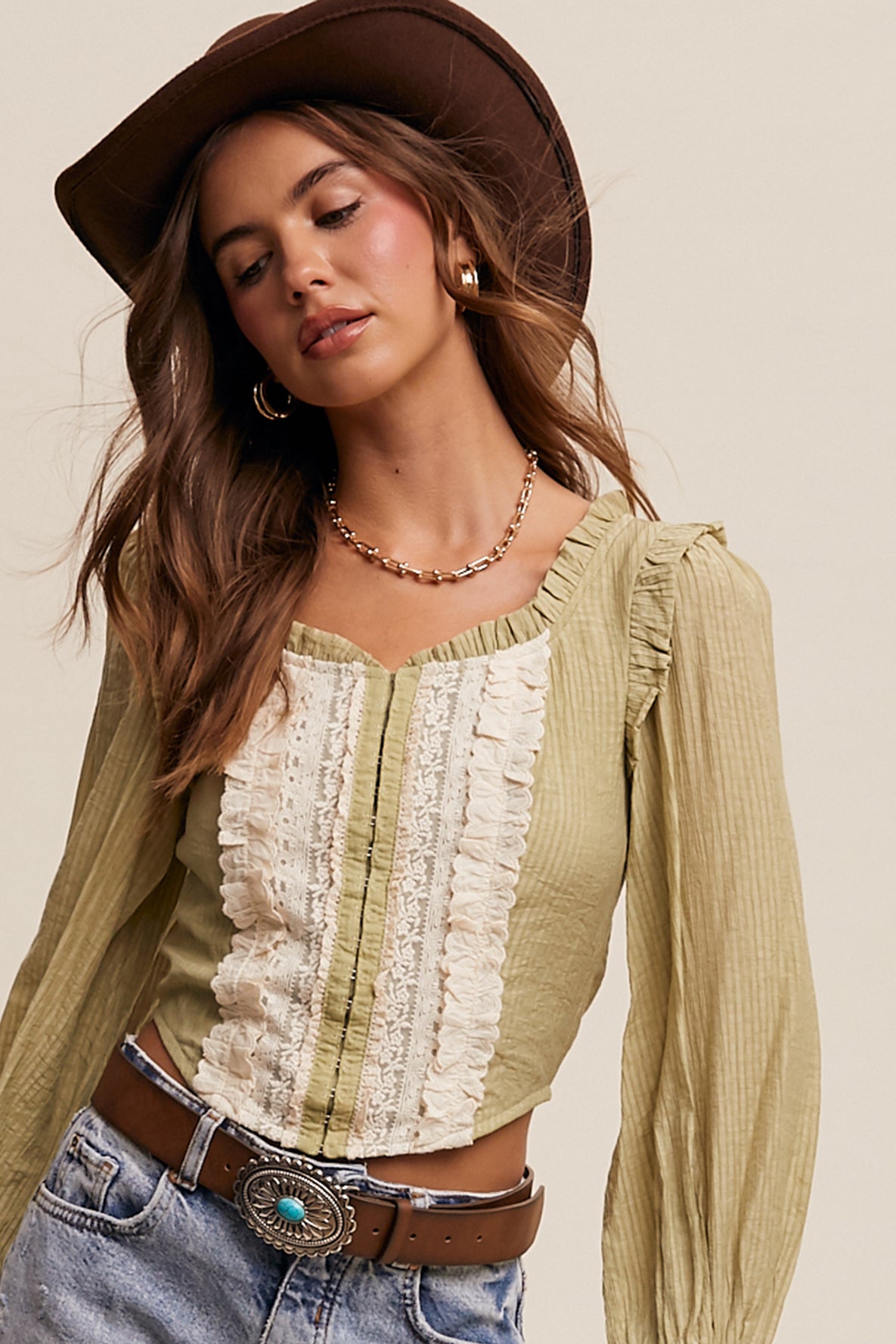 Get ready to turn heads in our Olive Ruffled Smocked Long Sleeve Blouse! The lightweight textured fabric provides both vintage charm and breathable comfort, while the feminine ruffle accents and delicate lace paneling add a romantic touch. The smocked back ensures a snug yet flexible fit, and the billowy sleeves with smocked cuffs create a flattering silhouette. Tailored at the waist, this blouse is perfect for adding a touch of chic femininity to any outfit.