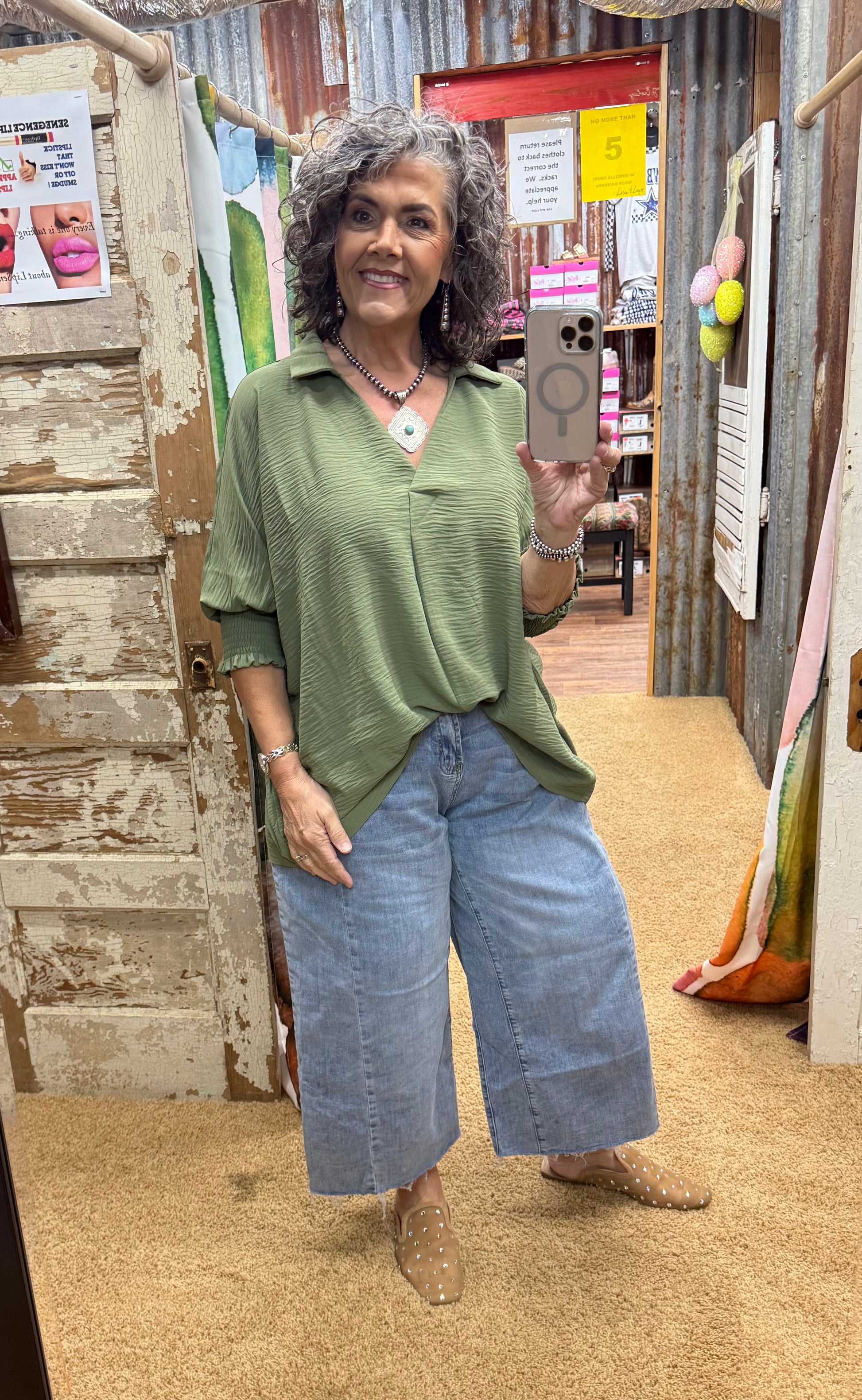 Stay cool and stylish with our Olive Smocked Sleeve Top. Featuring an airflow collar, v-neckline, and smocked sleeve bands, this 100% polyester top will keep you comfortable while looking effortlessly chic. Perfect for any occasion, from work to play. (No wonder it's our best-seller!)