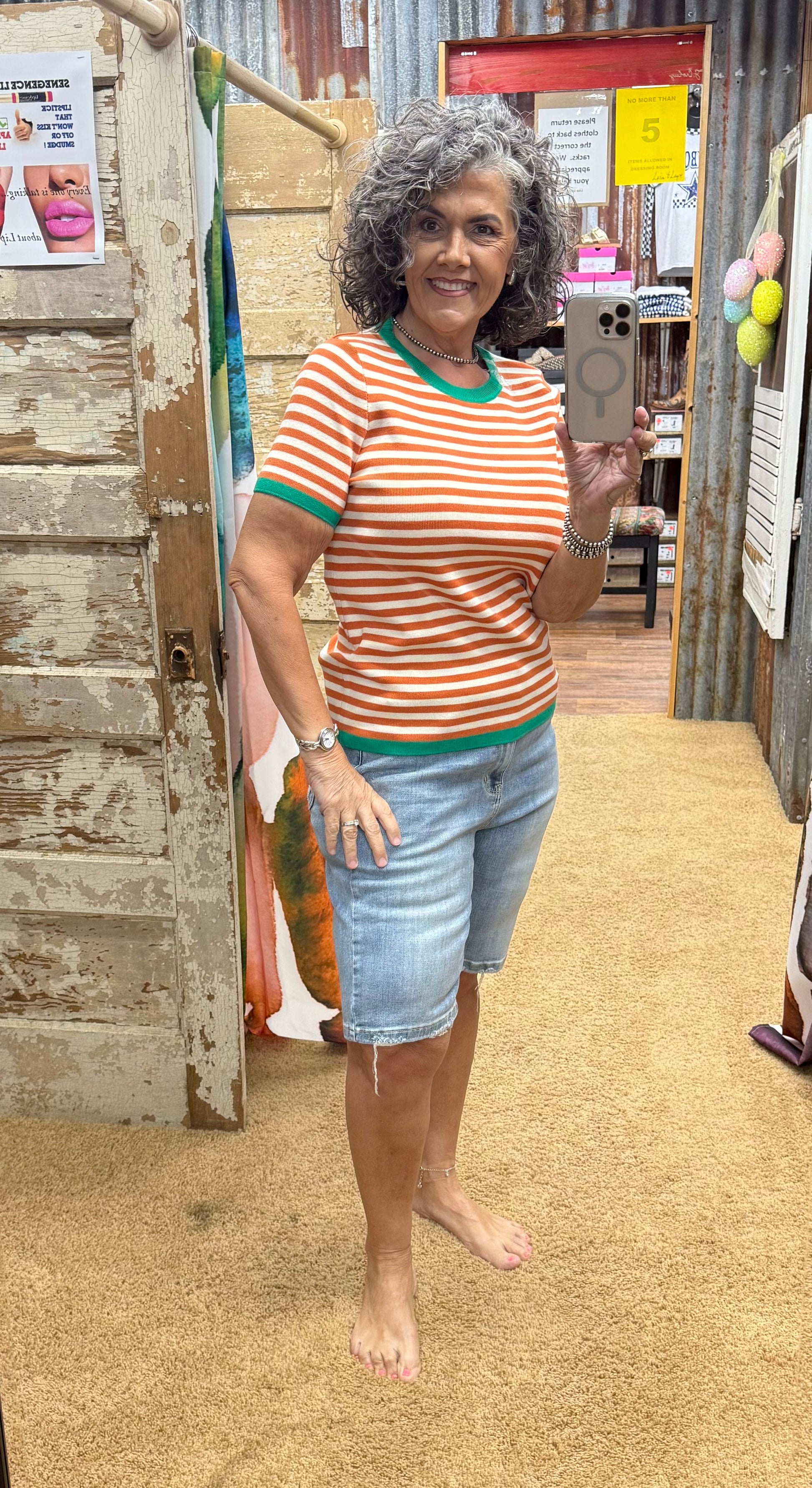 Get ready for summer with the Orange You Glad Its Summer Top! This striped pullover sweater features a pop of color trimmed crew neck and short sleeves. Stay cool and stylish with this playful and quirky top.