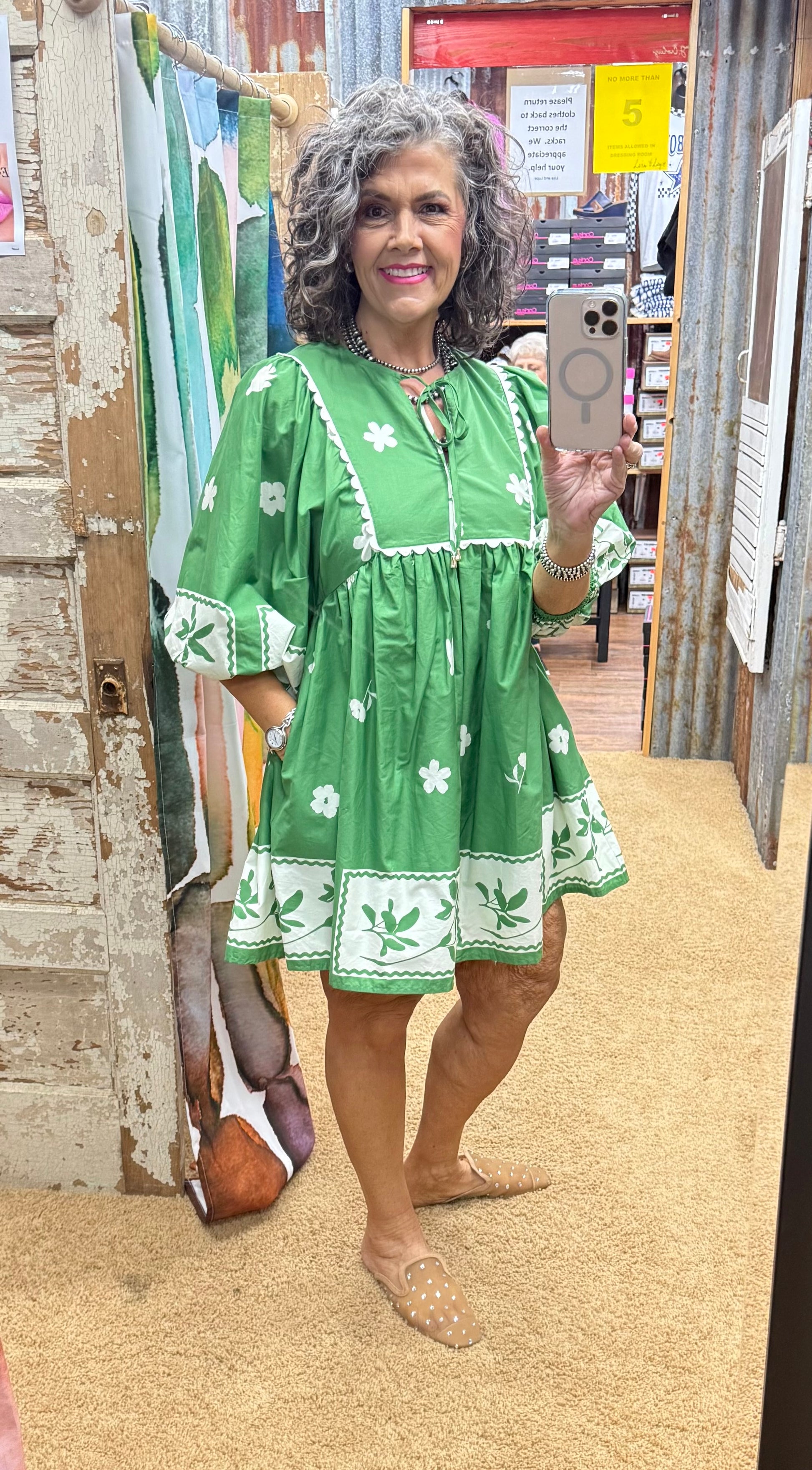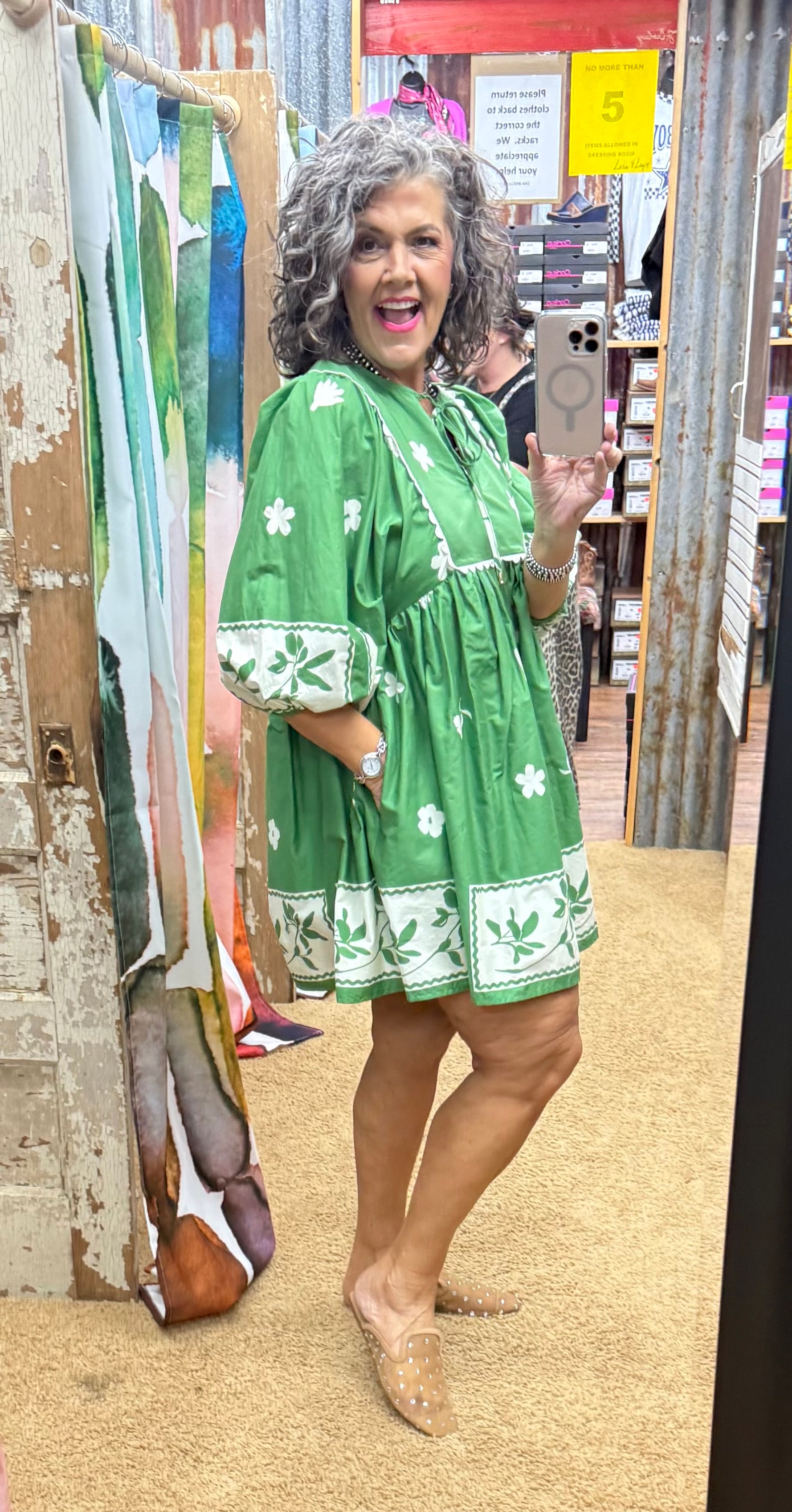 Get lucky with our My Lucky Day Dress! This mini dress features a beautiful floral stencil border print and scallop accent yoke. The elasticated ¾ sleeves and lightweight, non-sheer fabric make it perfect for any occasion. Stay comfortable and stylish in this lined, woven dress.
